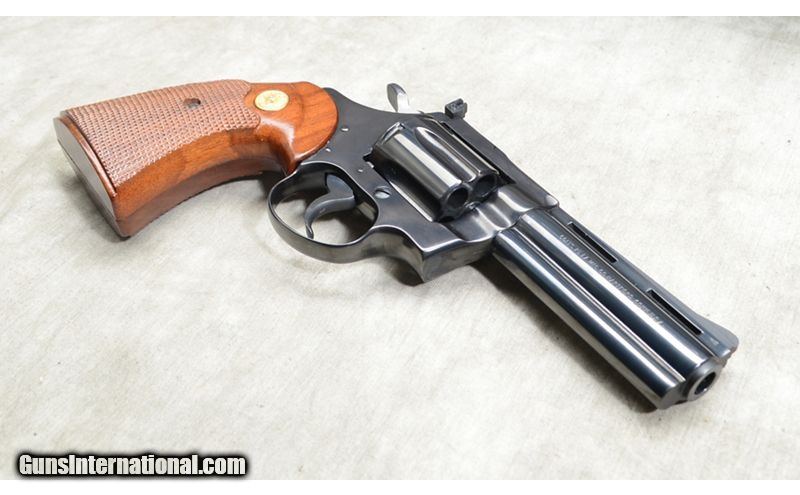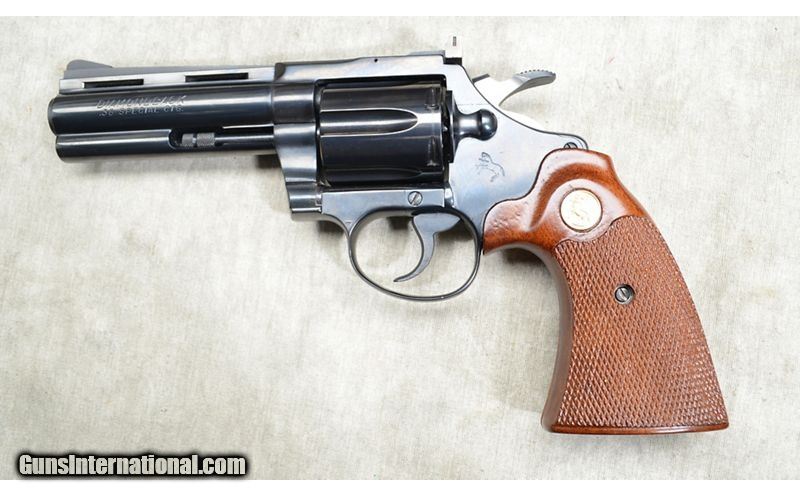 Description: One of the desirable 'snake' guns featuring walnut stocks with fine pitch checkering, 4-inch barrel and double/single action trigger. YOM is 1976. .38 Special SOLD Chambers: 6 Metal Condition: Excellent. Very light tan line. Wood Condition: Excellent. Bore Condition: Shiny and bright. Barrels: 4-inch Triggers: Factory single and double action trigger. Butt Pad: Checkered walnut. Weight: 29 oz. Sights: Serrated ramp and target type adjustable notch. Item Location: Rogers |
