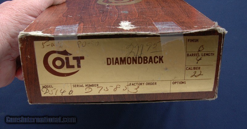 Description: Beautiful Little Colt Diamondback here. In the box with everything except maybe the plastic bag it may have been wrapped in. Manual, warranty, hang tag, tool, "Handling the Handgun". Does not appear to have been fired. A real beauty in a desirable caliber and barrel length. $35 shipping to the lower 48, 3% surcharge for using a CC. If you choose to pay with a personal check, we will hold the item for up to 10 days to make sure that it clears. Please expedite such pymts as we will hold an item on your word for 5 days. SOLD Handgun Caliber: .22 Long Rifle |