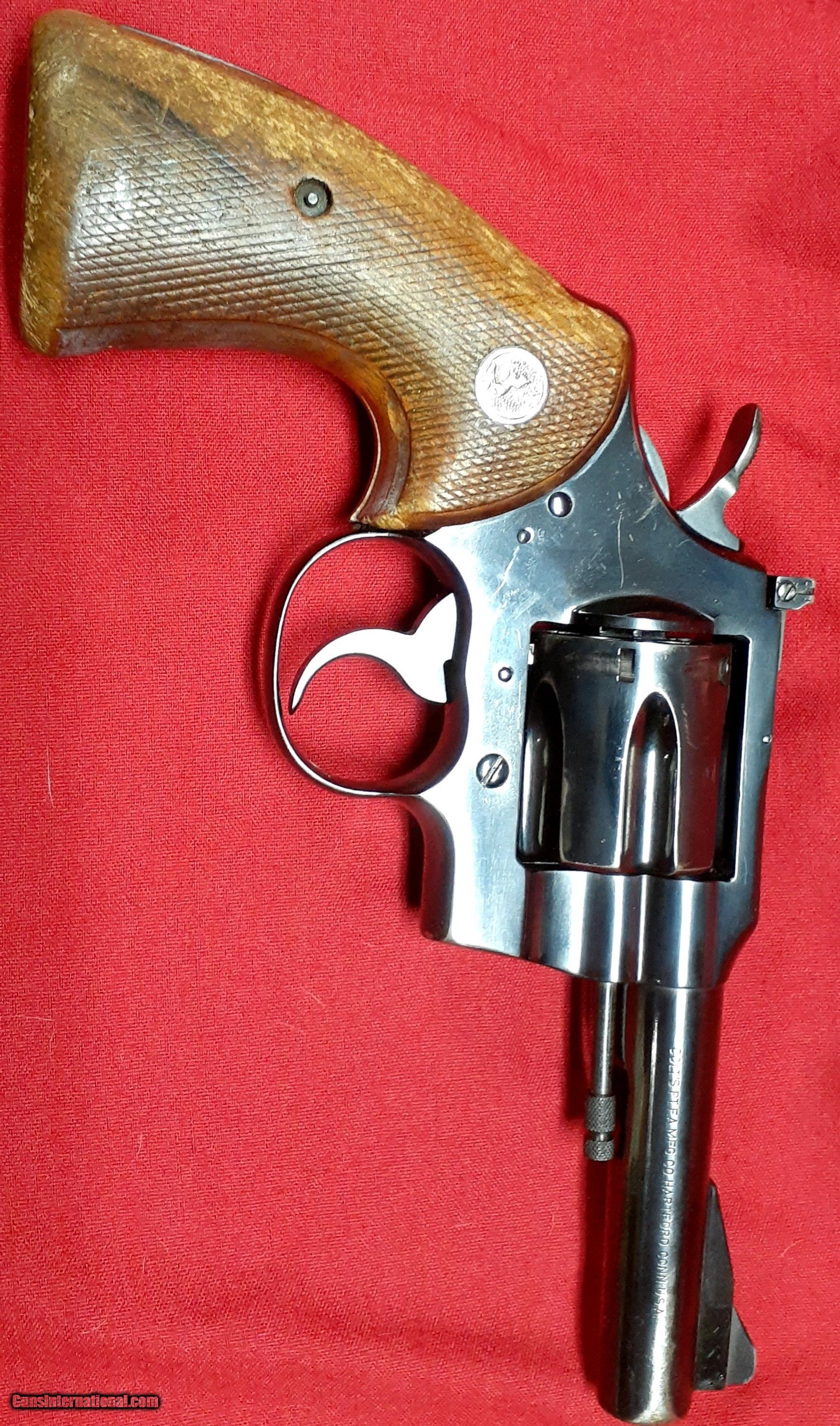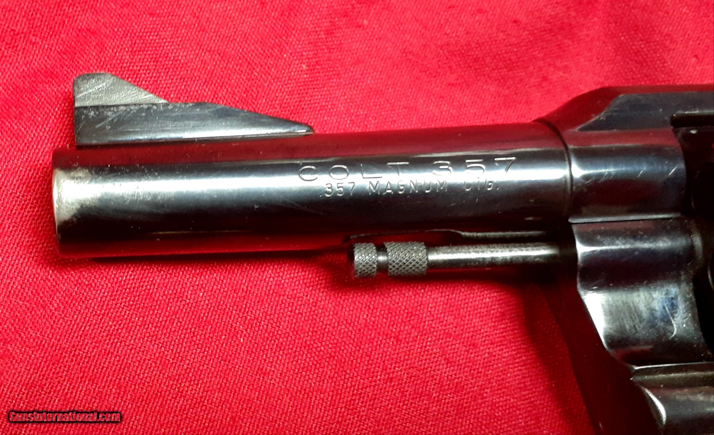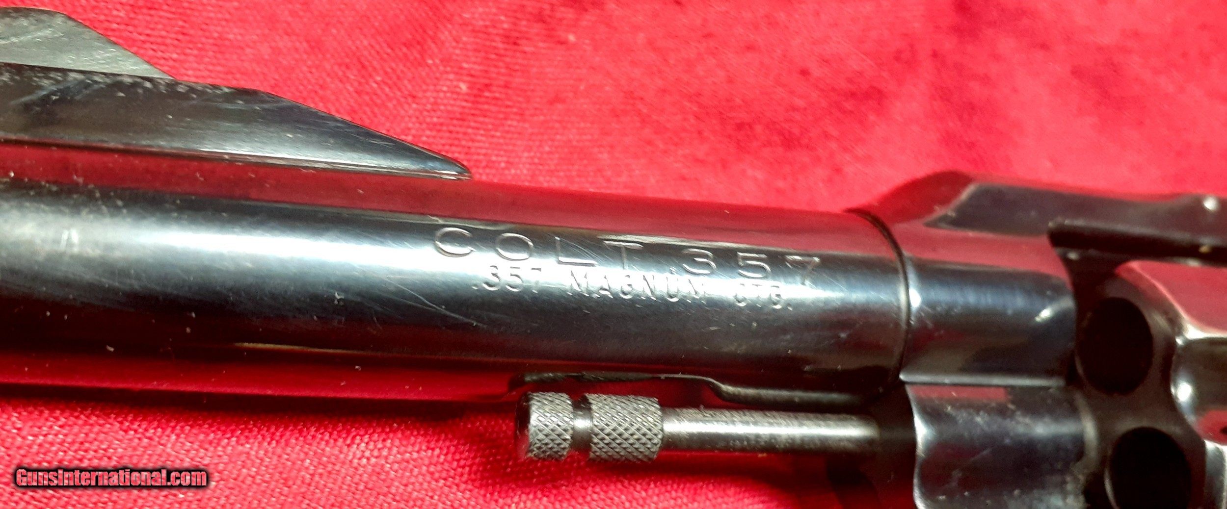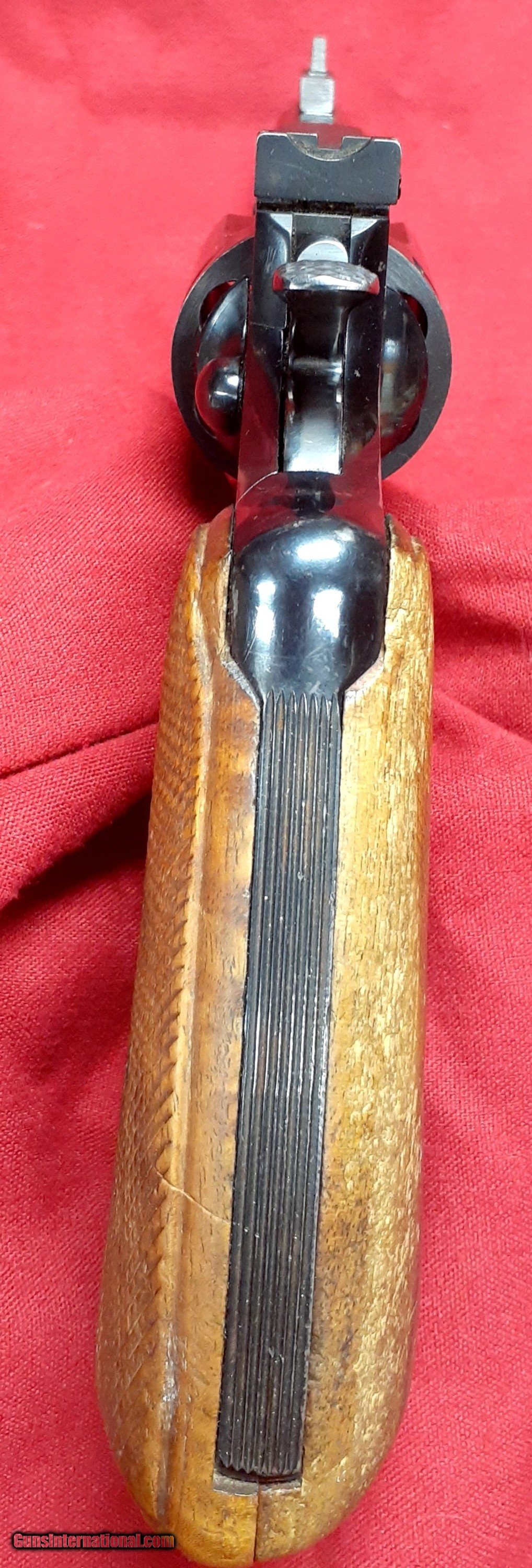 Description: This is a spectacular all-original example of the very scarce Colt Model .357 Magnum revolver. This low-production double-action revolver was only manufactured between 1953 and 1961 (this gun was manufactured in 1959) , with a total number of about 15,000 guns made before being absorbed into the Trooper line of revolvers. The .357 Magnum model was offered with either a 4" or 6" inch barrel, a gloss-blue or nickel finish, a standard or wide hammer, and standard or target grips. This heavy duty double-action/single action revolver was chambered in .357 Magnum only and featured a 6-shot fluted cylinder and an Accro adjustable rear target sight with a ramped front blade. These vintage Colt's were extremely well-made guns with excellent fit and finish and quickly earned a reputation with shooters for being very accurate and reliable guns. This gun also features the first type target grips with silver medalions (original) SOLD Curio/Relic: Yes Handgun Caliber: .357 Magnum Manufacturer: Colt Model: .357 MAGNUM Serial Number: 19191 Barrel Length: 4 Bore: Excellent Chambers: Excellent Condition: Excellent Metal Condition: Good Wood Condition: Fair Bore Condition: Excellent Action: Double Finish: Black Sights: Accro Manufacture Date: 1959 |