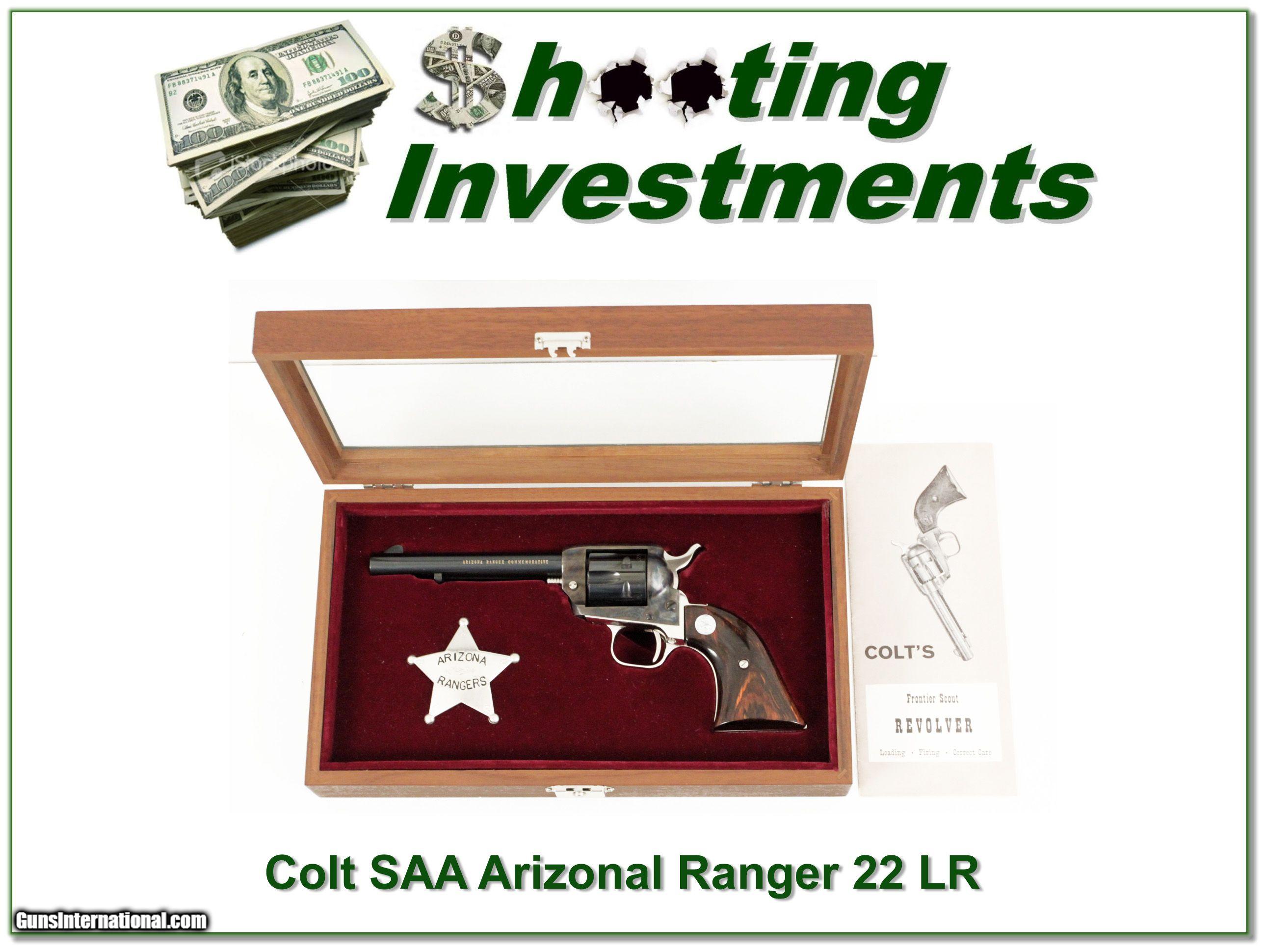 Description: This is a new in the case Colt Arizona Ranger Commemorative. It is a 22LR and will make a nice addition to any collection. I am selling this one on consignment and as such lay-a-way can’t be used. It does of course have the standard 3-day inspection. Shipping and insurance is $29. Please email me with any questions or larger pictures. (Consign your quality firearms with Shooting Investments for only 10%! Let me know if you have any you would like to sell!) 17-0695 Payment: Payment is by Money Order, Cashiers Check or Personal Check. I can now also accept MasterCard and Visa with a 3% convenience fee. PayPal can be used for some items but never firearms. Please let us know if you would like to pay via PayPal. Shipping: The shipping charge will be listed in each description. It is $39 for most long guns and $29 for most handguns. Some heavy guns or those insured for over $2000 will be higher. Shipments to Alaska and Hawaii are higher because air shipment is required. Most firearms are shipped on Tuesday and Thursday and usually in 5 days of receipt of payment. We package all shipments carefully and insure them. For long guns you can purchase a new Plano case for $19. They now cost us $22 when buying 100 at a time. Optics are shipped Priority Mail and most other non-firearm shipments are shipped First Class. Returns: Our return policy is simple. If for any reason you are not pleased with your purchase, you may return your item for a full refund of purchase price. Ammunition cannot be returned. It is important to us that you are happy. Guns cannot be fired or dissembled before returning them and they must be returned in the same condition as received. Notification of a return must occur with-in 3 days of receipt at your dealer. Shipping, convenience and dealer fees are not refundable and are the responsibility of the buyer. Lay-a-way: If needed, we offer a 60 day lay-a-way option on most firearms. It is 1/3 now, 1/3 in 30 days and 1/3 in 60 days. Lay-a-way firearm sales are final and if not completed the first payment cannot be returned. Consigning your firearms with Shooting Investments: We will help you get top dollar for your firearms. While most local guns shops charge 20% or more, our fee is only 10% with a minimum of $75. At your local gun shop it might take months to sell. Selling on-line provides instant access to thousands of interested buyers. You won’t find any other on-line dealer willing to sell your firearms for only 10% or listing every gun on 3 separate s. Selling through an House typically costs the seller 15% and the buyer an addition 15% (so 30%) and you have to wait several months to sell and longer to receive funds. If properly priced, we will sell your firearms in a few weeks. Send us an email or give us a call and we’ll explain how easy it is for you to get top dollar. Trading: Trading for use is really just buying your gun to re-sell. If you have a gun you want to trade, please email a picture and we will let you know what we can give or it. You will always get more if we sell it for you on consignment. Help for California Buyers: We are happy to ship to California. It is the buyer’s responsibility to make sure any item you buy is legal in your state. We are also happy to help with your purchase of a firearm from someone other than us. If you see a gun you would like to buy but the seller can’t or won’t ship to California they can ship to use and we’ll then ship it to your California dealer. The cost for this service is only $30 + shipping. Let us know if we can help! SOLD |