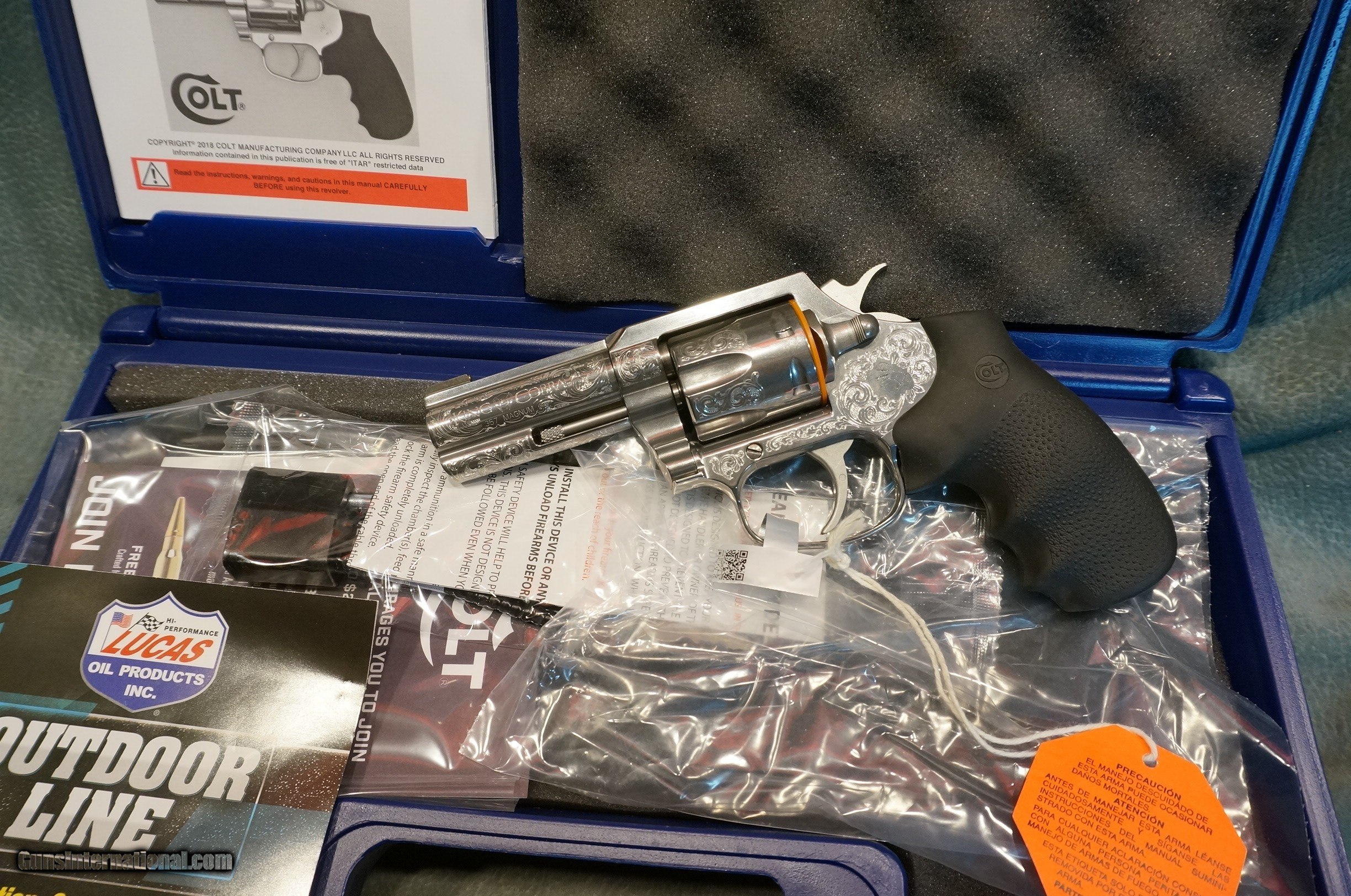 Description: Colt King Cobra 357Mag 3" barrel,stainless steel,factory scroll engraved,new in the box with papers. GUN COLLECTIONS WANTED FOR CASH! We buy, sell, consign and trade new and used firearms.We will pay finders fees and travel for large collections. This is our 46th year in business. We offer 90 day layaways with 20% down. No return on layaways. Firearms will need to be transferred through a FFL dealer. Prices reflect a cash discount. There will be 3% added to credit card sales. We trade for gold and silver. THANK YOU! SOLD |