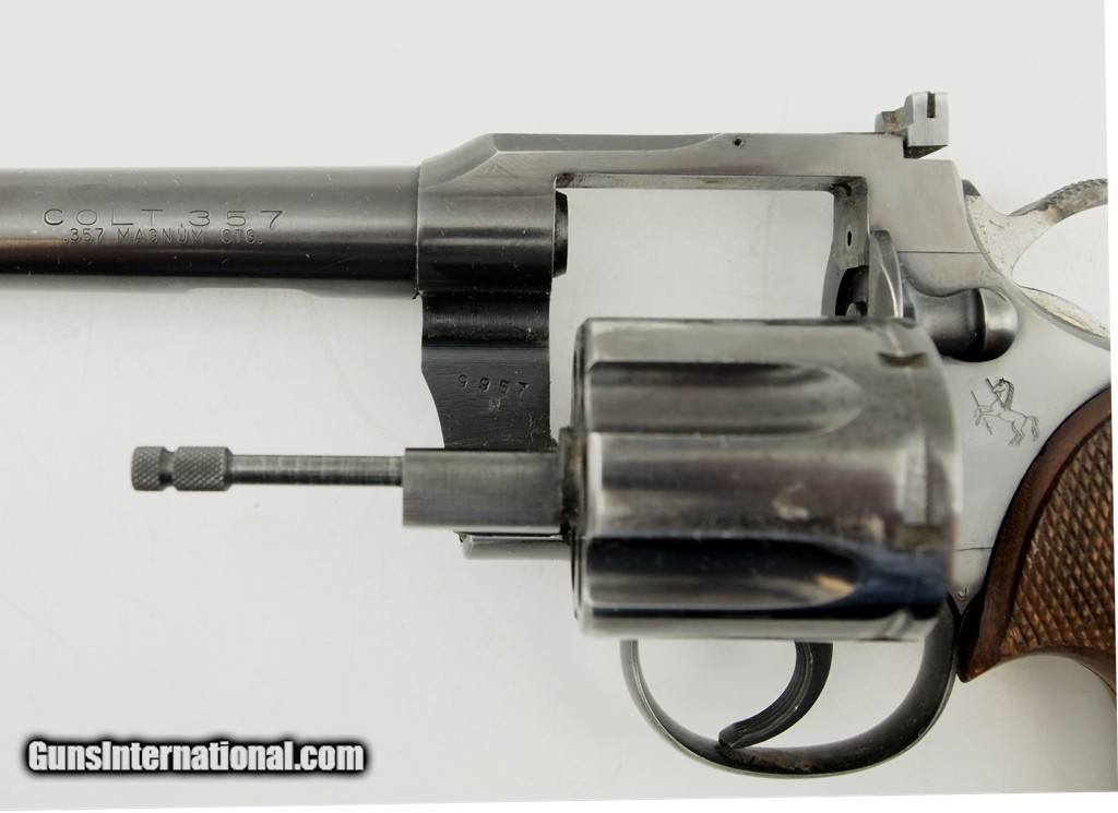 Description: Colt Model 357 MFG 1957 .357 Mag, 6" bbl, blued finish, adjustable notch rear sight, serrated ramp front sight, holster wear on barrel - cylinder, serrated trigger - checkered hammer, and checkered hardwood grips with inset Colt medallions. Add 3% for Credit Card Shipping $25.00 SOLD |