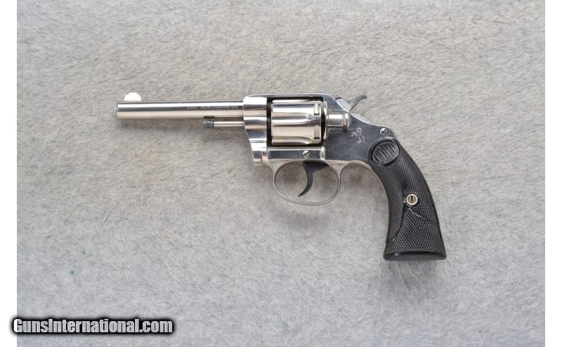 Description: This Colt Model New Police is a 6 shot double action revolver in .32 Police Cal. It has a 4 inch barrel. A blade front sight and an integral notch rear sight. The grip is a checkered hard black plastic with Colt on it. The left side grip is cracked and has been glued back together. .32 Police SOLD Chambers: 6 shot. Metal Condition: Very good. Wood Condition: Left side hard plastic grip is cracked and was glued back together. Bore Condition: Very good. Barrels: 4 inch. Triggers: Double action. Weight: 18 oz. Sights: Blade front. Integral notch rear. Item Location: Richfield, WI |
