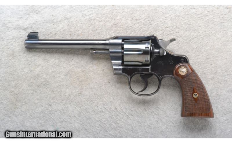 Description: This Colt Officers Model is a 6 shot double action revolver in .38 Cal. It has a 6 inch barrel. A blade front sight and an adjustable notch rear sight. The grip is a diamond checkered walnut with silver Colt horse medallions. Serial Number 431534. .38 Special SOLD Chambers: 6 shot. Metal Condition: Good. Light freckling and a little blue wear. Wood Condition: Very Good. Bore Condition: Very Good. Barrels: 6 inch. Triggers: SA/DA Weight: 36 oz. Sights: Blade front. Adjustable notch rear. Item Location: Richfield, WI |