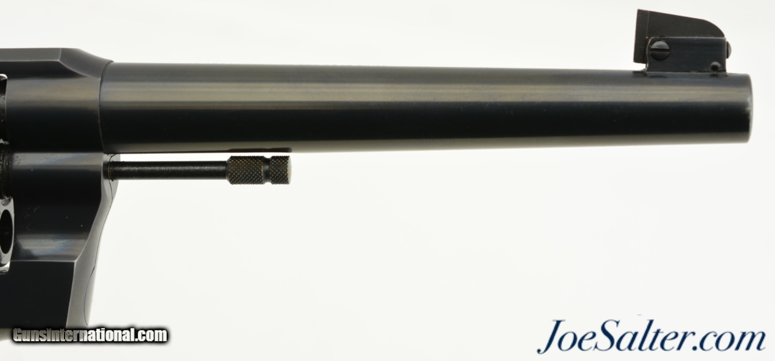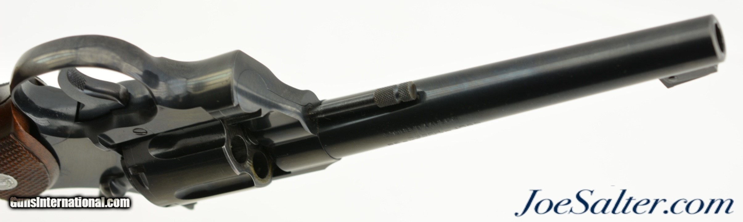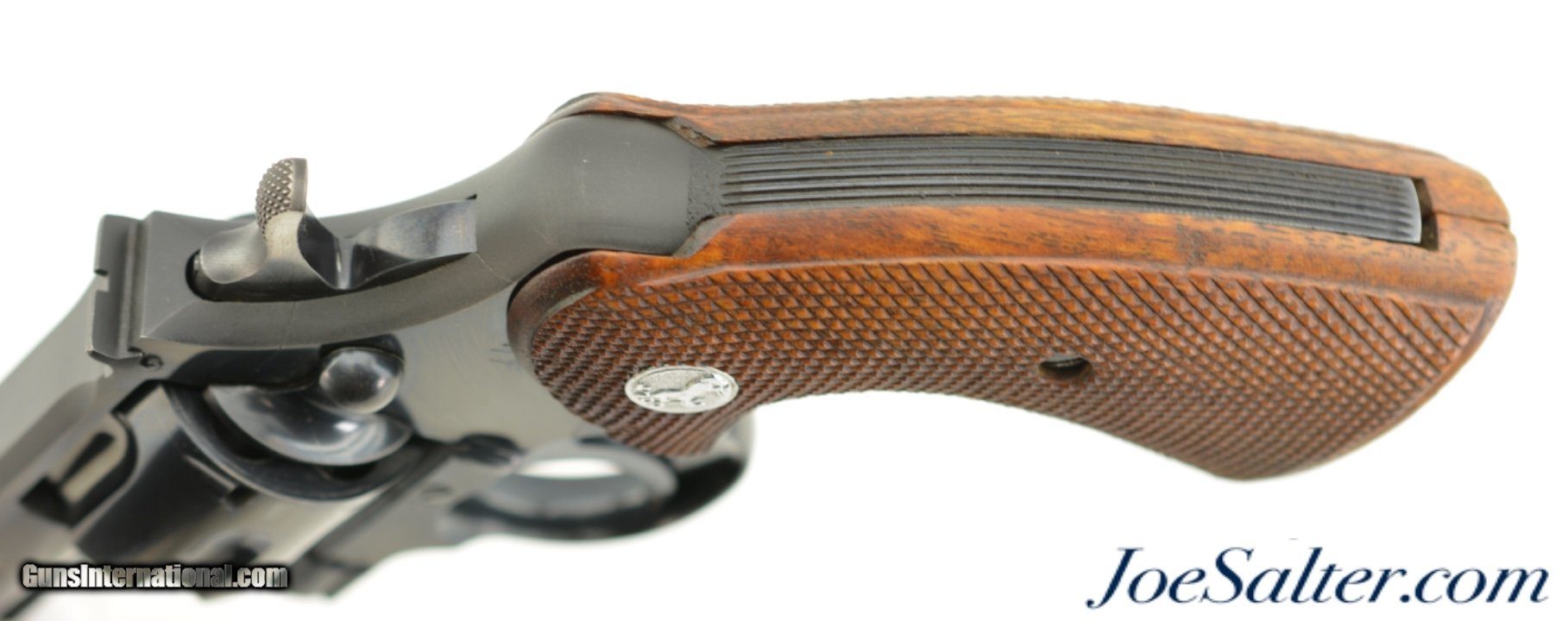 Description: Serial #750209, .38 Special, 6" heavy barrel with an excellent, bright bore. This is a 1949-made revolver that has retained 98-99% of the original blue finish with only some trace silvering on some of the edges and projections, as well as a mild turn-ring on the rear of the cylinder. The original target sights are still in place, however white paint was added to the front blade for visibility. The walnut Colt medallion target grips are in fine-near excellent shape with only a few very minor handling marks and only trace flattening of the points. Additionally, there is a slight gap between the panels at the toe. The lock-up is tight and the revolver rates excellent condition overall. FFL or C&R SOLD Curio/Relic: Yes |