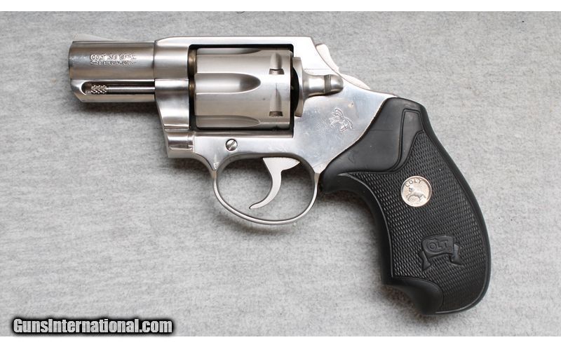 Description: Very good condition, light wear, small scratches. Colt 6 shot revolver with stainless finish, 2" barrel, shrouded ejector rod and factory hard rubber grips. A great choice for concealed carry. .38 Special SOLD Chambers: Revolver Metal Condition: Very good Bore Condition: Bright Barrels: 2 Triggers: Double action Butt Pad: Factory grip Sights: Fixed sight channel Item Location: La Vista, NE |