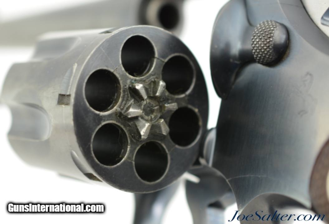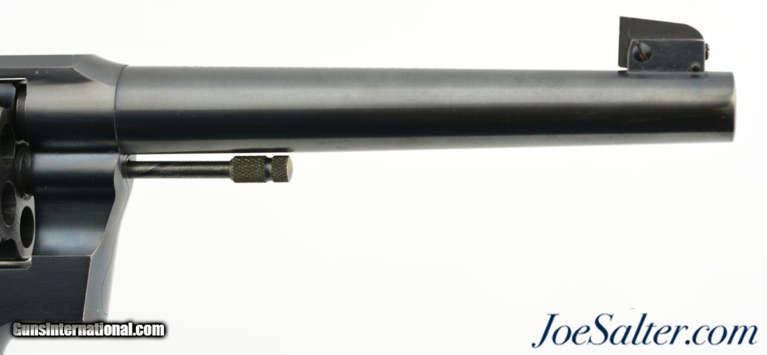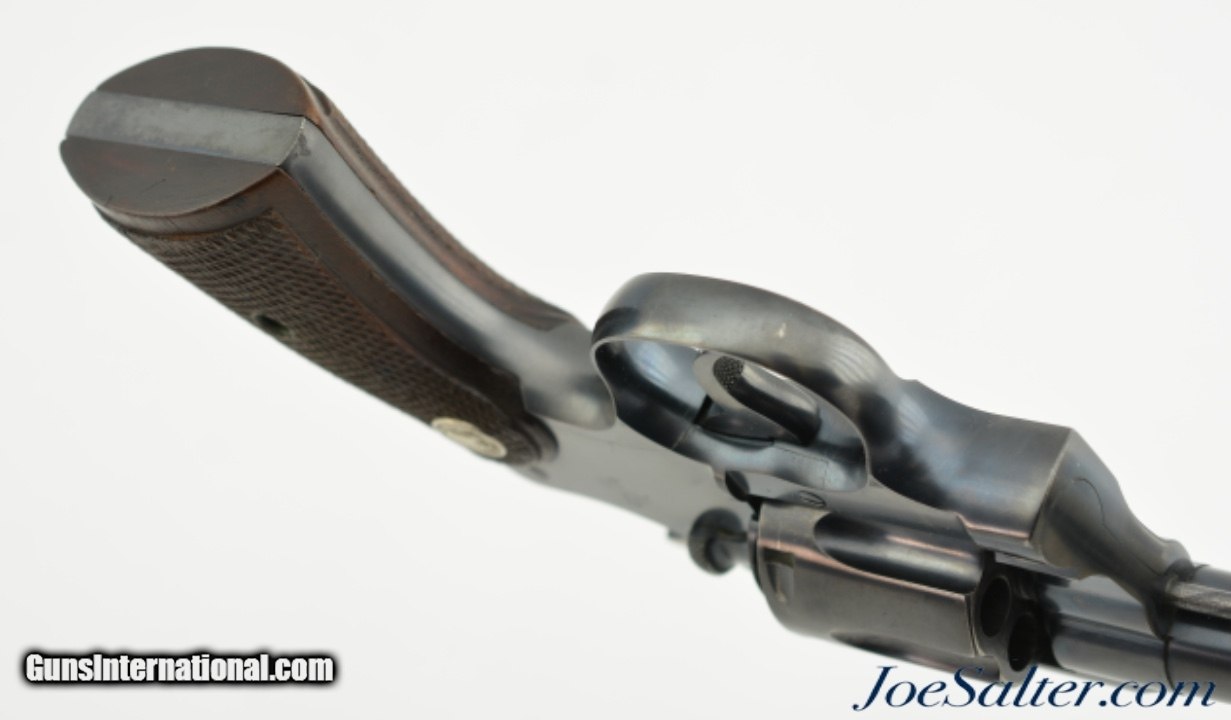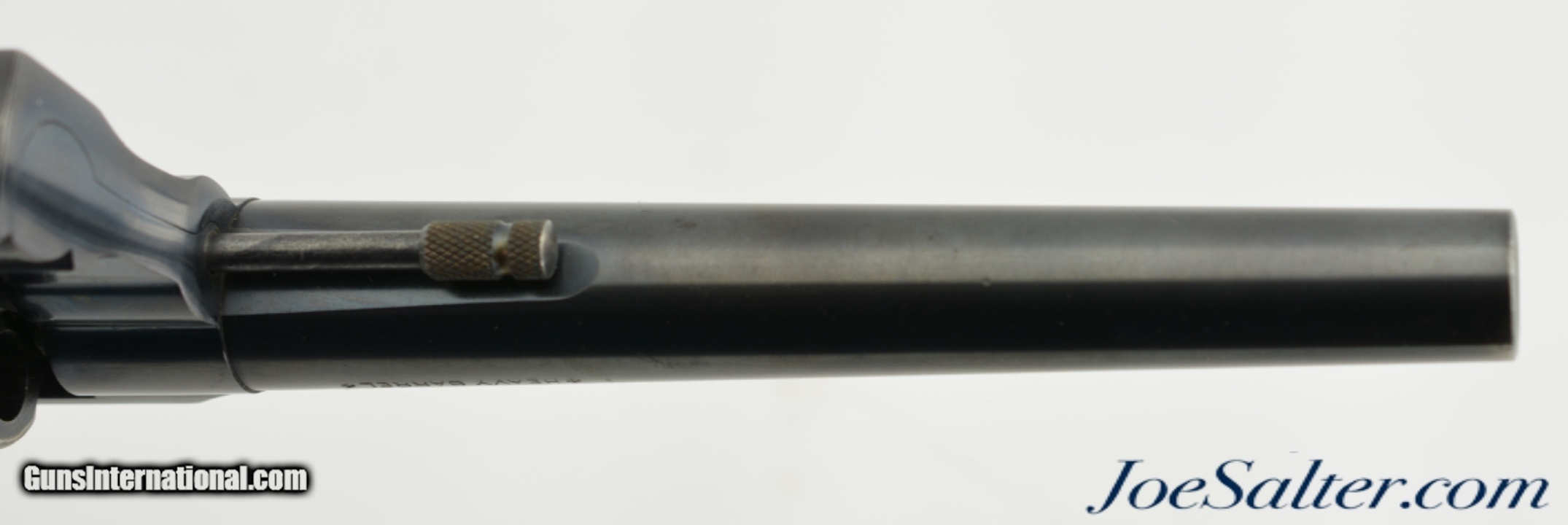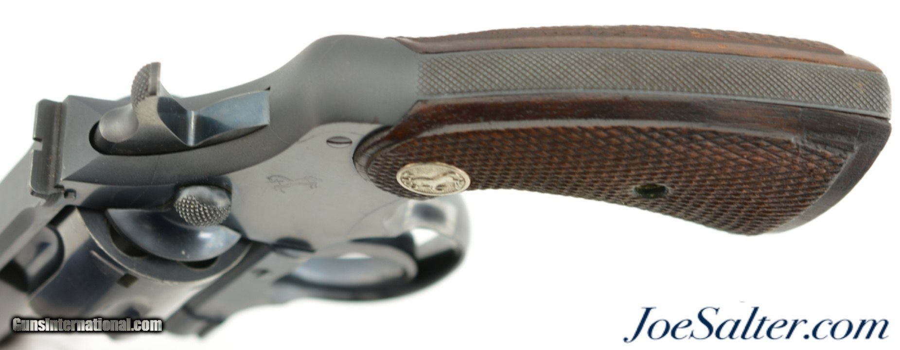 Description: Serial #599974, .38 Special, 6" heavy barrel with an excellent, bright bore. This is a splendid revolver, made in 1950, and retains 97-98% of the original blue finish, with only some mild silvering at the muzzle, along a few of the high and projecting edges, as well as a light turn-ring on the rear of the cylinder. The hammer has a few very small specks of freckling along the sides of the spur, but is otherwise in excellent shape. The checkered walnut Colt medallion grips are in fine shape, with only a few very minor handling marks and very little flattening of the points. The lock-up is tight and the action functions smoothly in both single and double-action. This is a fantastic Colt Officers Model, and is in excellent condition. FFL or C&R SOLD Curio/Relic: Yes |