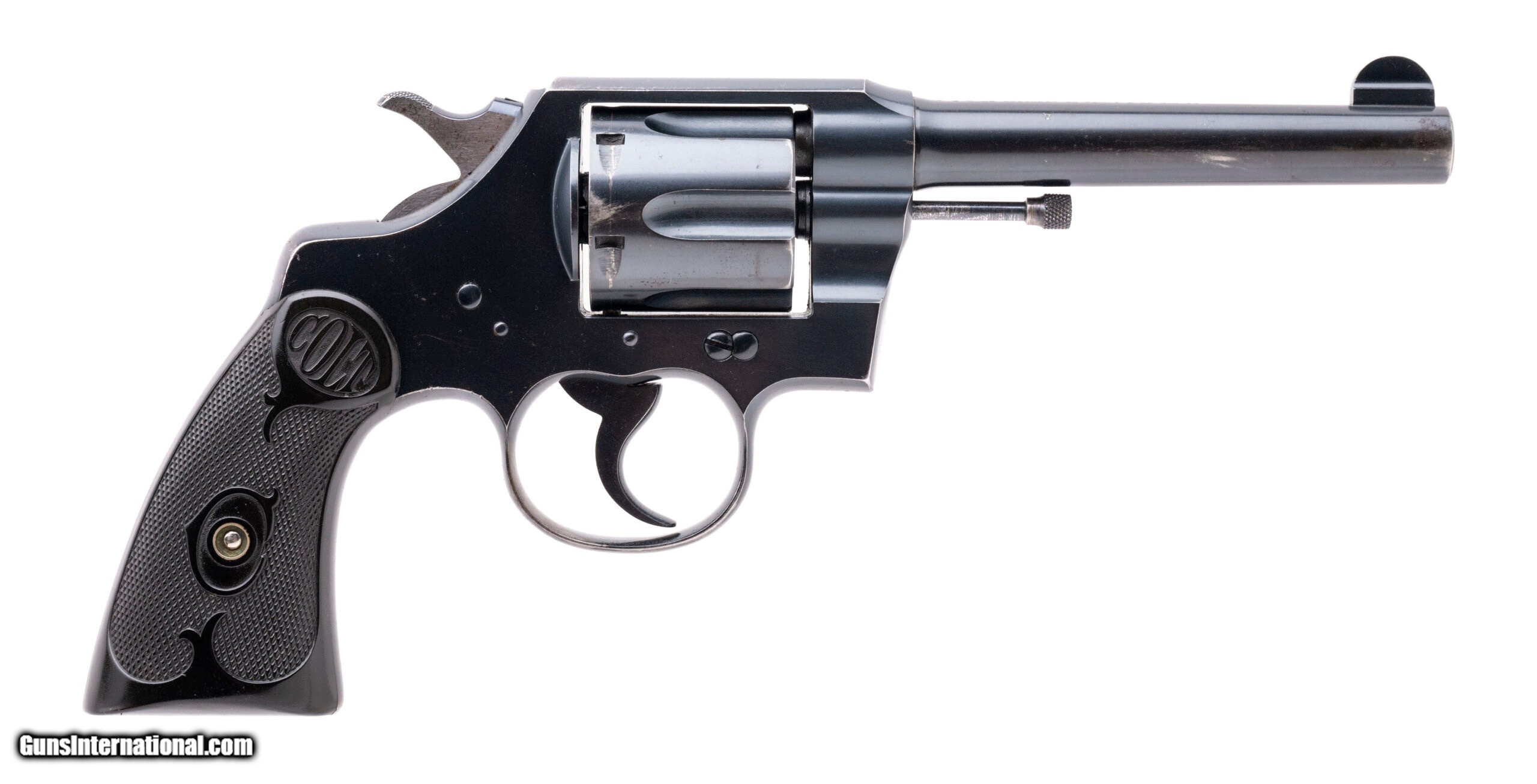 Description: "SN: 474655. made in 1922. .38 Special with a 5"" barrel. Bore is bright with strong rifling. Pre-war double action Colt revolver. Blue finish is in very good condition with expected wear near the muzzle, and light handling wear on the grip frame. Colt grips are in very good condition with strong checkering. Action locks up tight. Overall very good condition. SOLD |