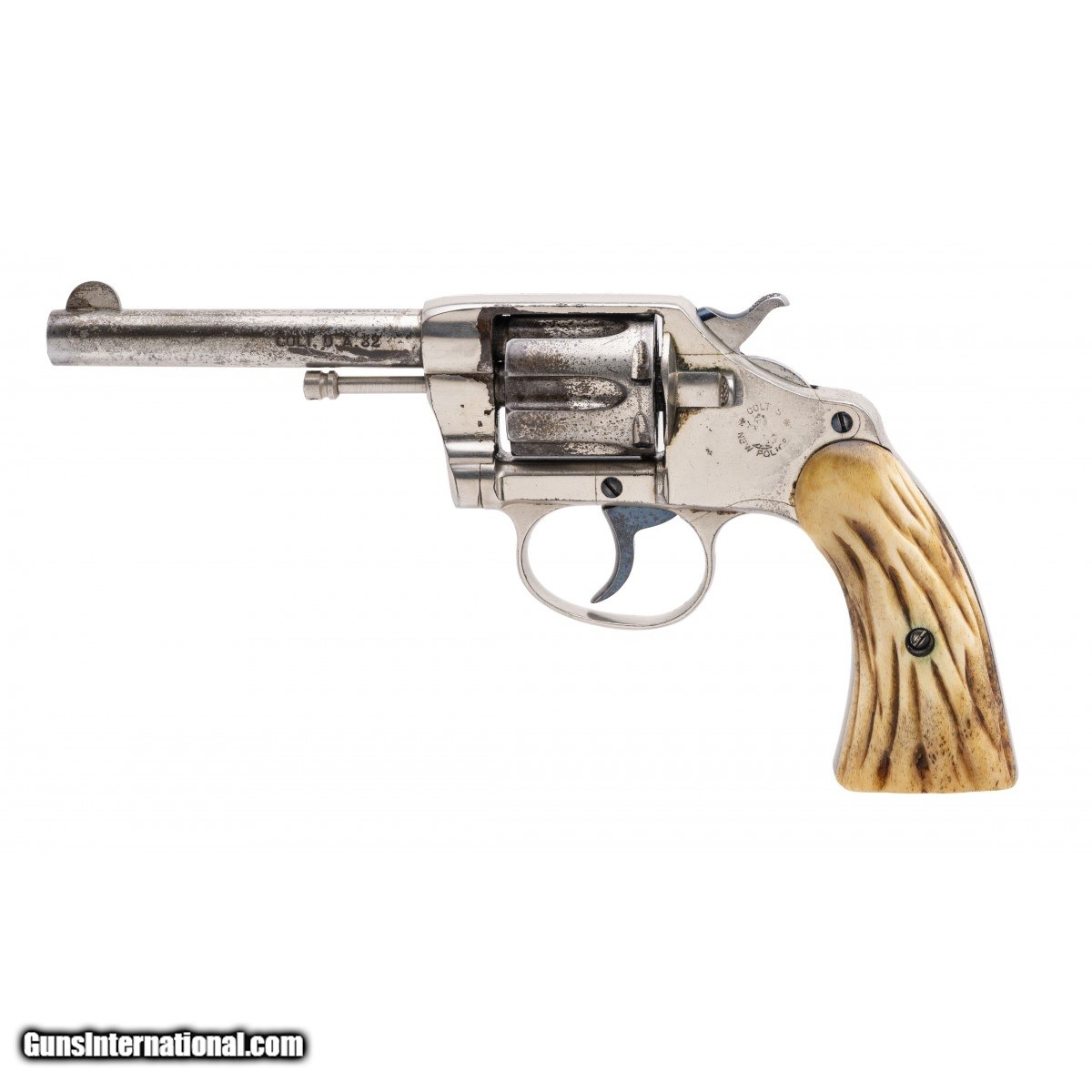Serial No. 9009, made in 1899, .32 caliber, 4"" round barrel marked ""Colt D.A. 32"". Revolver has had a nickel finish applied at some point with discoloration and flaking visible on the cylinder and frame. Bore is fair with oxidation visible in the lands and grooves. Stag grips are good with light handling wear noted. Action indexes correctly with a tight lock up.