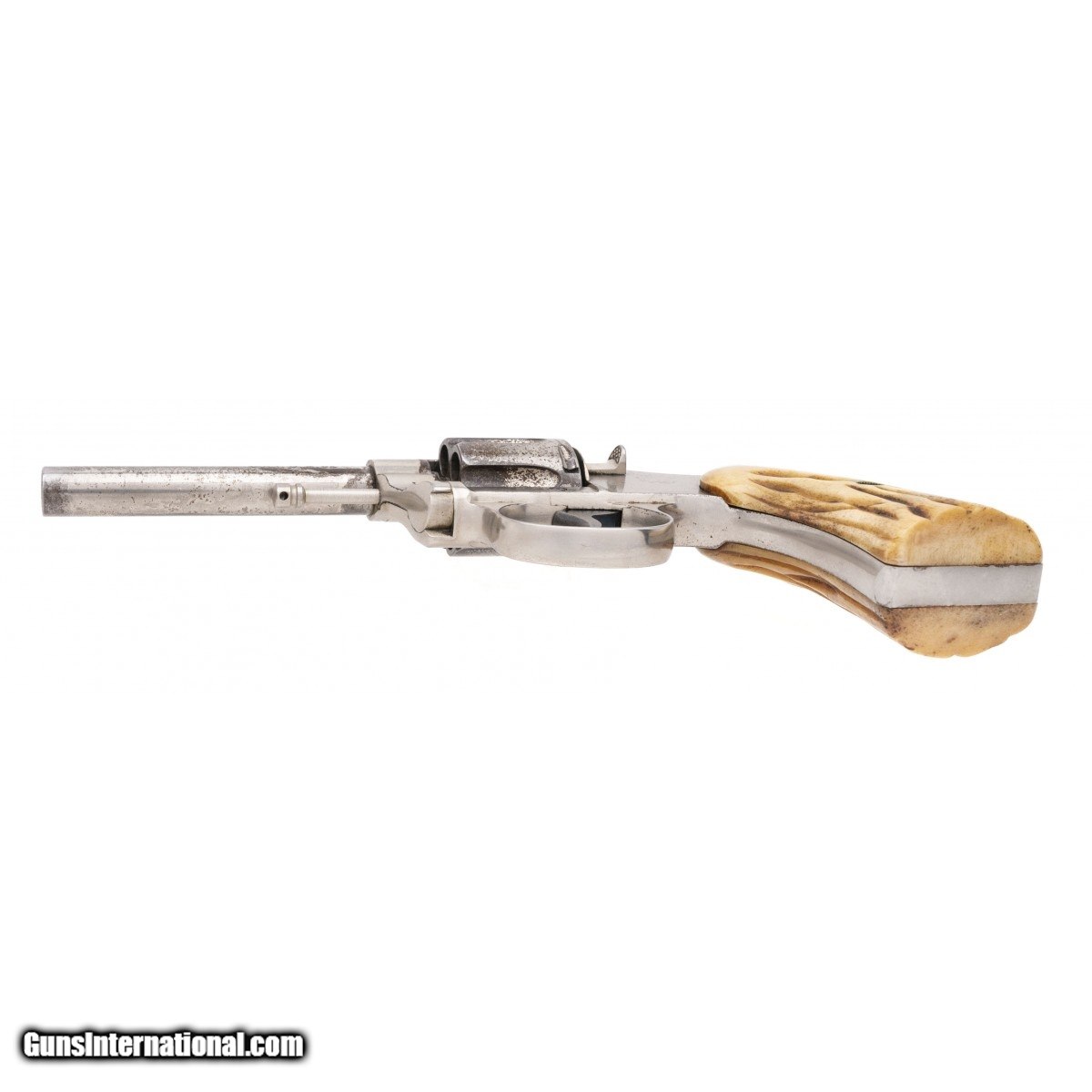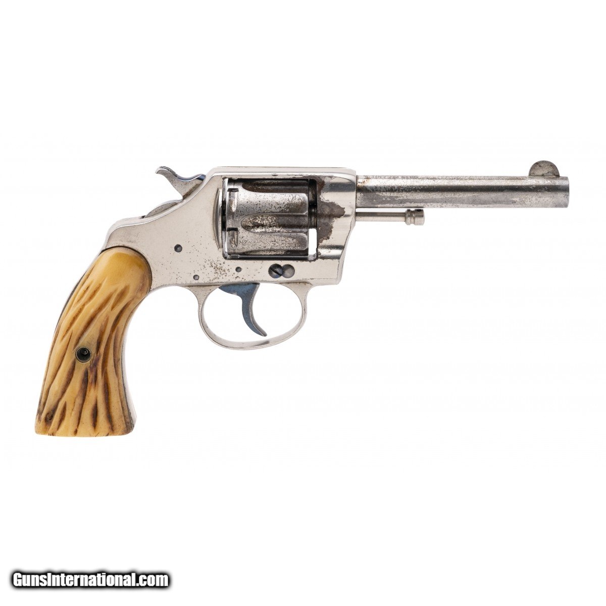 Description: " Serial No. 9009, made in 1899, .32 caliber, 4"" round barrel marked ""Colt D.A. 32"". Revolver has had a nickel finish applied at some point with discoloration and flaking visible on the cylinder and frame. Bore is fair with oxidation visible in the lands and grooves. Stag grips are good with light handling wear noted. Action indexes correctly with a tight lock up. SOLD Curio/Relic: Yes |
