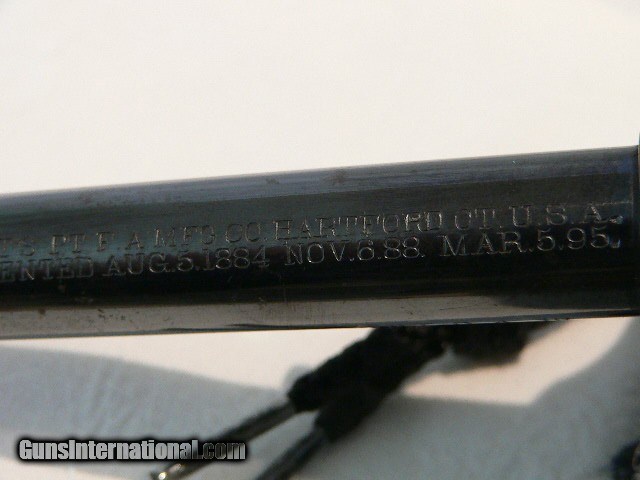 Description: 1905 U.S.M.C. Civilian .38 DA REVOLVER, RARE ONLY 926 MADE! The Marine Corps Civilian Model is one of the desirable handguns in Colt's double action revolver production. With a total civilian revolver made of only 926, and most of these were use, the surviving arms are few. The Marine Corps association also adds to the model's status and importance. This is an excellent example of a very difficult Colt to obtain. Fine deep blue overall with some normal holster wear around the muzzle area of the barrel, with thinning bluing on the back strap and on the bottom portion of the front strap with some light edge wear, fine fire blue on the trigger sides and hammer back, exc. markings including "No. 102XX" exc. checkered walnut grips unique to this model (when they are missing they are impossible to replace), no sling swivel Colt plug the hole where it would go these were sold with no sling swivel, correct last patent date on the barrel of 1895, exc. mech. and exc. bore, a super rare and important Colt in outstanding condition. Comes with a letter shipped to Pacific Hardware and Steel Company San Francisco, California May 1, 1906 Shipping is $50.00 SOLD Curio/Relic: Yes Handgun Caliber: .38 Long Colt Manufacturer: Colt Model: 1905 U.S.M.C. Serial Number: 247371 Barrel Length: 6 Condition: 80% |
