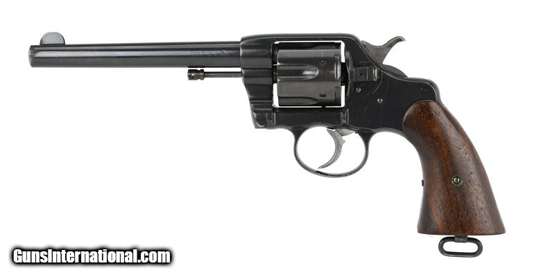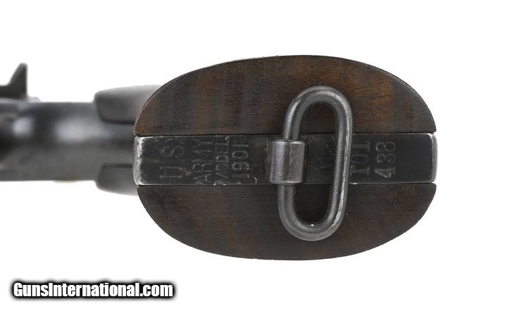 Description: Colt 1901 .38 LC caliber revolver. U.S. Army Model 1901 Double Action Service Revolver. .38 Colt caliber. Serial number 101438. Crane, frame, butt and cylinder latch all have matching numbers. Revolver is R.A.C. inspected Rinaldo A. Carr. Bore is perfect. Action indexes and locks up perfectly. Grips are excellent. No chips or cracks. Grips are a little bit proud to the front grip strap. Overall the revolver has approximately 93-95% blue. Fine condition Model 1901!