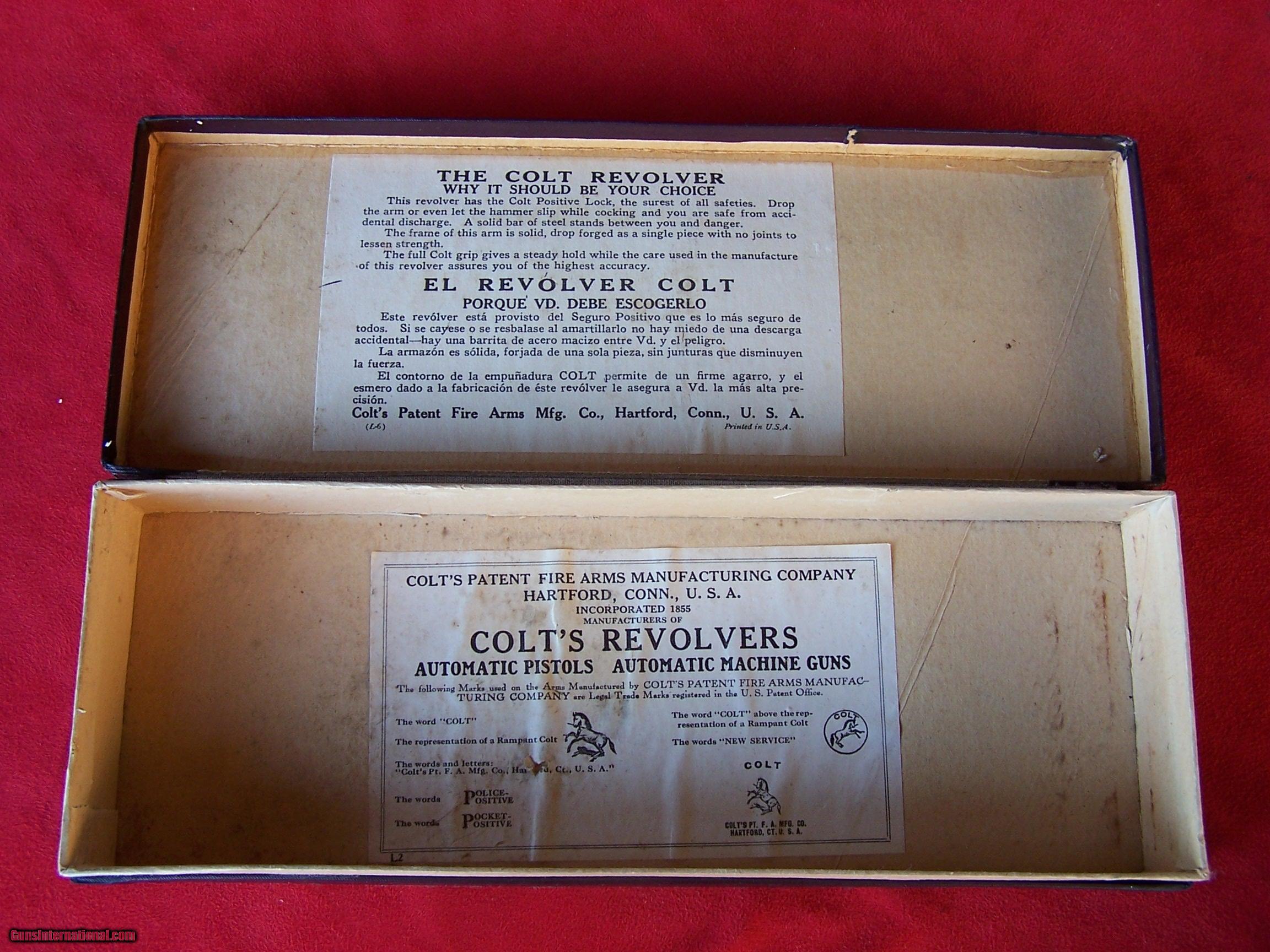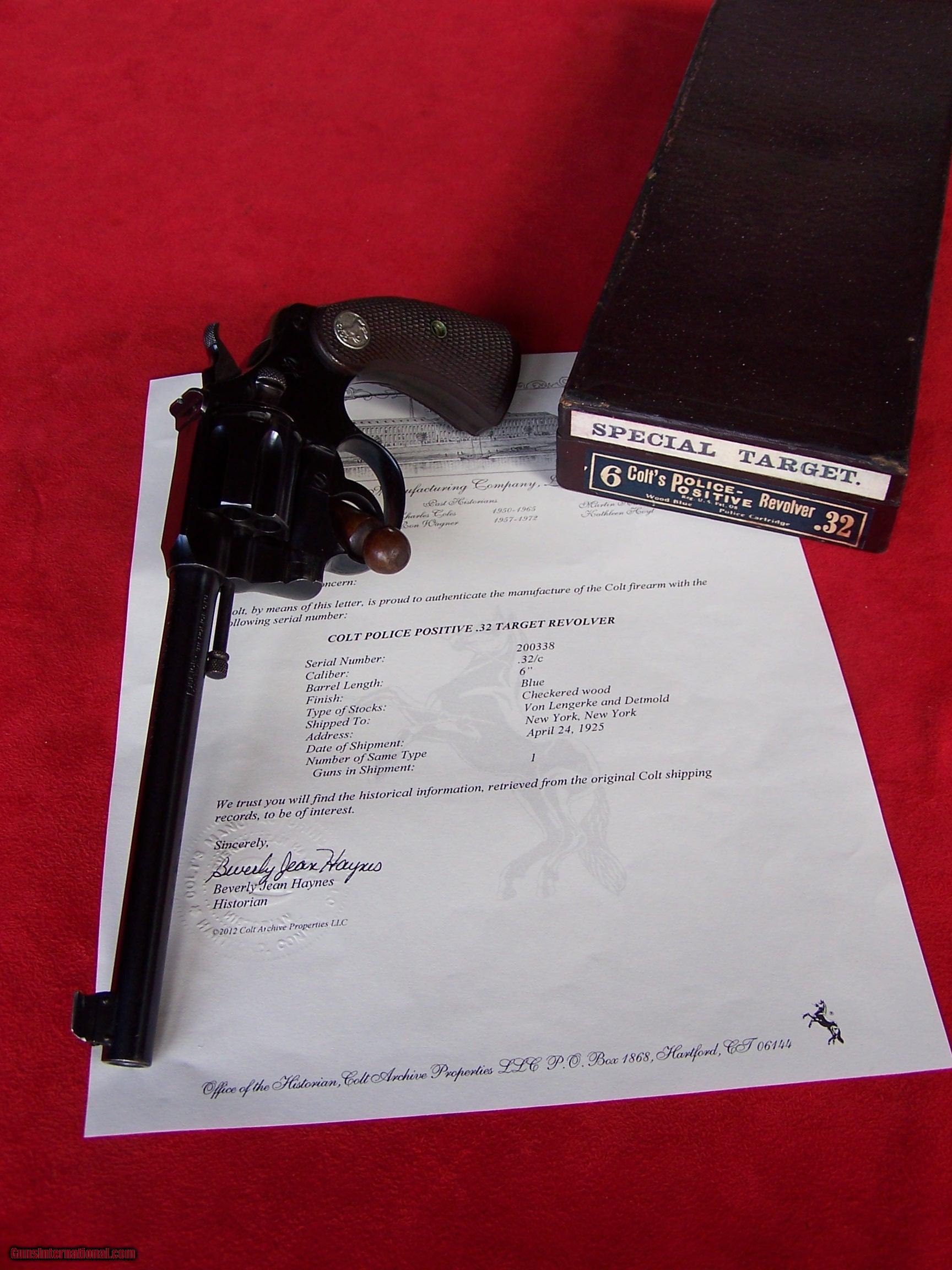 Description: This is a Colt Pre War 1st Model Police Positive target .32 that is in it's original box and includes a Colt factory letter. The gun remains in near new condition and is mechanically perfect. The gun locks up tight and the bore is excellent. The .32 caliber is the rarest of the three calibers made and finding one in this condition with the original box is very rare. The gun was made in April of 1925 and was a one gun shipment to Von Lengerke and Detmold in New York. This gun would fit the finist of Colt collections. I offer a three day inspection on all of my guns and it will be packaged correctly with the gun being shipped in a zipper pouch. This gun requires a C&R or FFL license for shipment. Price is $2950 plus $45 insured shipping. Please call Cam 931-484-3200 with any questions. Lay-A-Way Plan is available on this gun. Please Note: Gun is sold pending funds. SOLD Curio/Relic: Yes Manufacturer: Colt Model: 1st Model Police PositiveTarget .32 Serial Number: 200338 Caliber Info: .32 Bore: Excellent Condition: Very Good Plus Metal Condition: 98-99% Wood Condition: Excellent Bore Condition: eExcellent Barrels: 6" Length Barrel Type: Target Action: Double Action Manufacture Date: April 24, 1925 |