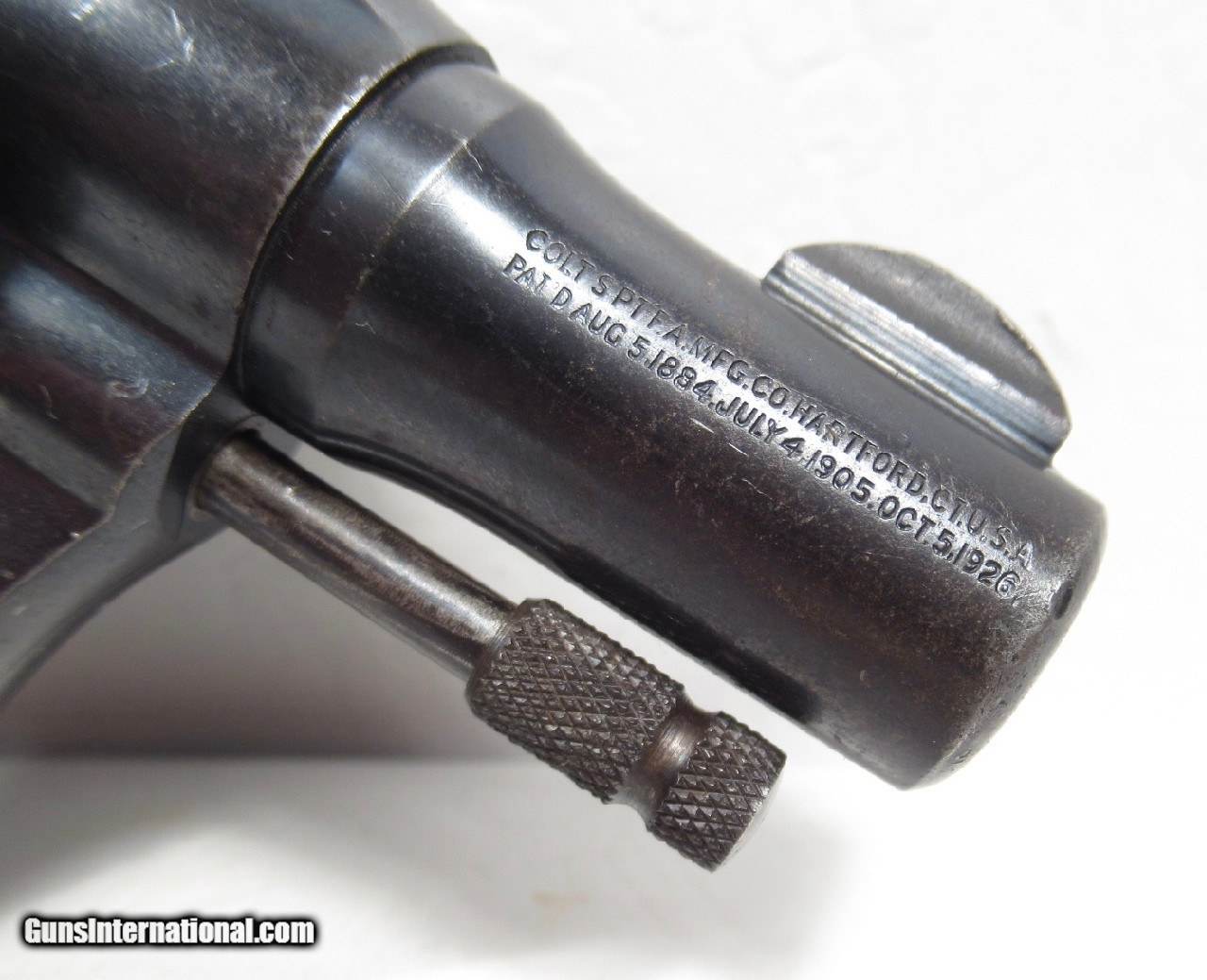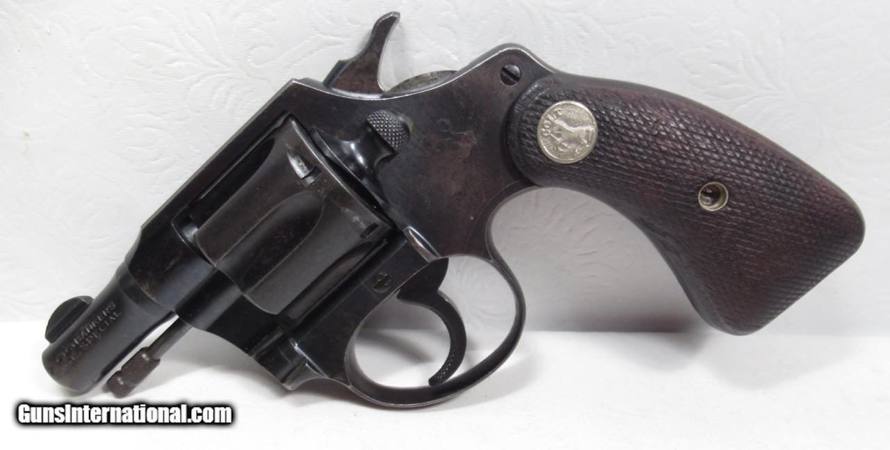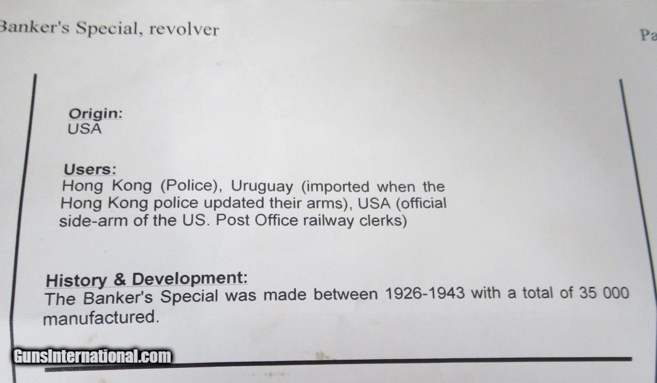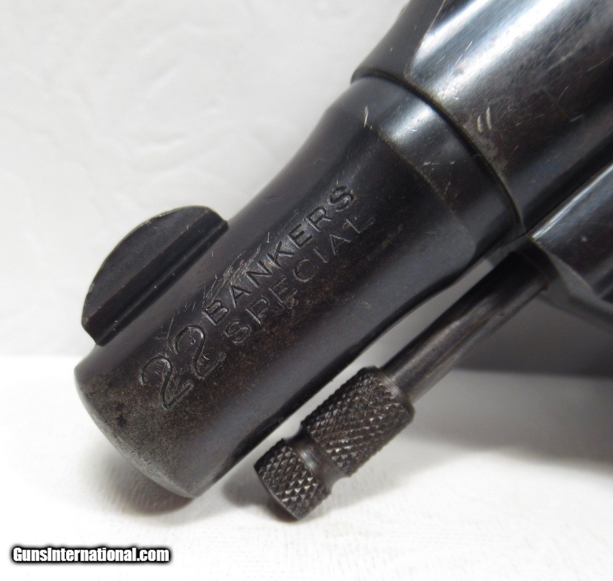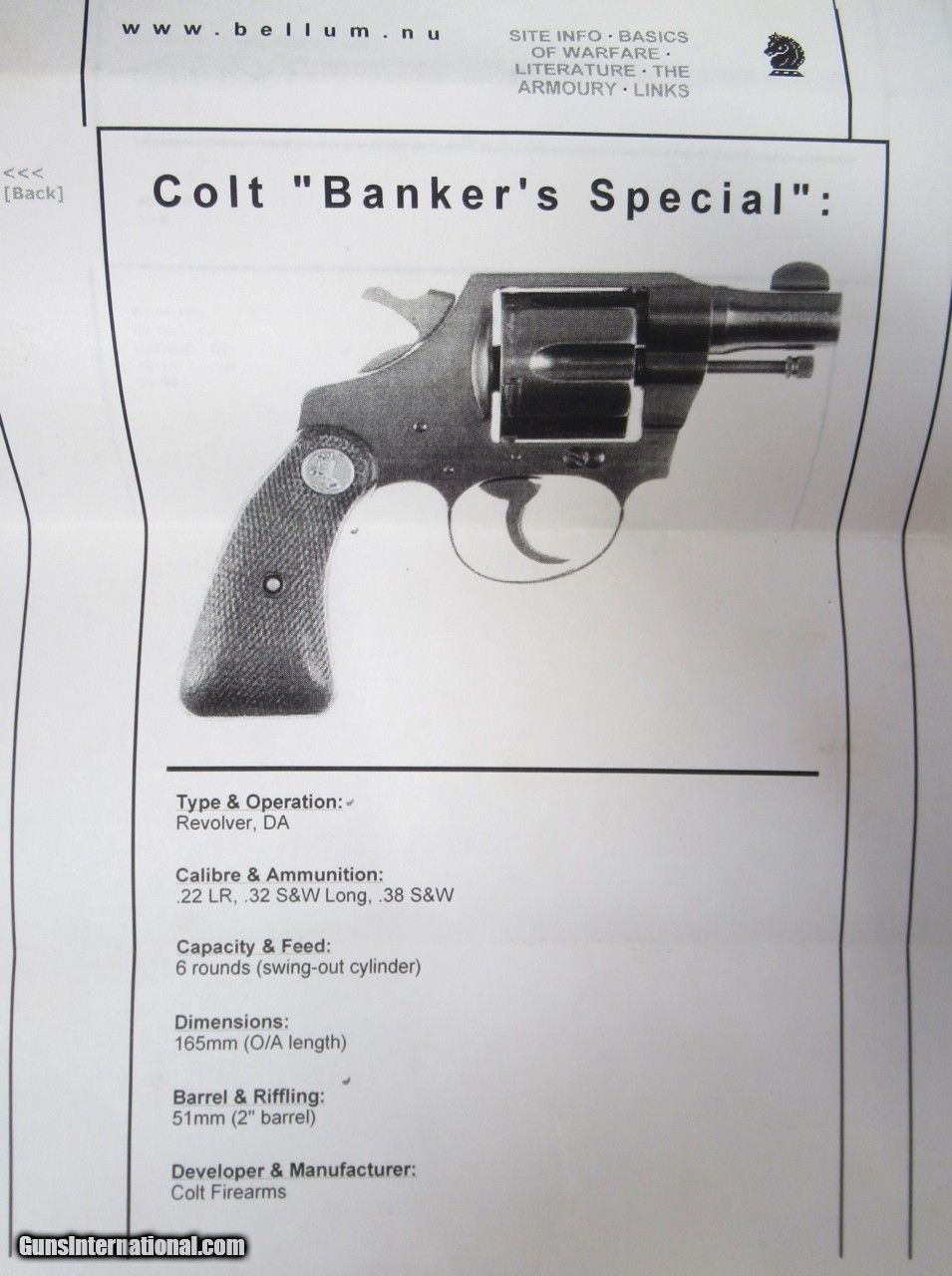 Description: Colt Banker’s Special Model; Serial No. 368466; .22 Cal.; Rare with 2” Barrel; Made in 1934; Perfect Action and Perfect Bore; Most of the Original Blue Remains; Original Grips Numbered to Gun; See Photos for Condition; No Text, Call or Email Only; PERSONAL PROPERTY of Harold Wieser; Price: $2,475 + $30 S&H; Price includes insured shipping; return policy: three days inspection from the date the item is received; full refund of shipping both ways ONLY IF THE ITEM IS MISREPRESENTED. SOLD Manufacturer: Colt Model: Banker's Special Serial Number: 383466 |