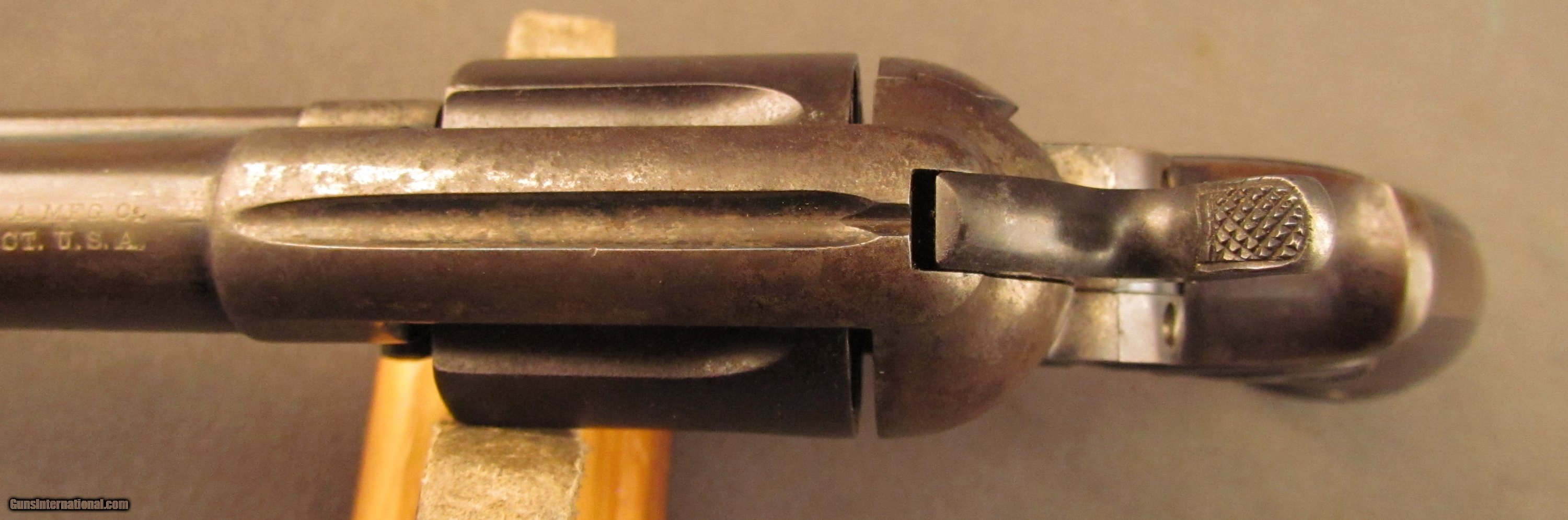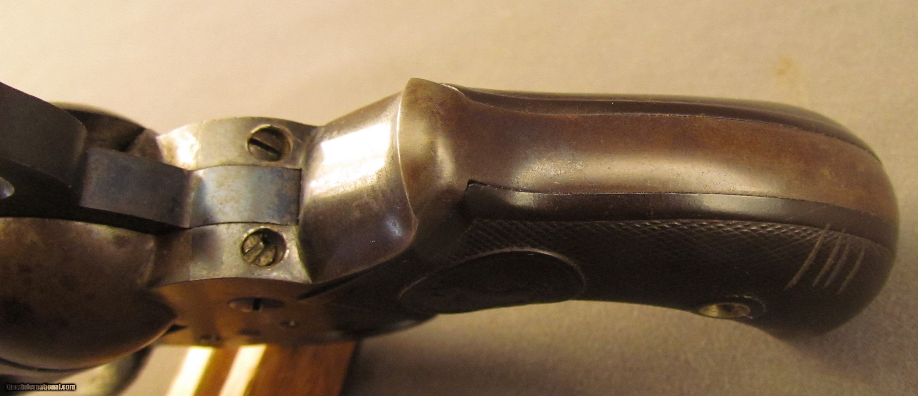 Description: Serial #148837, .41 Colt, 4 1/2” barrel with a very good bore that has light freckling and pitting along its length. This is a 1904-made revolver that has an overall plum-brown patina with traces of the original blue remaining on the protected areas of the barrel, ejector rod housing, cylinder, and trigger guard. The frame was originally color case-hardening, but is now dark brown in color with some specks of pewter gray scattered here and there. The hammer retains visible amounts of the original bright fire blue with the balance turned to a lightly freckled plum-brown patina. The checkered hard rubber grips are in good-very good condition; intact but worn at the butt with general flattening of the points on both panels, and some scattered surface scratches. The mechanism is still tight and fully functional, and the revolver rates very good plus condition overall. FFL or C&R SOLD Curio/Relic: Yes Manufacturer: Colt Model: Thunderer Serial Number: 148837 Caliber Info: .41 Colt Gauge Info: .41 Colt |