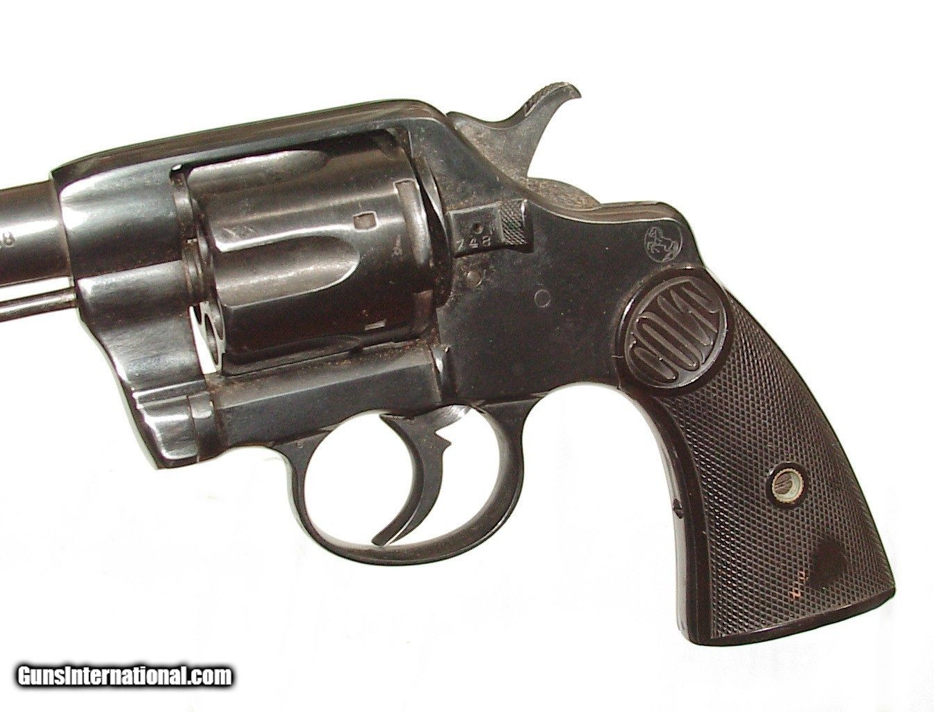 Description: .38 Colt caliber, 6" barrel, six shot cylinder. Finished blue with checkered hardrubber factory grips. Appears to be an older refinish now retaining all of the blue. Nice grips and minty bore. Mechanically sound. SOLD Curio/Relic: Yes |