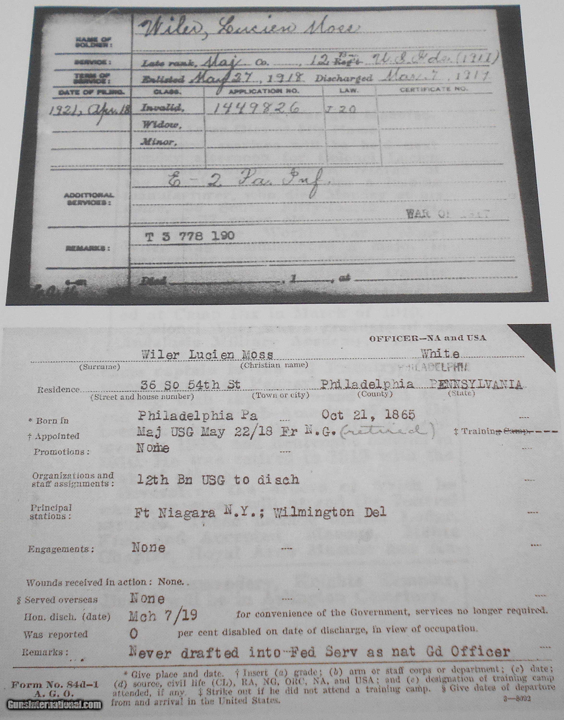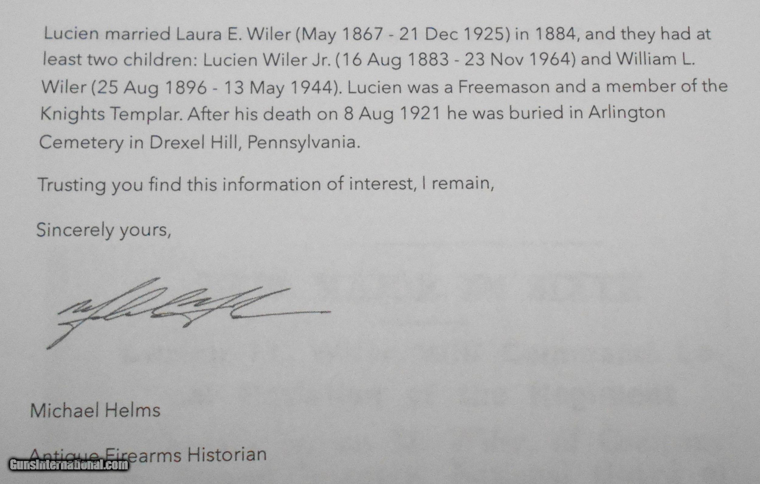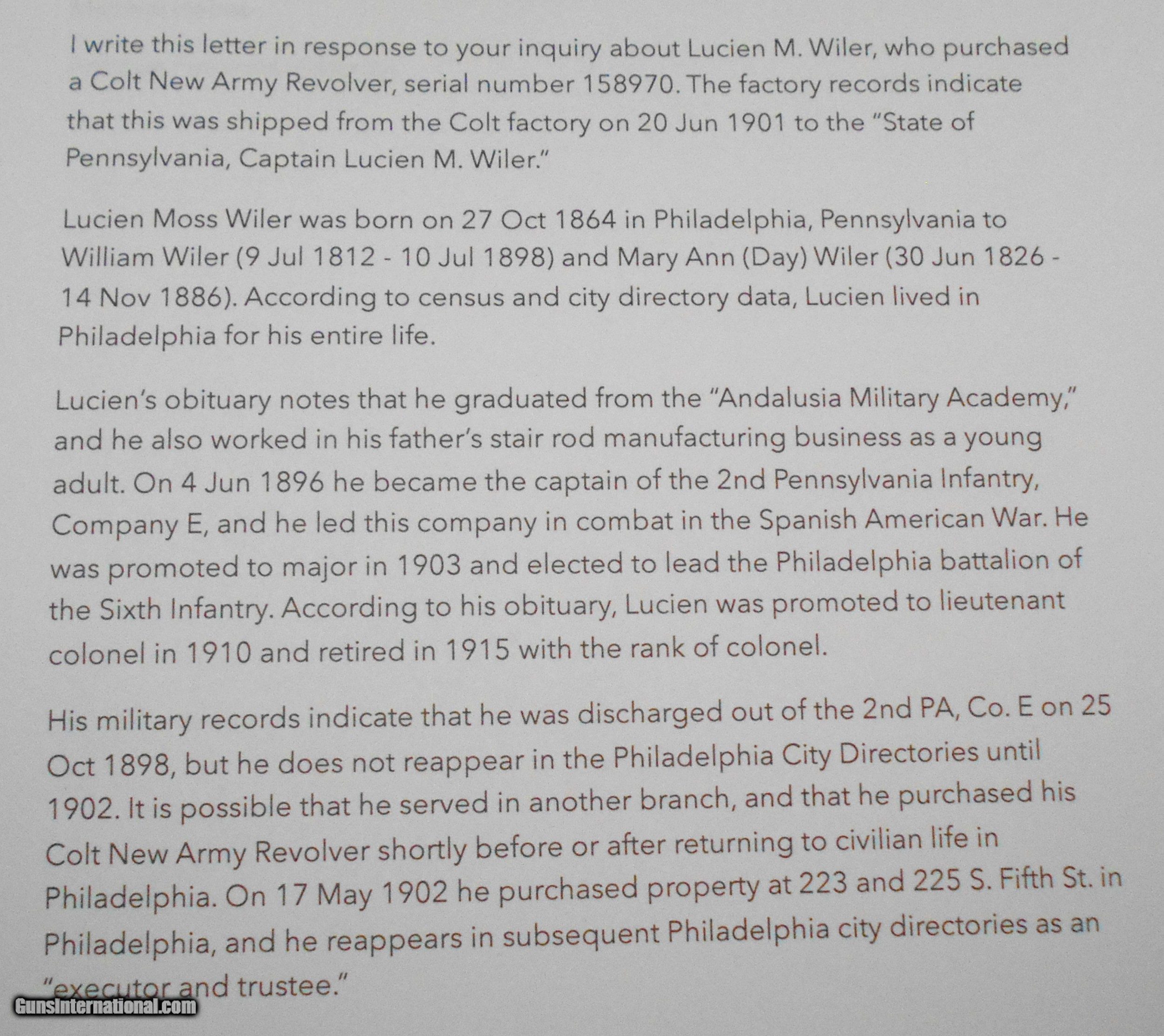 Description: SOLD This is a very nice revolver with a factory engraved inscription and very good provenance. THIS IS A SUPER NICE REVOLVER. The backstrap is engraved LUCIAN W. WILER. Revolver was shipped to the state of Pennsylvania, Captain Lucian M. Wiler on June 20, 1901. On June 4, 1896 he became captain of the 2nd Pennsylvania Infantry, company E, and led his company in combat in the Spanish American War. He was promoted to major in 1903, Lt. Colonel in 1910, and Colonel in 1915. More information is included in the pictures. Bore in the 6" barrel is shiny with excellent lands and grooves. It will rate an eight on a one to ten scale. A high percentage of the original bright blue finish remains. You will also find fire blue on the proper parts. Action is perfect. Grips are excellent, no damage and little wear. Fit is exactly as it should be. All numbered parts match, including the grips. Markings are original and easy to see. Cylinder is RAC inspected. Caliber is 38 Colt. This is a nice one. You will like this revolver. It will make a great addition to any collection. American Arms & Antiques item #2438. Please contact me with questions or request for more pictures. Happy to speak with you. SOLD Curio/Relic: Yes |