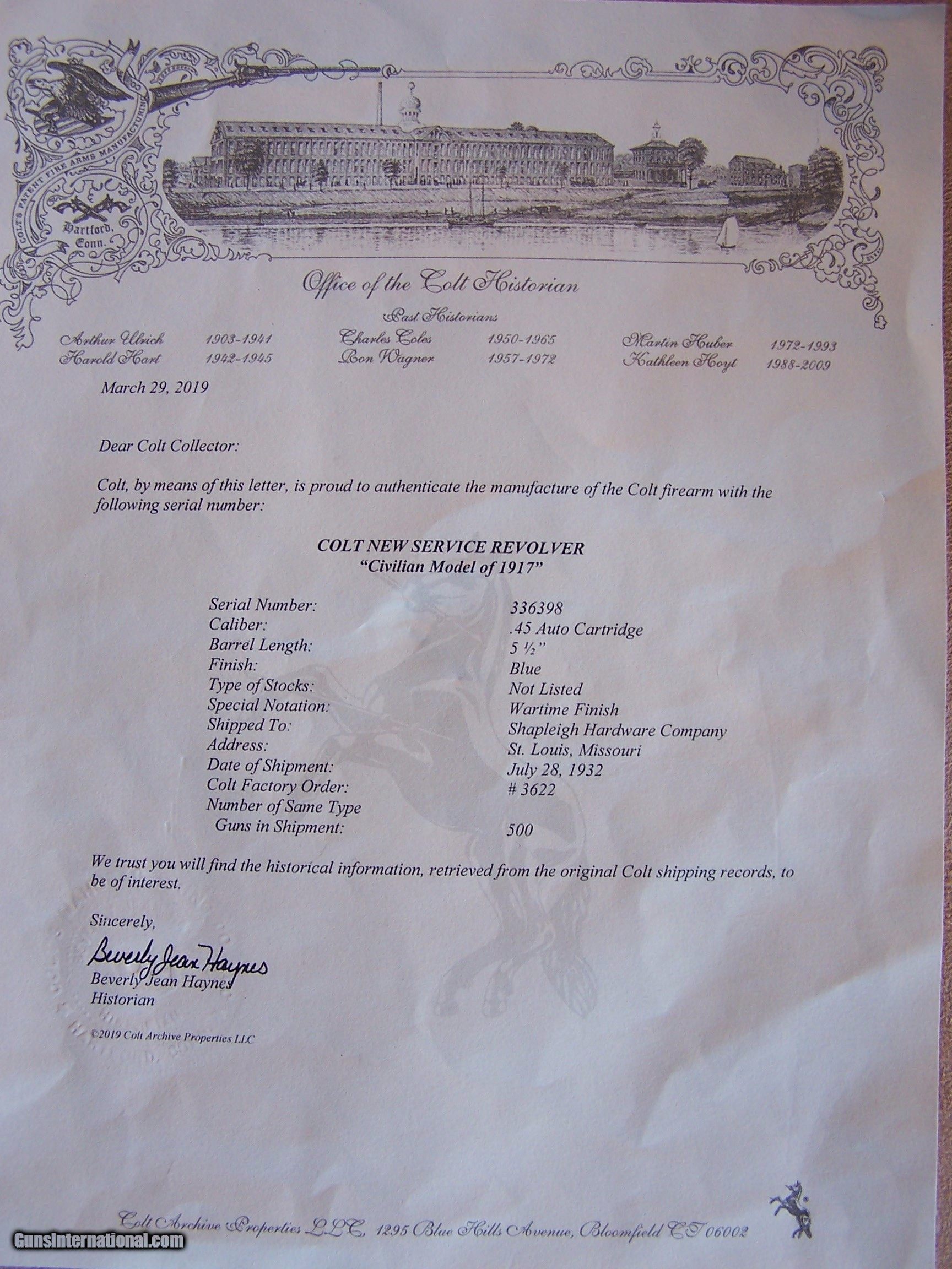 Description: In 1932 Colt assembled 900 civilian model 1917 New Services revolvers from parts that were leftover from the WWI Army contract. These have become very collectible amongst collectors due to their scarcity. These had the 5 1/2” barrel, checkered walnut grips, chambered in .45 Auto, and fall within the serial number range of 335,XXX-336,XXX. This one is serial number 336,398 and comes with a Colt letter showing it was part of a shipment to Shapleigh Hardware Company on 07/28/1932. The gun is in very good condition with some wear shown on the left side of the frame below the Rampant Colt logo and a chip in the right side grip. The bore is excellent and appears to have been fired very little. The action locks up tight and is mechanically perfect. It would make an excellent addition to any collection. ??I offer a three-day non-firing inspection period and always want the buyer to be satisfied with their purchase. The gun will be packed correctly and shipped via FedEx with insurance to your FFL dealer in the continental United States for $55 (California is extra because I have to ship through my local dealer). This gun requires a C&R or FFL license for transfer. I ship the following day after the payment arrives and provide tracking information. Please see my other Colts and various collectible firearms that I have listed. Thanks for your interest and please let me know if you have any questions. Price is $2450.00 plus shipping. Please Note: A same as cash price Lay-A-Way plan is available on this gun. Please call to discuss. Sold Pending Funds SOLD Curio/Relic: Yes Antique: Yes Handgun Caliber: .45 ACP (.45 Auto) Manufacturer: Colt Model: New Service Serial Number: 336,398 Barrel Length: 5 1/2 Condition: Very Good Metal Condition: Very Good Wood Condition: Good Bore Condition: Excellent Action: Double Action Finish: Original Colt Bluing Sights: Fixed Manufacture Date: 07/28/1932 Extras: Factory Letter Item Location: Tennessee |