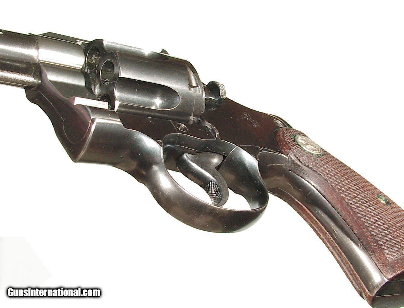 Description: .38 Special caliber, 6" "HEAVY BARREL" with adjustable sights. Finished blue overall with factory checkered medallion walnut grips. In superb original condition retaining nearly all of the factory blue and excellent grips. Serial range 631xxx. SOLD Curio/Relic: Yes |