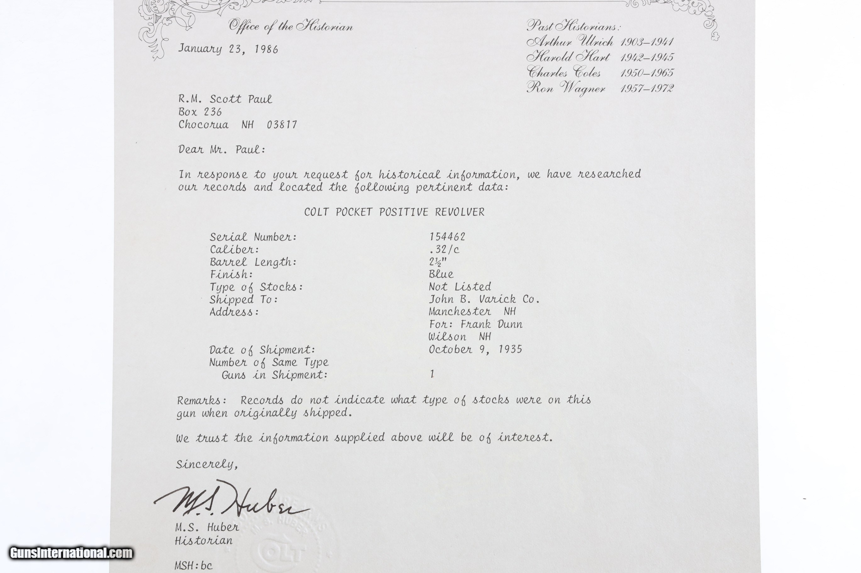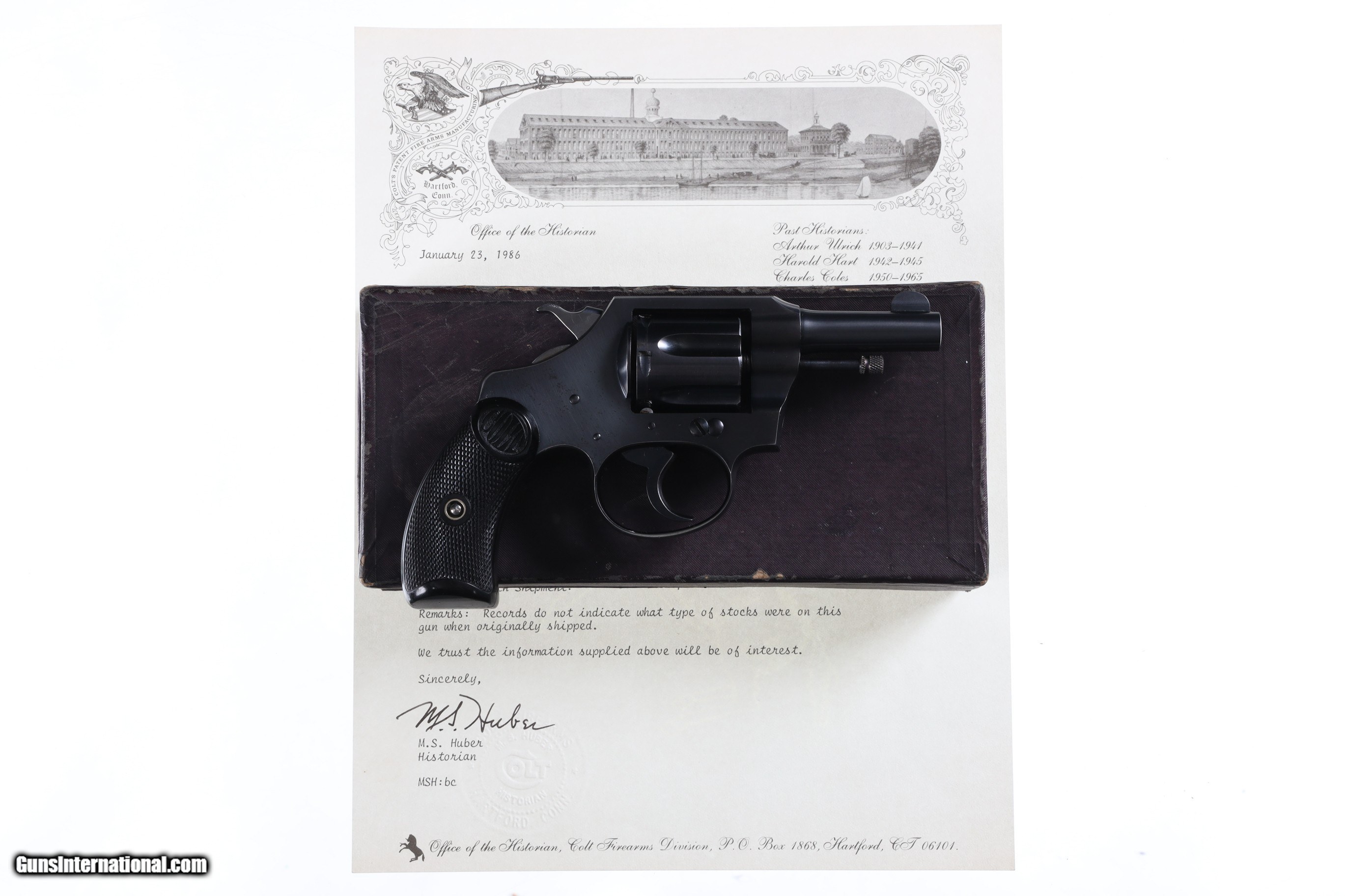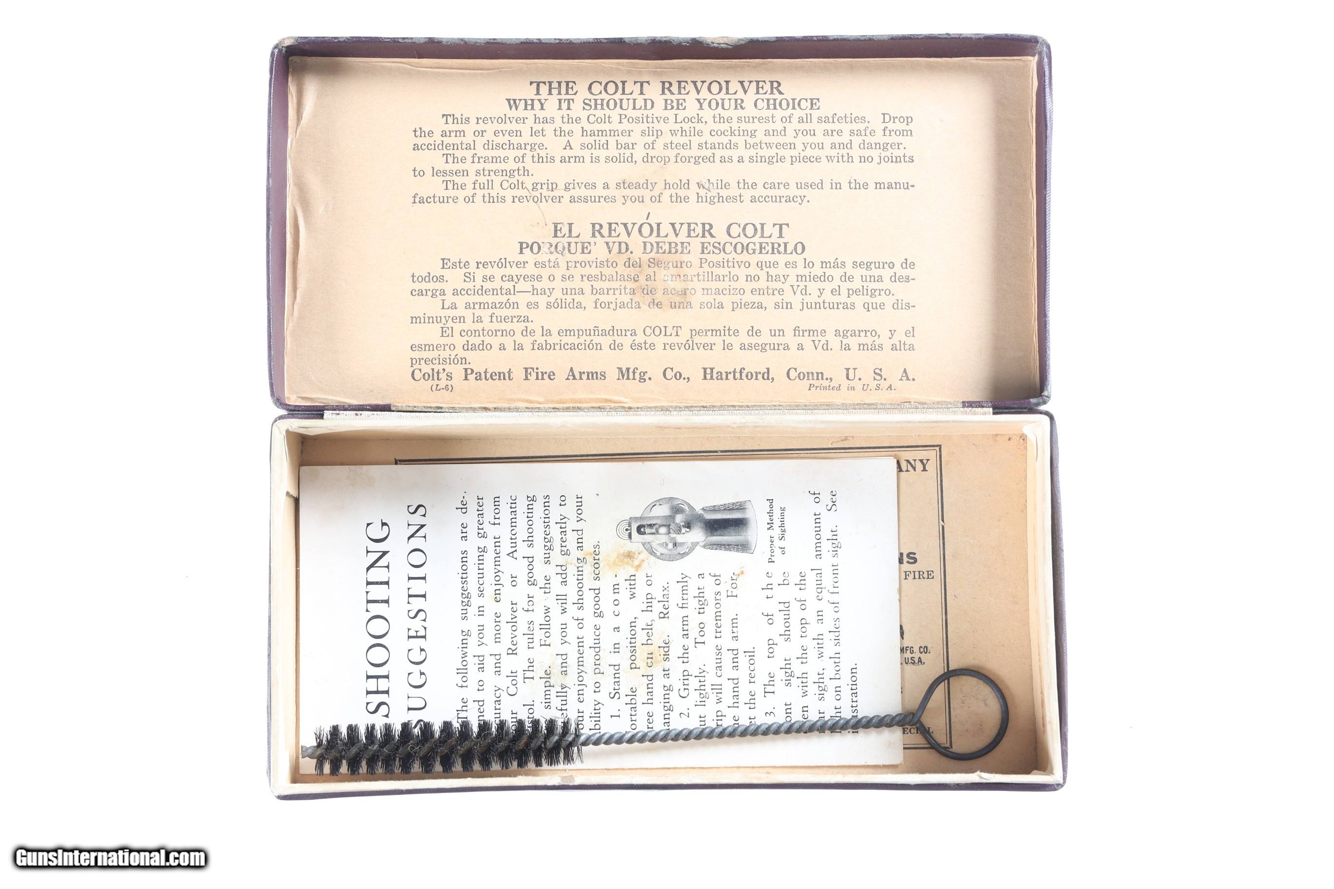 Description: Excellent with 97% blue finish with very light thinning on backstrap and at toe, bore and grips are excellent, box is very fine with full label, letter remains crisp, mechanically excellent. Factory letter lists this revolver in .32 caliber with a 2 1/2" barrel and blue finish and states this revolver was shipped on October 9, 1935, to John B. Varick Co. in Manchester, New Hampshire, for Frank Dunn of Wilson, New Hampshire. With original factory box. • Free Shipping, No Credit Card Fees. • Lay-a-way available for this firearm. • 1/3 Down, a 1/3 in 30 Days 1/3 in 60 Days. SOLD Curio/Relic: Yes Handgun Caliber: .32 S&W Long (.32 Colt New Police) Manufacturer: Colt Model: Pocket Positive Serial Number: 154462 Barrel Length: 2 1/2 |