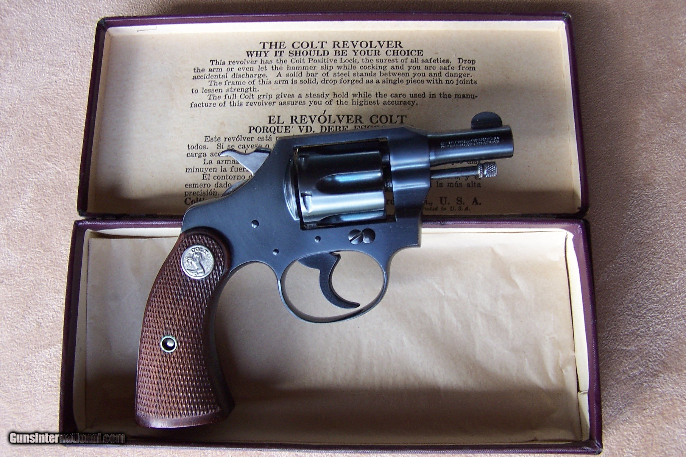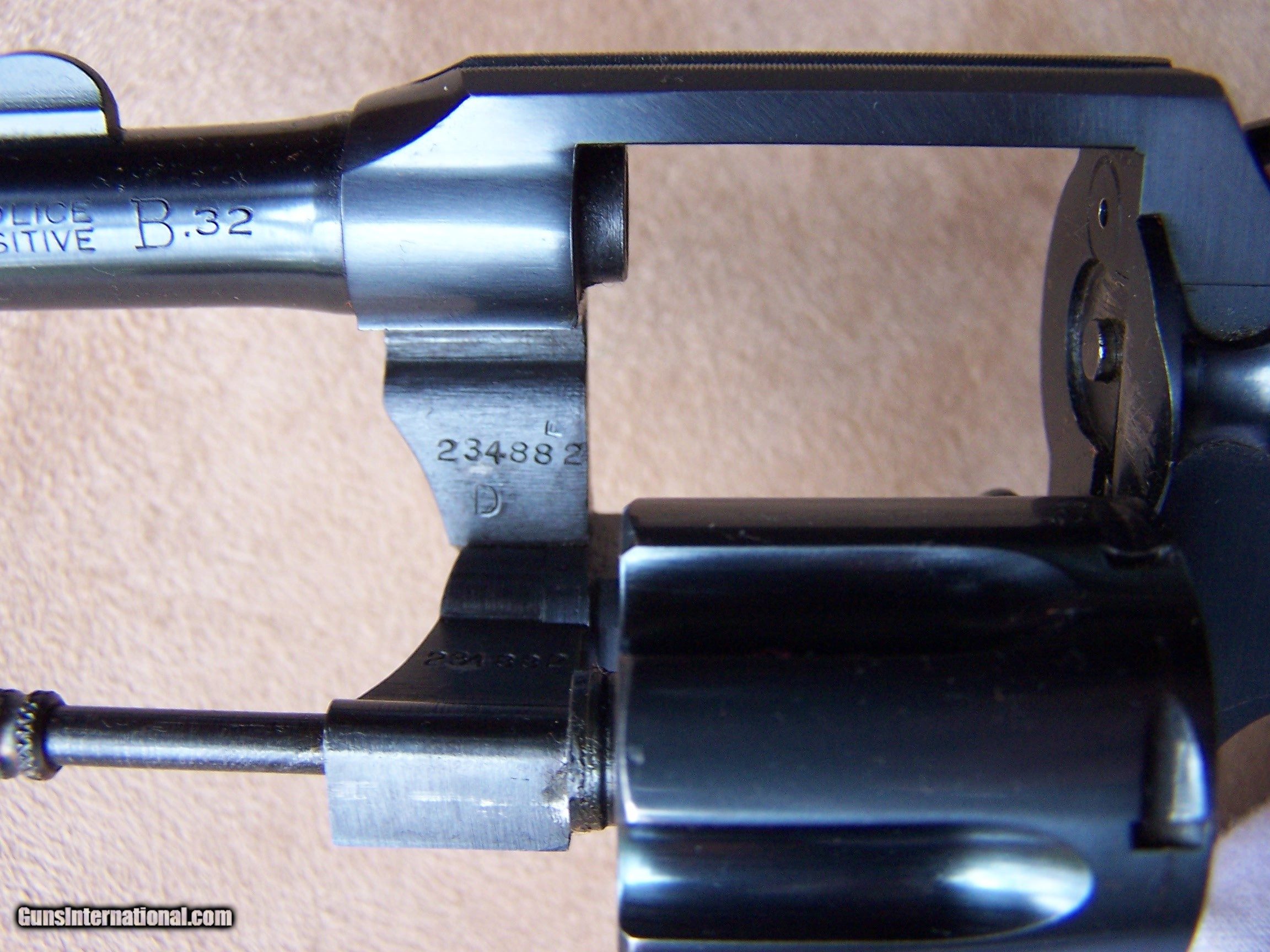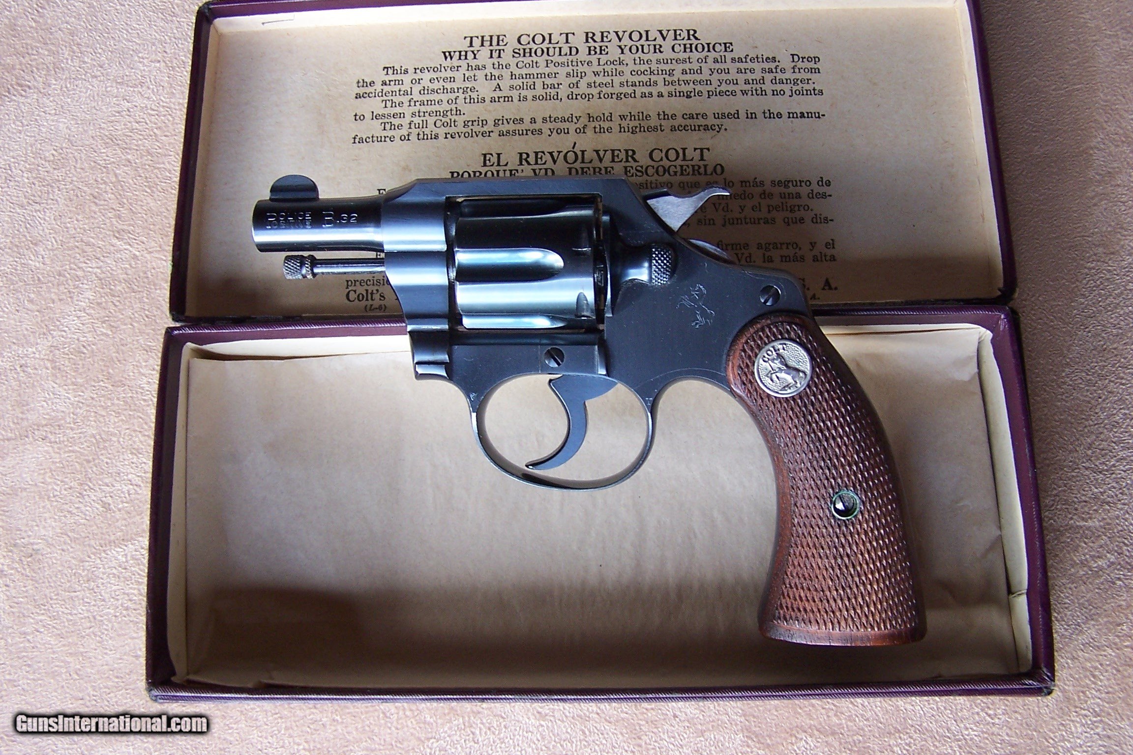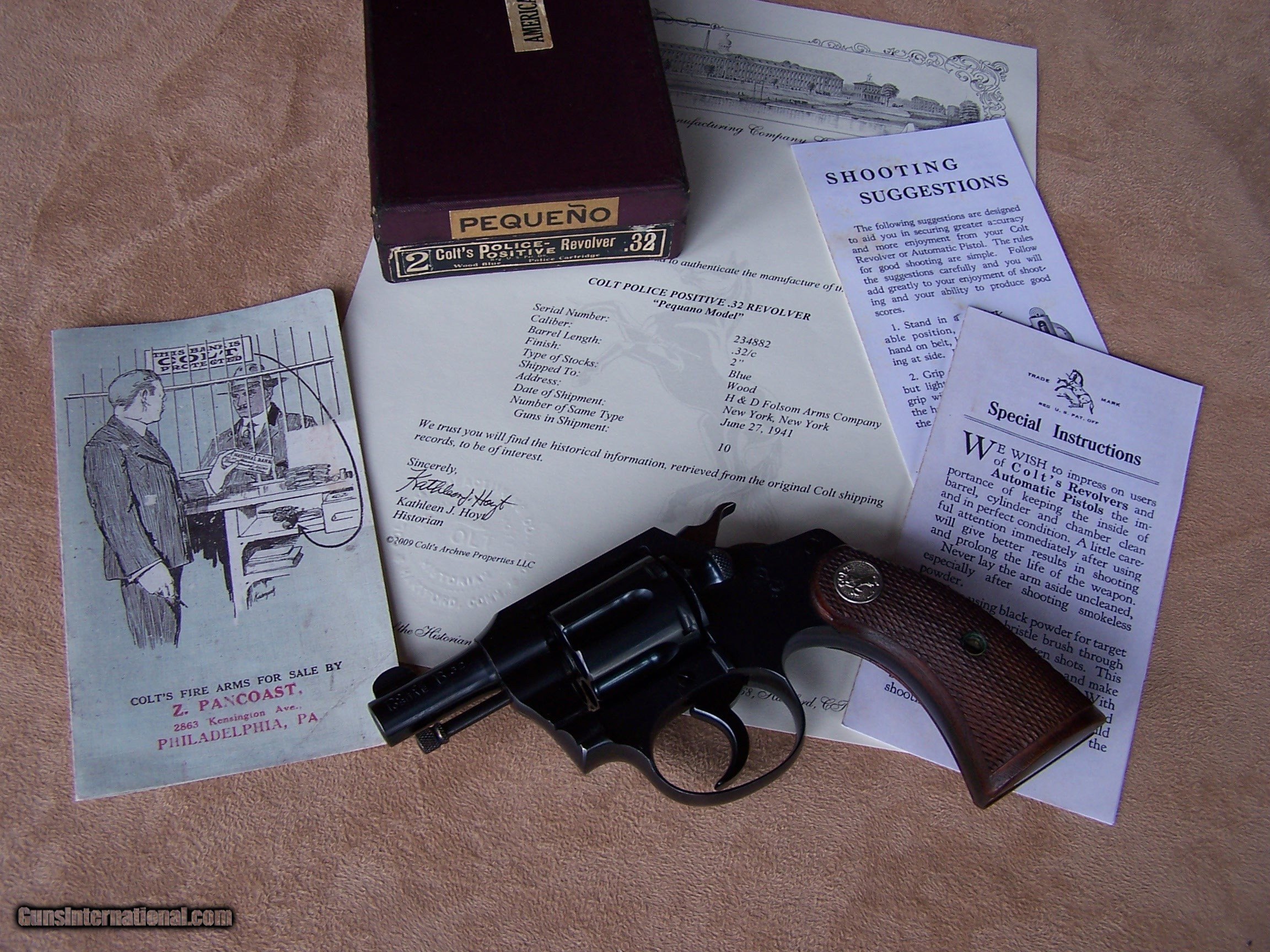 Description: Offered is a very rare Colt Pequeno model Police Positive .32 with the 2” barrel. This is one of only ten Pequeno models with the 2” barrel. These were produced by Colt for export to South America and chambered in .32 Police Cartridge (.32 S&W). They were all made on the smaller .32 frame and most were offered with a 2 1/2”, 4”, 5” or 6” barrel length. The barrels on the Pequeno models were marked Police Positive B .32 and serialized between S/N 226,000 & S/N 237,000 range. The word Pequeno means little one in Spanish. This one remains in its original factory box serialized to the gun. The factory box remains in excellent plus condition and void of any broken corners, tears or box damage. It also has the Colt brochures in the box. The factory Colt Archive letter is also included. These 2” examples were shipped to H&D Folsom Arms Company in New York City in June of 1941. The gun remains in new and unused & unfired condition with 99% of its original Colt factory blue finish. The original Colt factory checkered wood grips remain in 99% condition. This is the rarest and best condition Police Positive Pequeno that we have ever encountered. This gun is over 50 years old and meets the requirements of the C&R license. I offer a three-day non-firing inspection period and always want the buyer to be satisfied with their purchase. The gun will be packed correctly in a hard rifle case and shipped with insurance to your FFL dealer in the continental United States for $65 (California is extra because I have to ship through my local dealer). This gun requires a C&R or FFL license for transfer. I ship the following day after the payment arrives and provide tracking information. Please see my other collectible firearms that I have listed. Thanks for your interest and please let me know if you have any questions. Price is $3,850.00 plus shipping. Please Note: A same as cash price Lay-A-Way plan is available on this gun. Please call to discuss. Important Note: If you want to insure buying this and prevent anyone else from getting it ahead of you just Click on the Blue BUY-NOW button to the right of the price below as this closes the . SOLD Curio/Relic: Yes Handgun Caliber: .32 S&W Long (.32 Colt New Police) Manufacturer: Colt Model: Police Positive Pequeno Serial Number: 234882 Barrel Length: 2 Condition: 99%+ Metal Condition: 99% Wood Condition: 99% Bore Condition: As New Finish: Original Colt Bluing Manufacture Date: June 1941 Extras: Original Colt factory box Item Location: Tennessee |