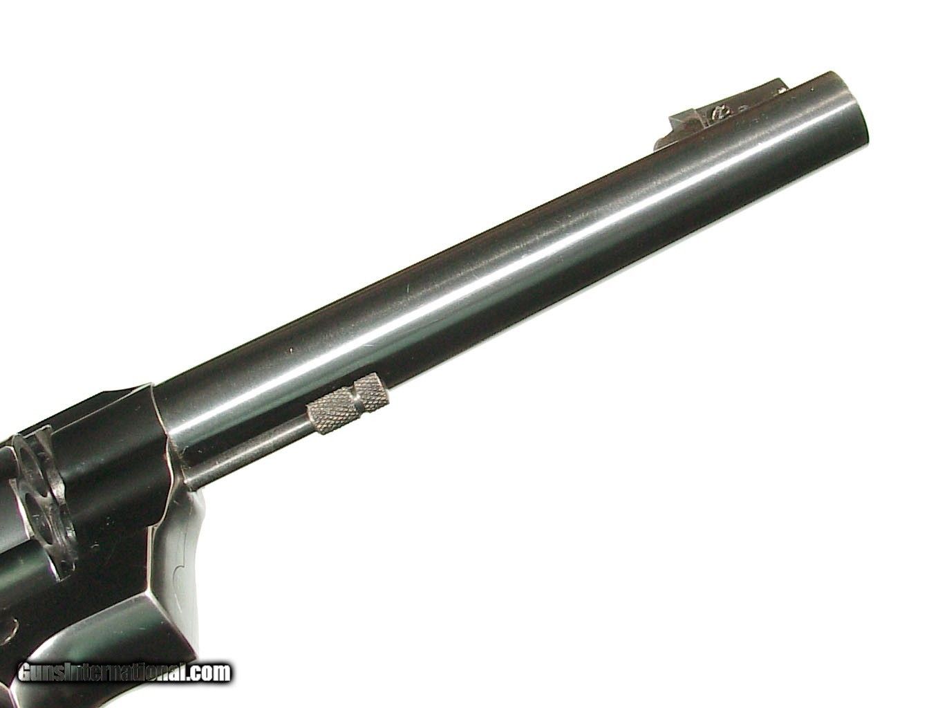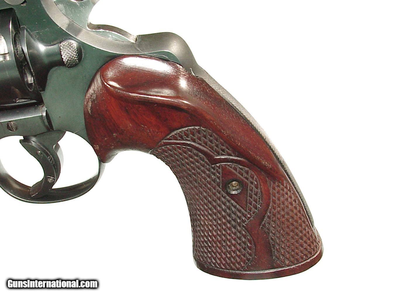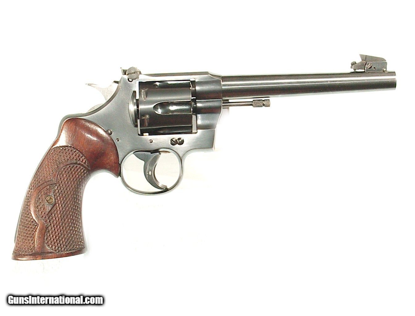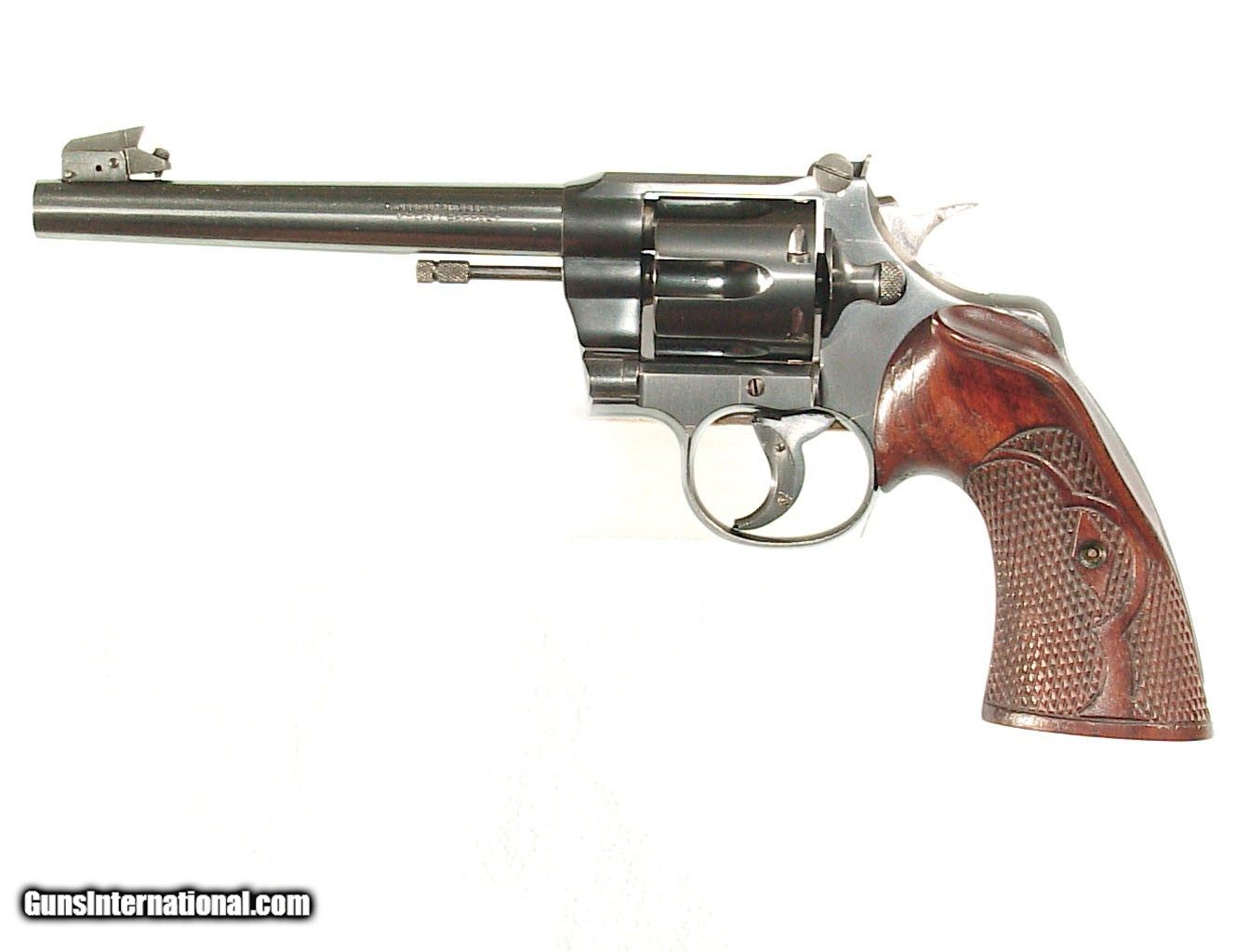 Description: .38 special caliber, 6" HEAVY BARREL, finished blue overall. Fitted with Roper grips and King's patent adjustable front and rear sights. Retaining 99% original factory blue. Butter smooth action. Very desirable. SOLD Curio/Relic: Yes |