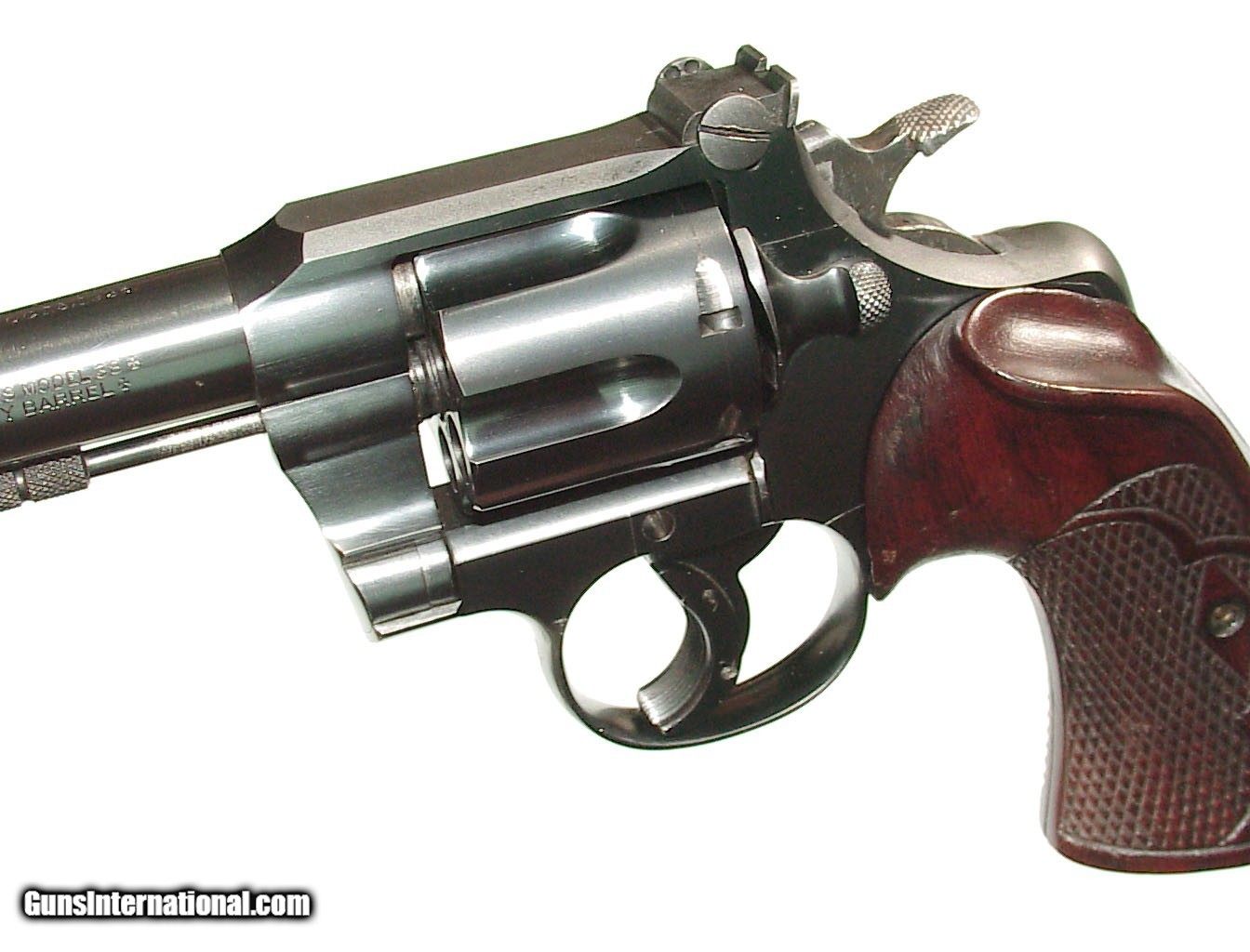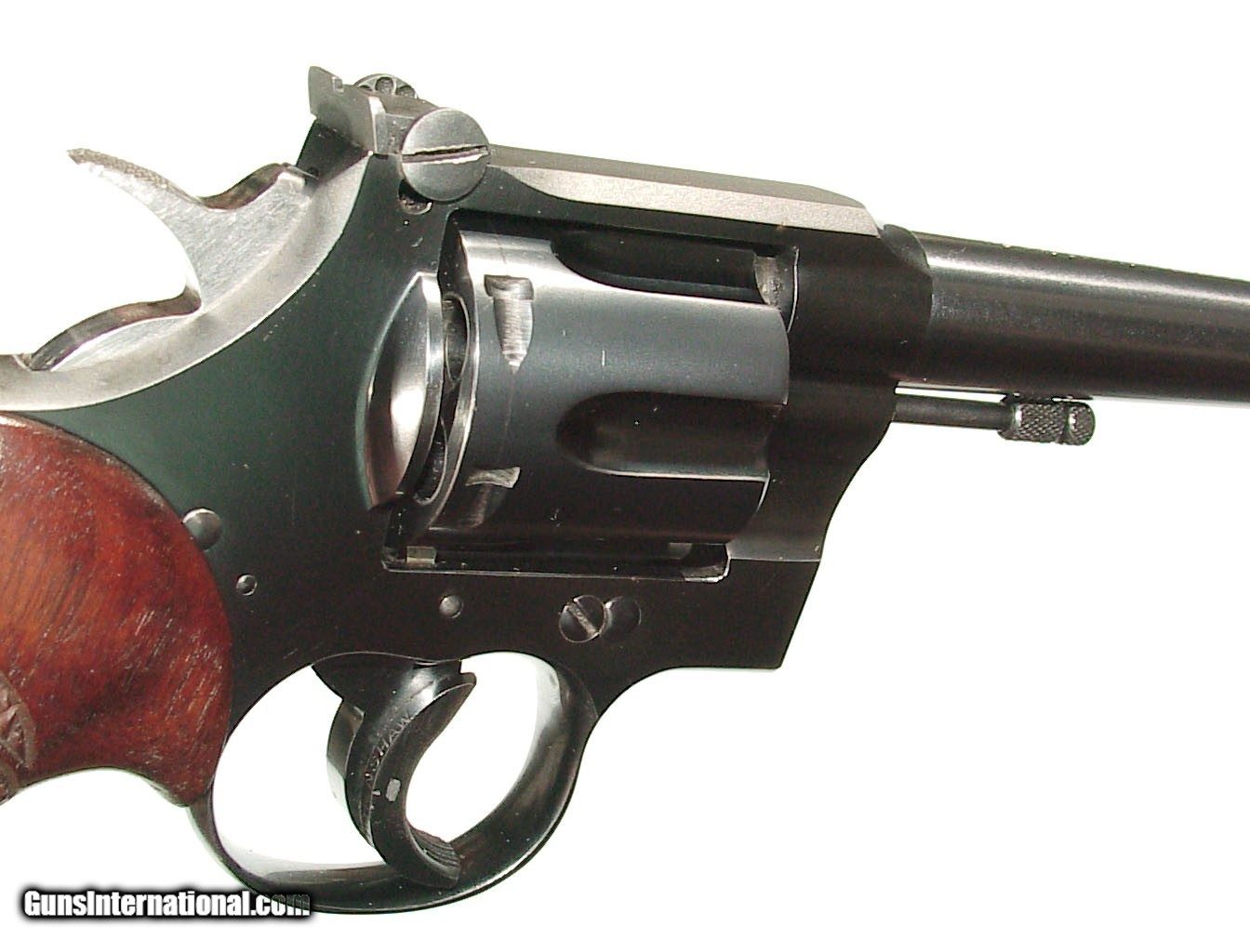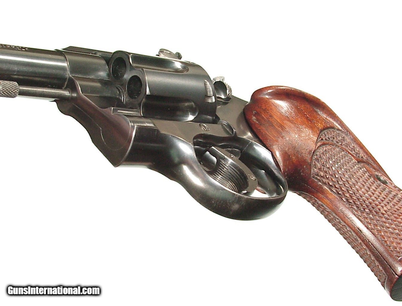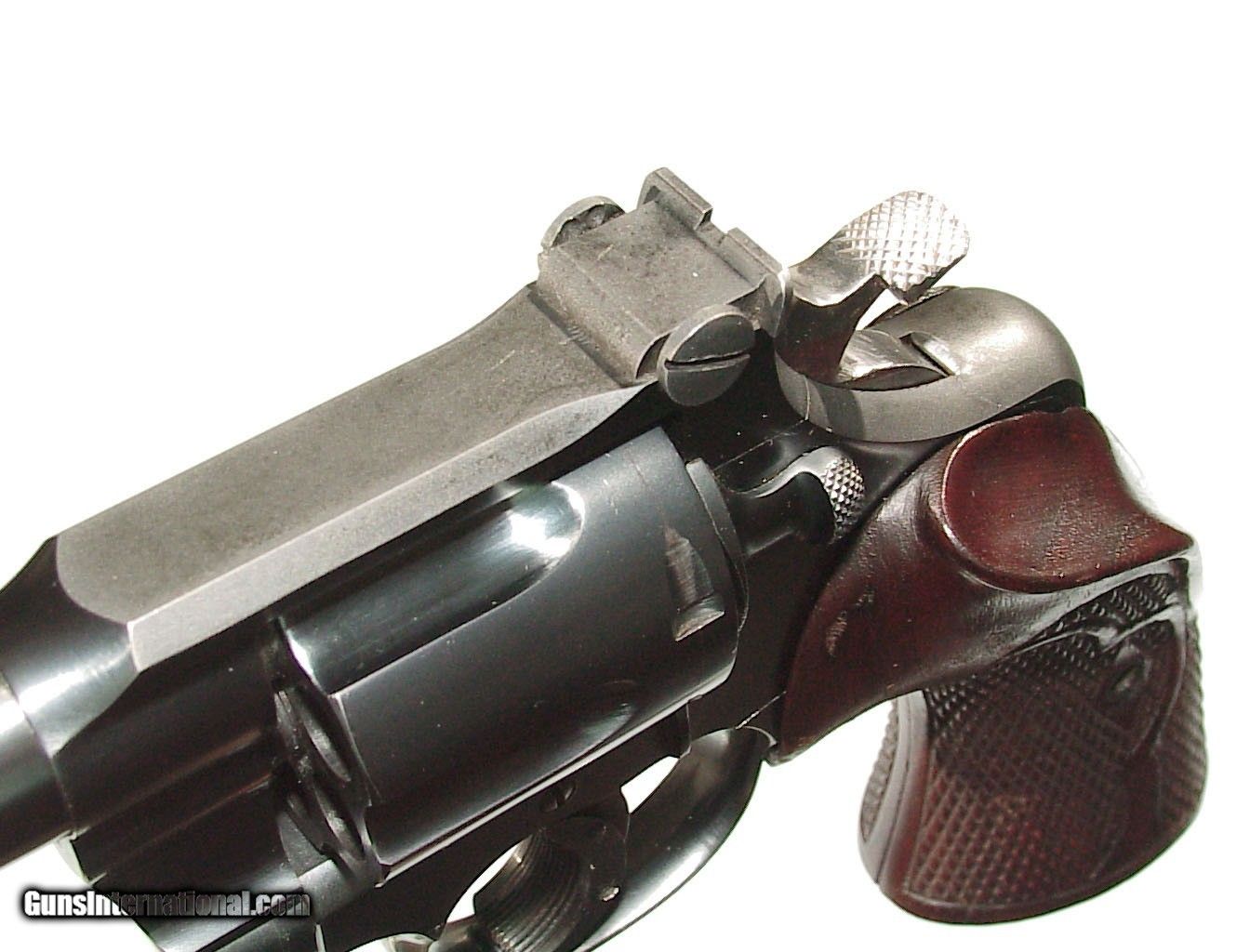 Description: .38 special caliber, 6" HEAVY BARREL, finished blue overall. Fitted with Roper grips and King's patent adjustable front and rear sights. Retaining 99% original factory blue. Butter smooth action. Very desirable. SOLD Curio/Relic: Yes |