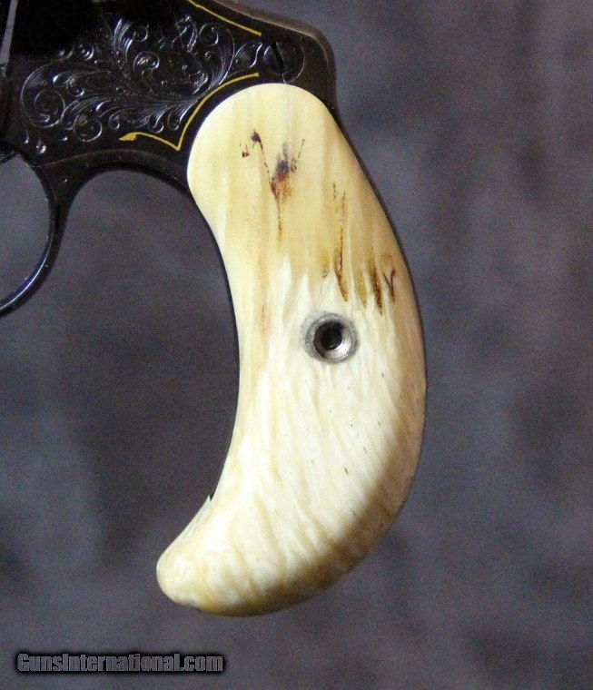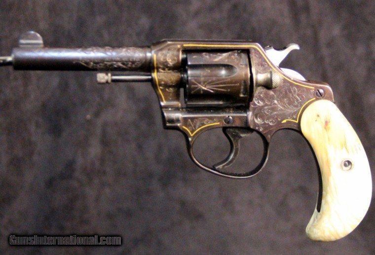 Description: ".32 Police Ctg", #90492, 3 1/2 inch barrel, blue finish with gold inlays, signed with a stylized "AP" on left side of frame, custom horn 2 piece grips, 1920. Condition: excellent bore, 99% overall as was professinally refinished after engraving. SOLD Curio/Relic: Yes |