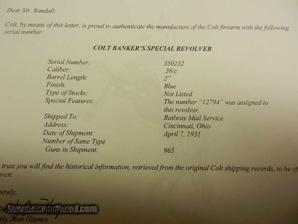 Exc. 1931 Colt Banker's Special, ,38 cal., Colt Letter, Shipped to Railway Mail Service