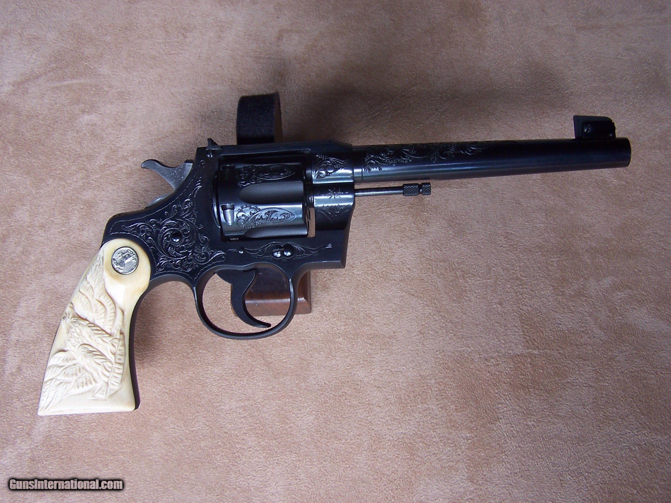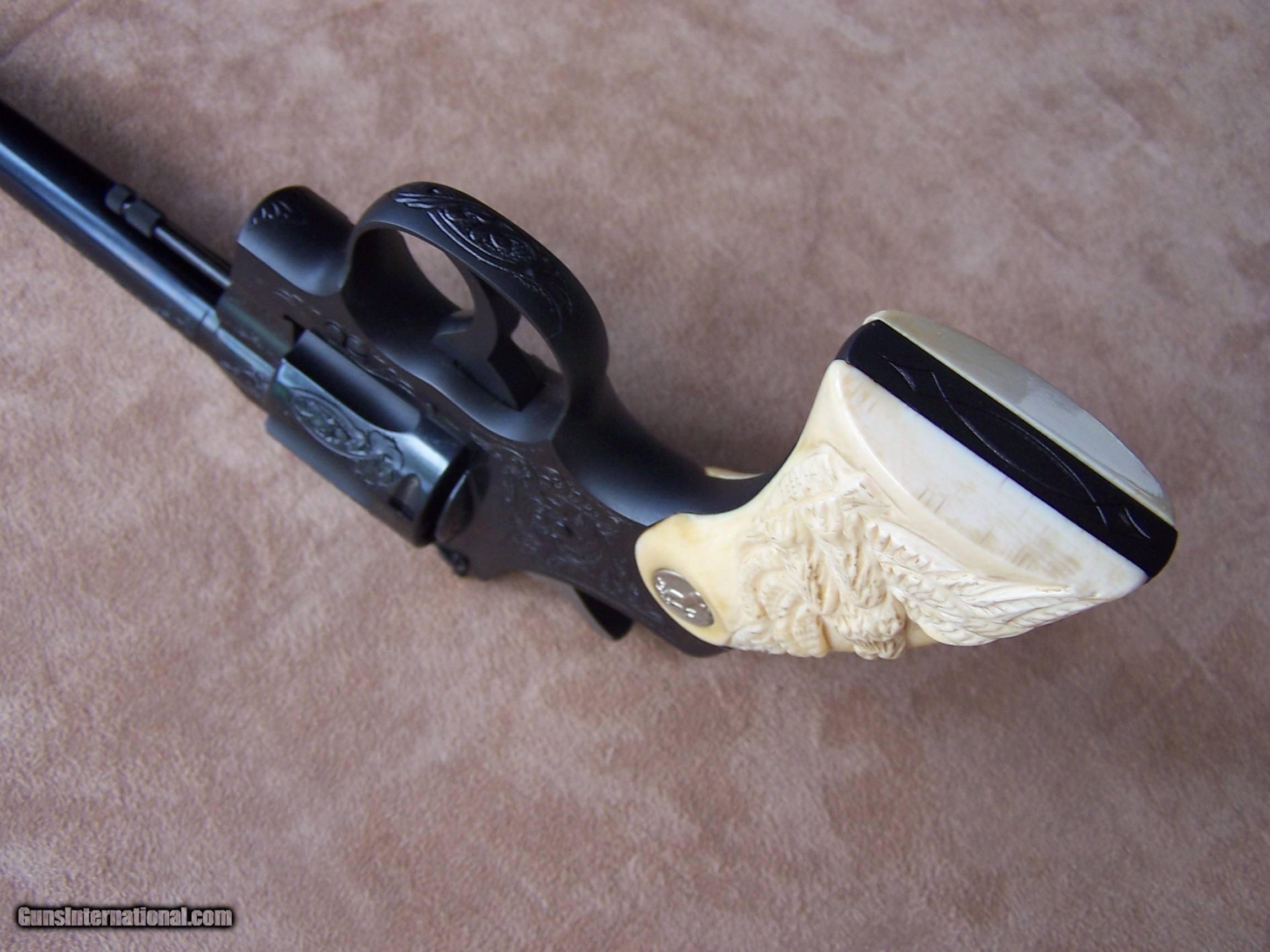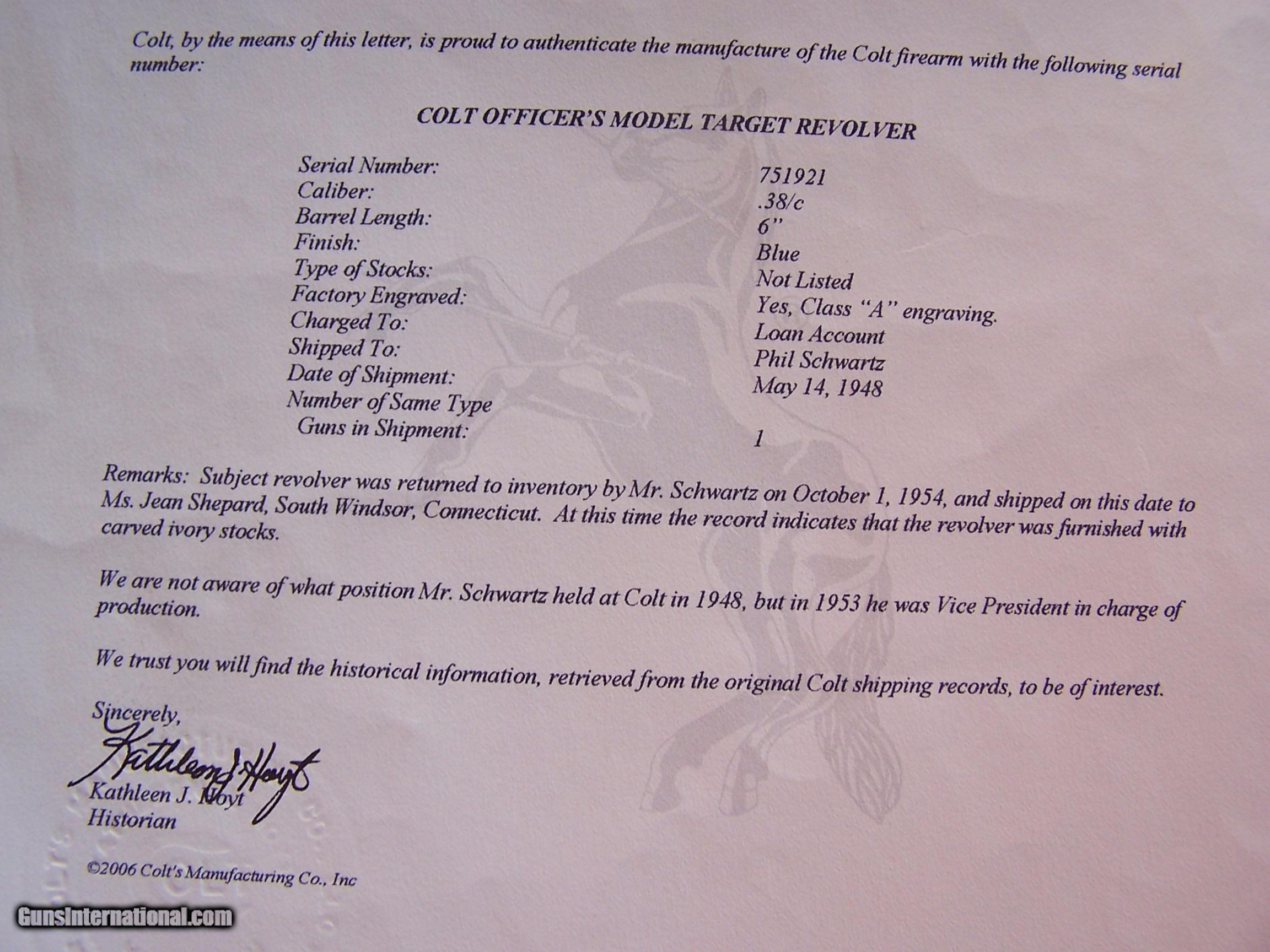 Description: This factory engraved Colt Officers Model Target was produced in May of 1948 and retained by Phil Schwartz, Vice President of Colt, until 1954. Presumably, it was used as a display gun at the Colt factory. In October of 1954, the gun was purchased by Ms. Jean Shepard of Windsor, Connecticut, and remained in her family until I purchased the gun from them. Essentially I am the second owner of the gun and can attest to the fact that the gun has never been fired since leaving the Colt factory. It remains in new condition less the box and paperwork which to my understanding was lost many years ago. The gun is chambered in .38 Special and has the 6” heavy barrel. It has the factory-installed carved ivory stocks with the carved eagle on the right side. A Colt factory letter will be included with the gun. The gun has class “A” engraving however it seems more like “B” engraving to me. I assume that since it was going to be kept at the factory the engravers made sure it was done up to their best standards. This gun was part of my Colt Officers Model display and shown at the 2014 Colt Collector Association show in Concord, N.C. where it won the Best of Show award and again the following year at the NRA show in Nashville, TN. (See Photo’s) It was also shown on the cover of the winter edition of the Rampant Colt Magazine of which a copy will be provided with the gun. If you desire a top-of-the-line Colt revolver that is in superb condition with lots of eye appeal then I think you have found it. This gun is for the advanced collector and for those who are interested please call and I would be happy to discuss the gun further. I offer a three-day non-firing inspection period and always want the buyer to be satisfied with their purchase. The gun will be packed correctly and shipped via FedEx Air with insurance to your FFL dealer in the continental United States free of charge. This gun requires a C&R or FFL license for transfer. I ship promptly after the funds are received and provide tracking information. Please see my other Colts and various collectible firearms that I have listed. Thanks for your interest and please let me know if you have any questions. Price is $26,500.00 plus shipping. Please Note: A same as cash price Lay-A-Way plan is available on this gun. Please call to discuss. Sold Pending Funds SOLD Curio/Relic: Yes Manufacturer: Colt Model: Officers Model Target Serial Number: 751921 Barrel Length: 6 Condition: As New Metal Condition: As New Bore Condition: As New Barrel Type: Heavy Barrel Action: Double Action Finish: Colt Factory Bluing W/Engraving Sights: Adjustable Target Manufacture Date: 5/14/1948 Engraving: Factory "A" Engraved Extras: Colt Factory Letter, Magazine Item Location: Tennessee |