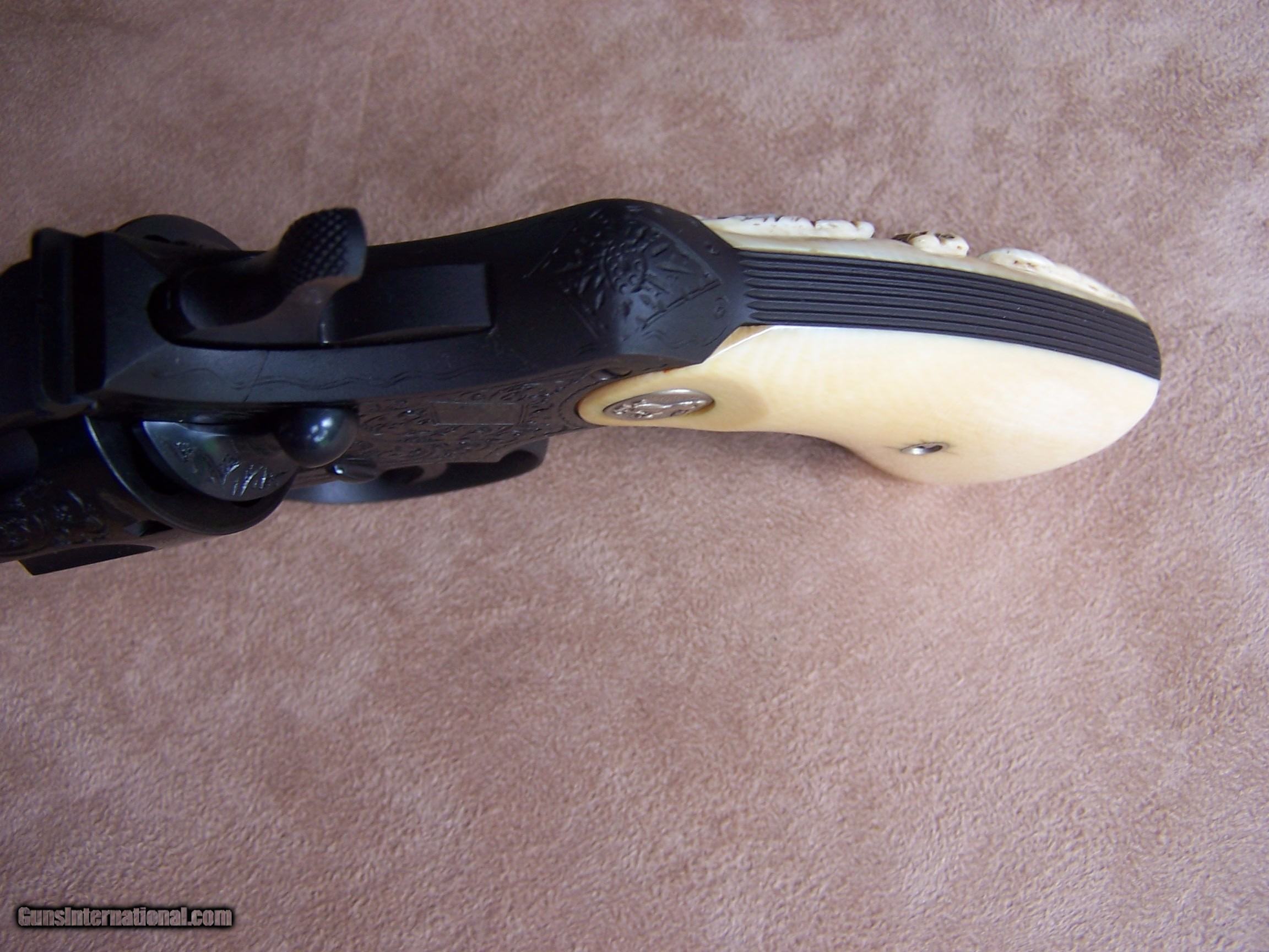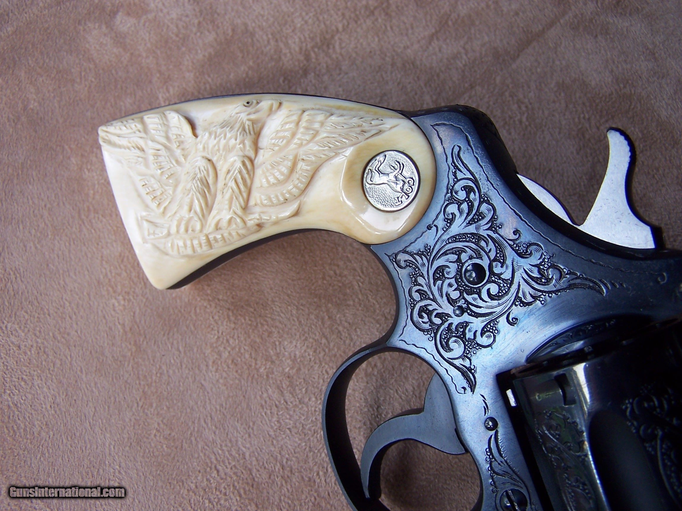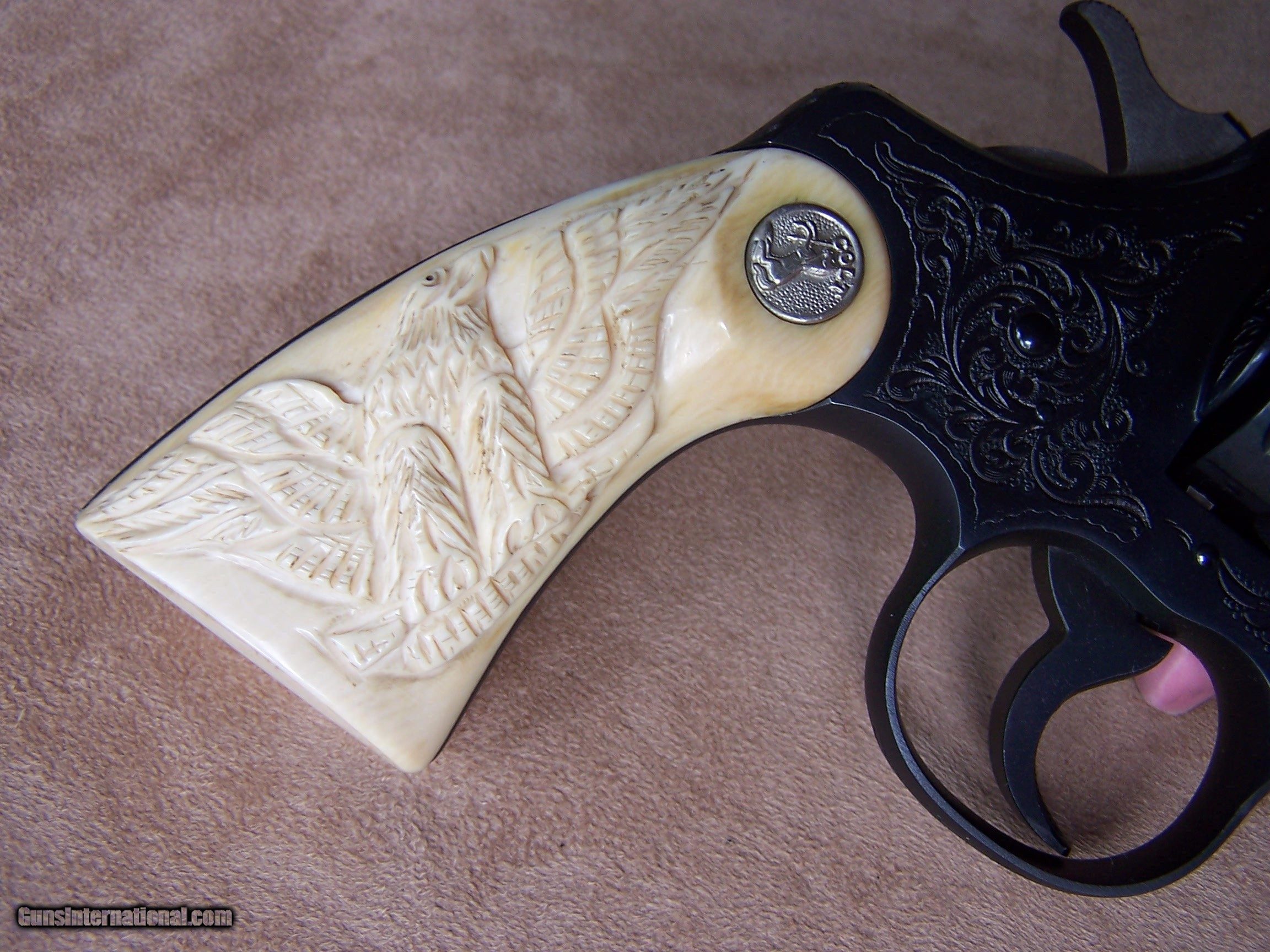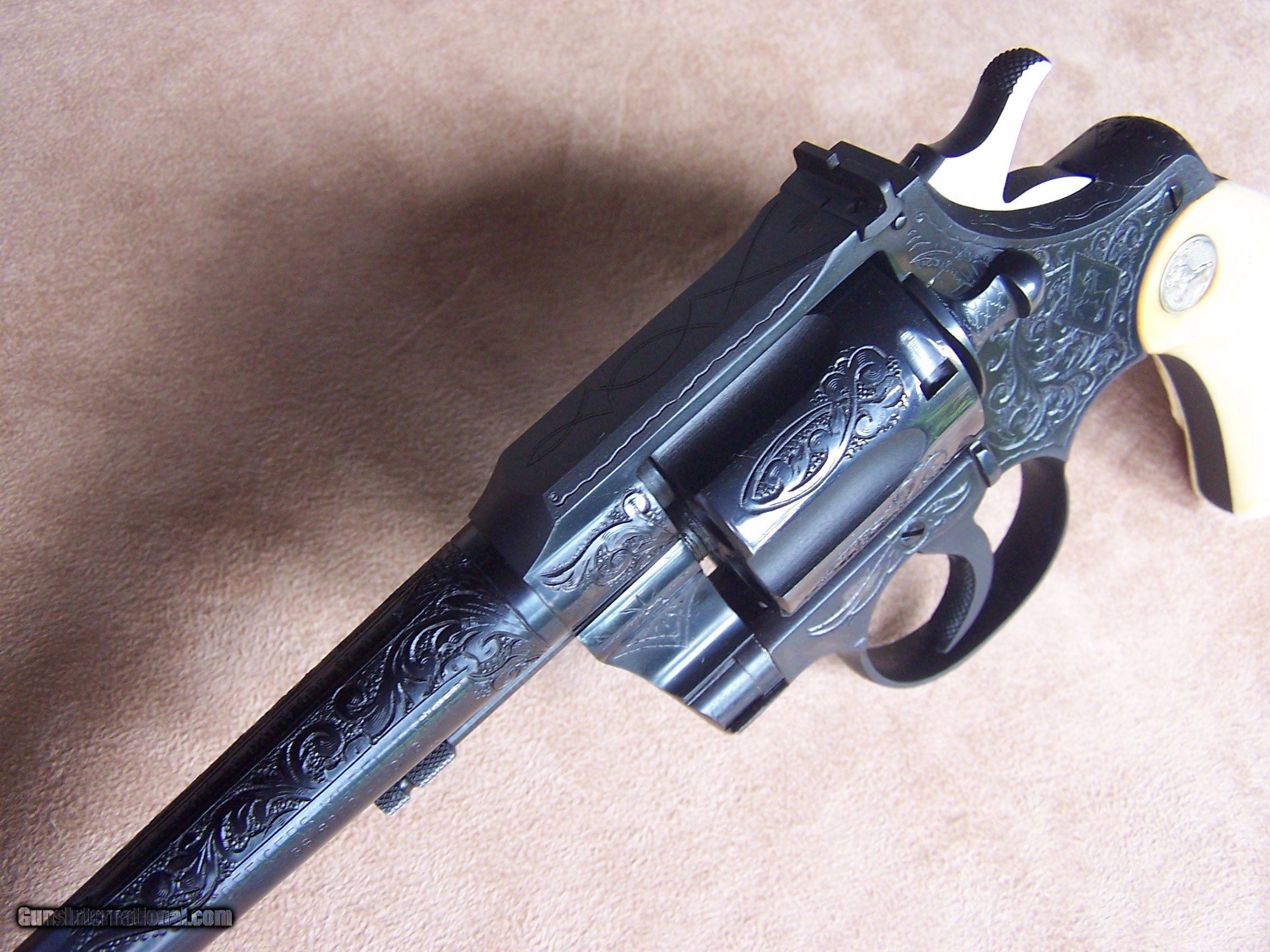 Description: This factory engraved Colt Officers Model Target was produced in May of 1948 and retained by Phil Schwartz, Vice President of Colt, until 1954. Presumably, it was used as a display gun at the Colt factory. In October of 1954, the gun was purchased by Ms. Jean Shepard of Windsor, Connecticut, and remained in her family until I purchased the gun from them. Essentially I am the second owner of the gun and can attest to the fact that the gun has never been fired since leaving the Colt factory. It remains in new condition less the box and paperwork which to my understanding was lost many years ago. The gun is chambered in .38 Special and has the 6” heavy barrel. It has the factory-installed carved ivory stocks with the carved eagle on the right side. A Colt factory letter will be included with the gun. The gun has class “A” engraving however it seems more like “B” engraving to me. I assume that since it was going to be kept at the factory the engravers made sure it was done up to their best standards. This gun was part of my Colt Officers Model display and shown at the 2014 Colt Collector Association show in Concord, N.C. where it won the Best of Show award and again the following year at the NRA show in Nashville, TN. (See Photo’s) It was also shown on the cover of the winter edition of the Rampant Colt Magazine of which a copy will be provided with the gun. If you desire a top-of-the-line Colt revolver that is in superb condition with lots of eye appeal then I think you have found it. This gun is for the advanced collector and for those who are interested please call and I would be happy to discuss the gun further. I offer a three-day non-firing inspection period and always want the buyer to be satisfied with their purchase. The gun will be packed correctly and shipped via FedEx Air with insurance to your FFL dealer in the continental United States free of charge. This gun requires a C&R or FFL license for transfer. I ship promptly after the funds are received and provide tracking information. Please see my other Colts and various collectible firearms that I have listed. Thanks for your interest and please let me know if you have any questions. Price is $26,500.00 plus shipping. Please Note: A same as cash price Lay-A-Way plan is available on this gun. Please call to discuss. Sold Pending Funds SOLD Curio/Relic: Yes Manufacturer: Colt Model: Officers Model Target Serial Number: 751921 Barrel Length: 6 Condition: As New Metal Condition: As New Bore Condition: As New Barrel Type: Heavy Barrel Action: Double Action Finish: Colt Factory Bluing W/Engraving Sights: Adjustable Target Manufacture Date: 5/14/1948 Engraving: Factory "A" Engraved Extras: Colt Factory Letter, Magazine Item Location: Tennessee |