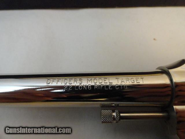 What can I say about this rare gun. It is an Officers Model Target .22 with 6" barrel and nickel finish with matching number box, proper end label with nickel/wood sticker, matching number test target and original booklet. We talked to Paul at Colt about this gun as it is listed in records as a blue gun yet the work is all Colt and several Colt guys agree that this finish is just not being done by anybody else. The markings, the two tone finish, no signs of any polishing , etc, etc. Factory error, nickeled upon request before shipping, returned to Colt? No work records exist but when you look at this gun, you know it is first hand Colt work. Just like the early post war 1911 nickel guns, The top strap, bottom of receiver and trigger guard and flutes have the non glare new finish as advertised by Colt being introduced on the new post war model guns. Gun shows no signs of having ever seen a single round since the five test rounds. This is the first nickel officers model we have ever seen or heard of which might help explain that it was made as blue , then special ordered nickel at Colt. Even the numbered matching box is in near mint condition. You be the judge as it is the most handsome looking Officers model we have ever seen and in completely unfired mint condition. C&R