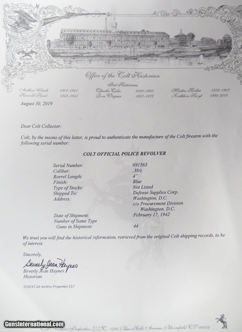 Description: Colt Official Police Revolver; Serial No. 691563; .38 Caliber; 4” Barrel; Blue Finish; Per Factory Letter – Shipped to Defense Supplies Corp. Washington, D.C. c/o Procurement Division on February 17, 1942; Part of a 44 Gun Shipment; During WWII, Domestic Law Enforcement Agencies Could Not Purchase Weapons Directly and Had to Purchase Through Defense Supplies Corp.; Most of the Original Blue Finish Remains; Good Grips, Perfect Bore and Action; See All Photos for Condition; No Texts; Call (254)541-5765 or Email Only; PERSONAL PROPERTY of Harold Wieser; Price: $900 + $45 S&H Via USPS PRIORITY MAIL; Payment Address: Harold Wieser - 1466 U.S. Hwy 77 - Rosebud, TX 76570; SEND PAYMENTS VIA USPS PRIORITY MAIL; SOLD Manufacturer: Colt Model: Official Police Serial Number: 691563 |