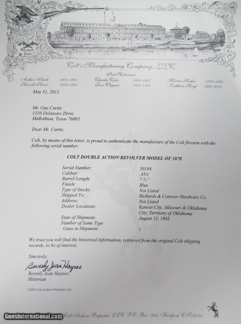 Description: Colt Model 1878 Revolver; Serial No. 50194; Per Included Factory Letter: .45 Caliber, Blue Finish with 7 ½” Barrel and Shipped to Richards & Conover Hardware Co. of Oklahoma City, Territory of Oklahoma on August 11, 1903 in a One Gun Shipment; Nearly All Brilliant Original Factory Blue Remains; Great Original Grips; Hard to Improve on; Great 118 Year-Old Oklahoma Territory Colt; See All Photos for Condition; No Texts; Call (254)541-5765 or Email Only; PERSONAL PROPERTY of Harold Wieser; Price: $6,975 + $45 S&H Via USPS PRIORITY MAIL; Payment Address: Harold Wieser - 1466 U.S. Hwy 77 - Rosebud, TX 76570; SEND PAYMENTS VIA USPS PRIORITY MAIL; BEWARE of SCAMS!!! – DO NOT SEND MONEY or CORRESPONDENTS ELECTRONICALLY UNLESS YOU HAVE SPOKEN to HAROLD WIESER FIRST! 254-541-5765 SOLD Manufacturer: Colt Model: 1878 Serial Number: 50194 |