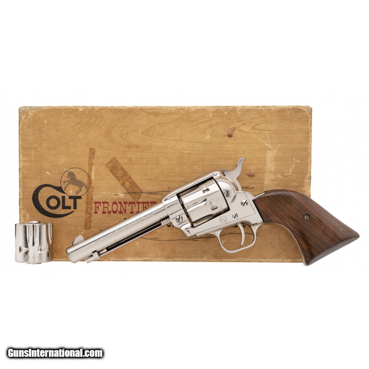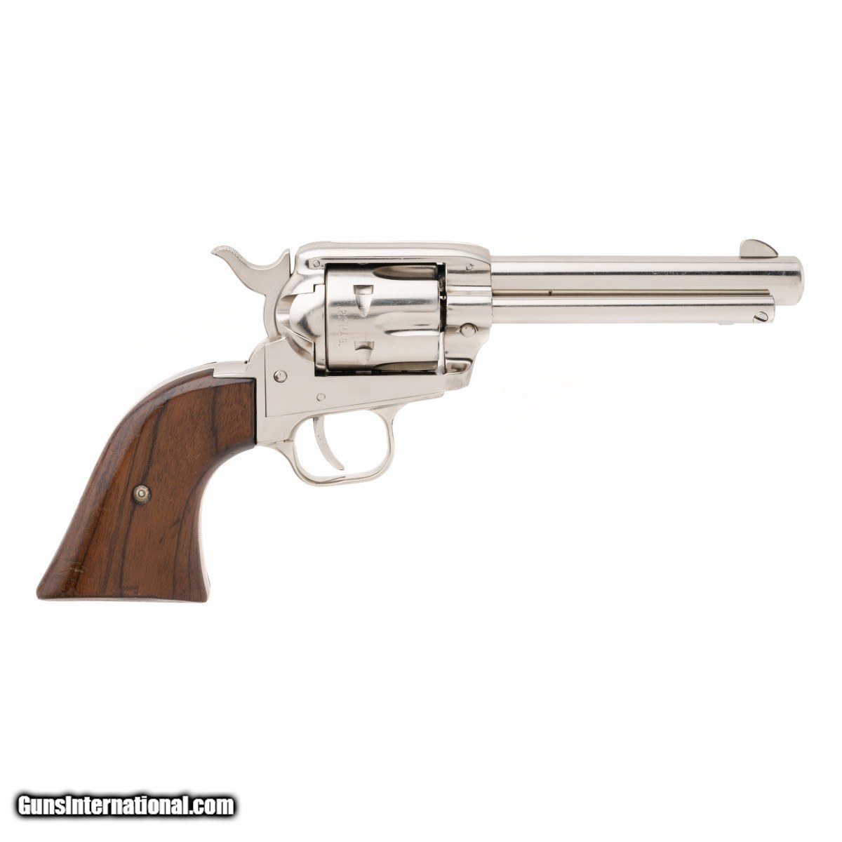 Description: " SN: 33459K. Made in 1967. .22 with a 4.75"" barrel. Bore is very good. Single action .22 revolver with an additional cylinder for .22 LR. Nickel finish is in very good condition. Grips light handling wear. Revolver comes with additional cylinder and box. Overall very good condition. SOLD |