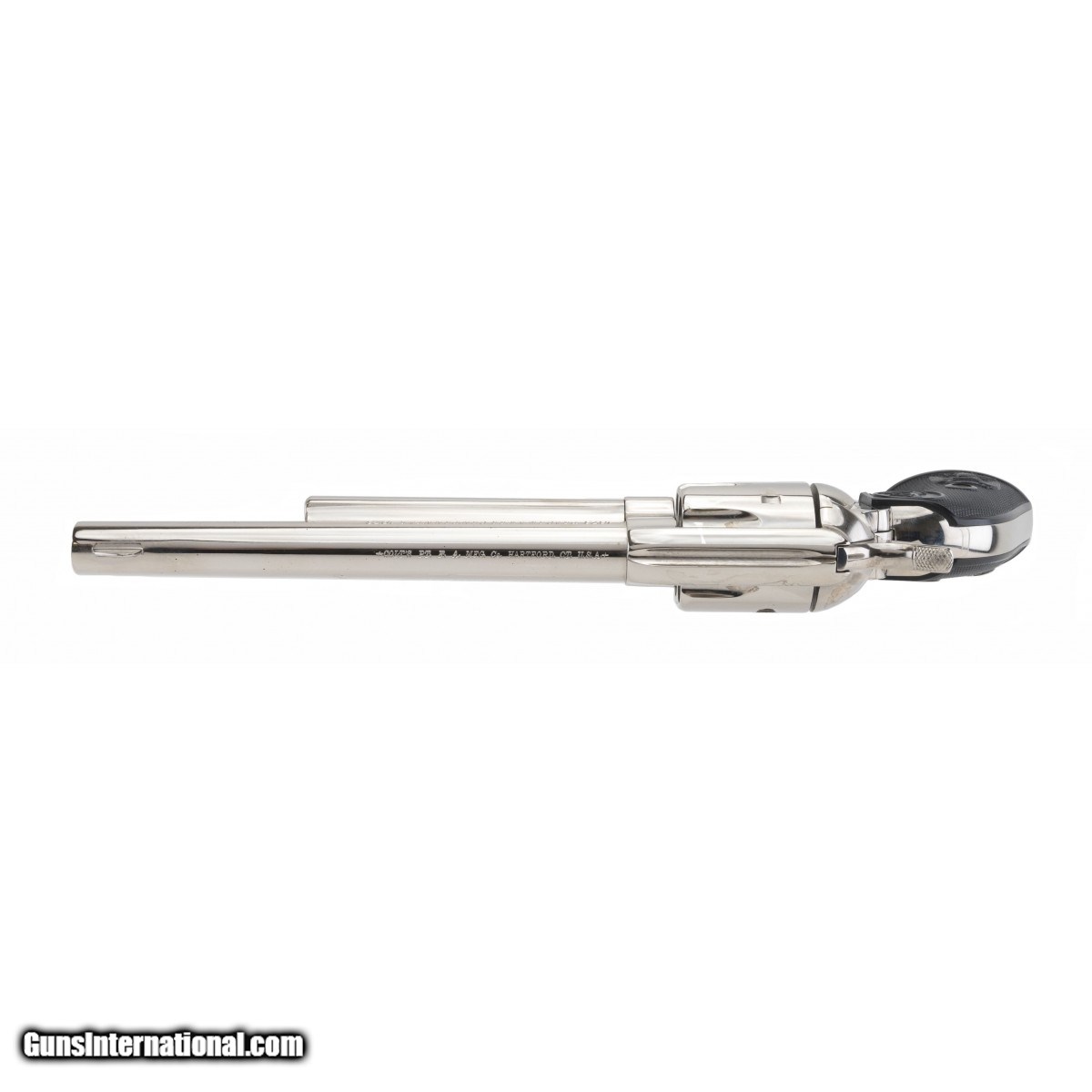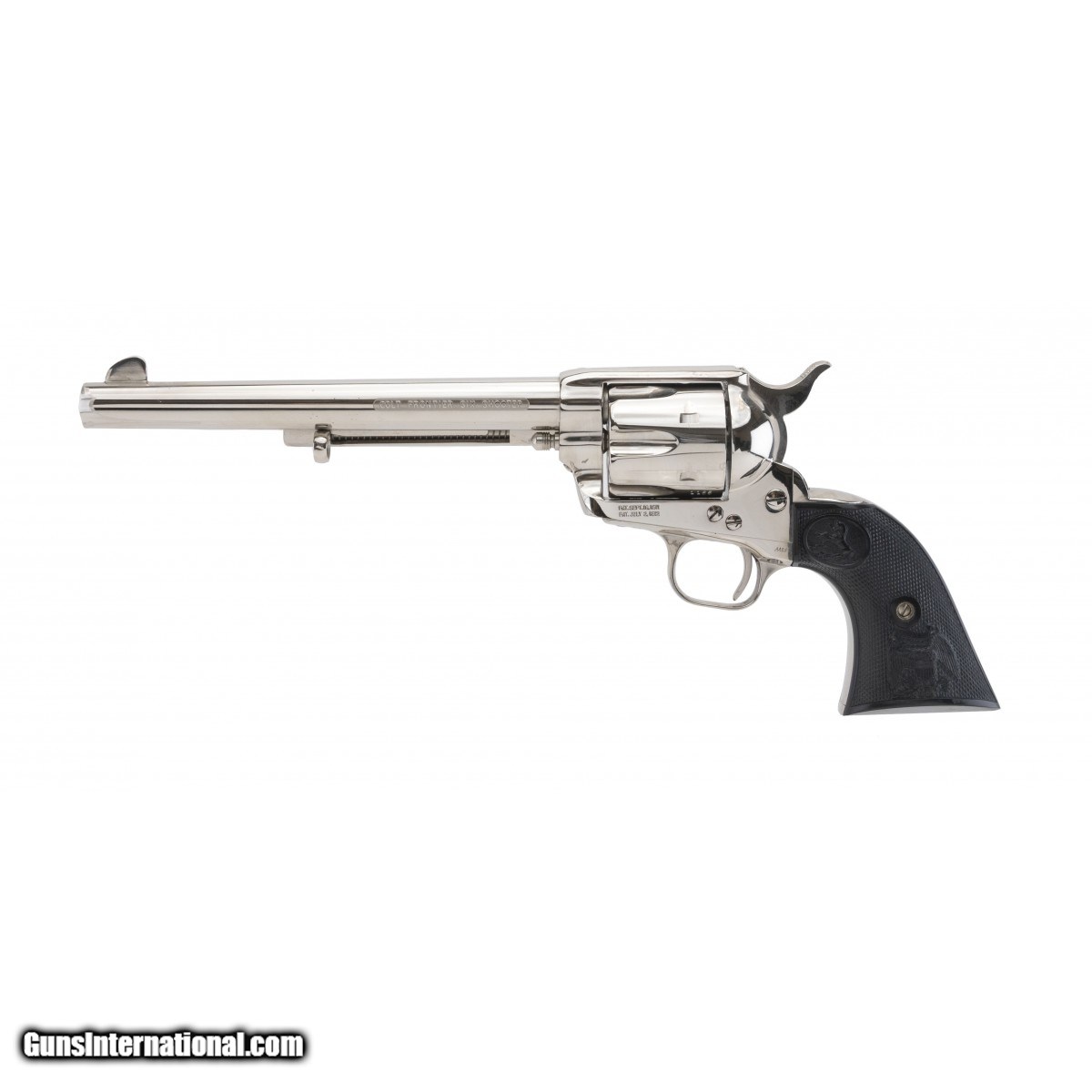 Description: " 1973 issue 100th Anniversary commemorative. Revolver has nickel plated finish with 7.5"" barrel with etched panel on left side and is marked ""1873 Peacemaker Centennial 1973"" on right side. Excellent overall condition with presentation case. SOLD |