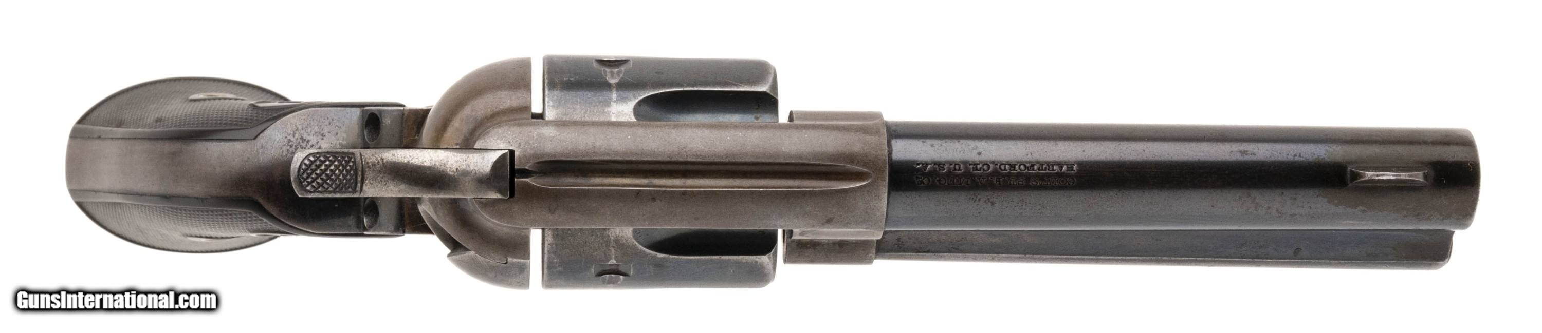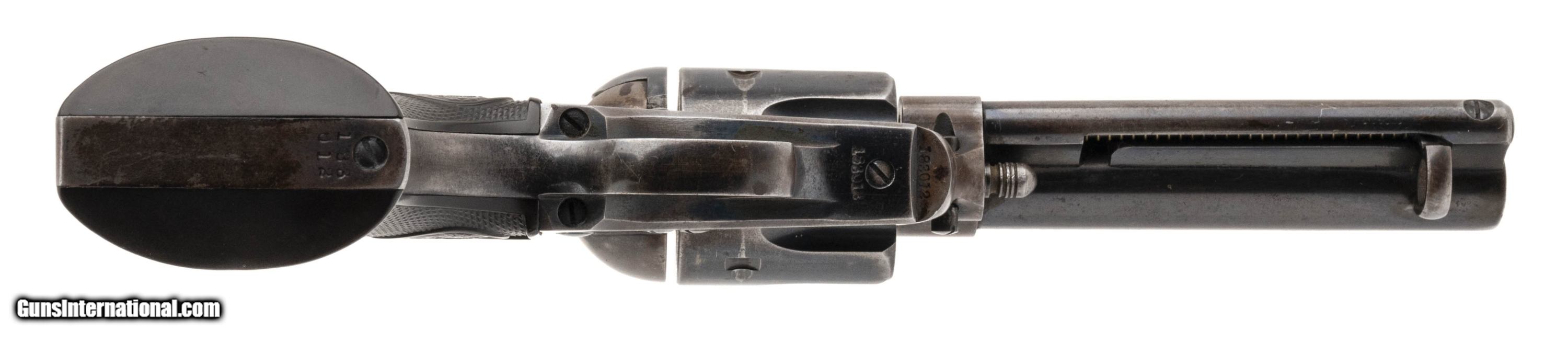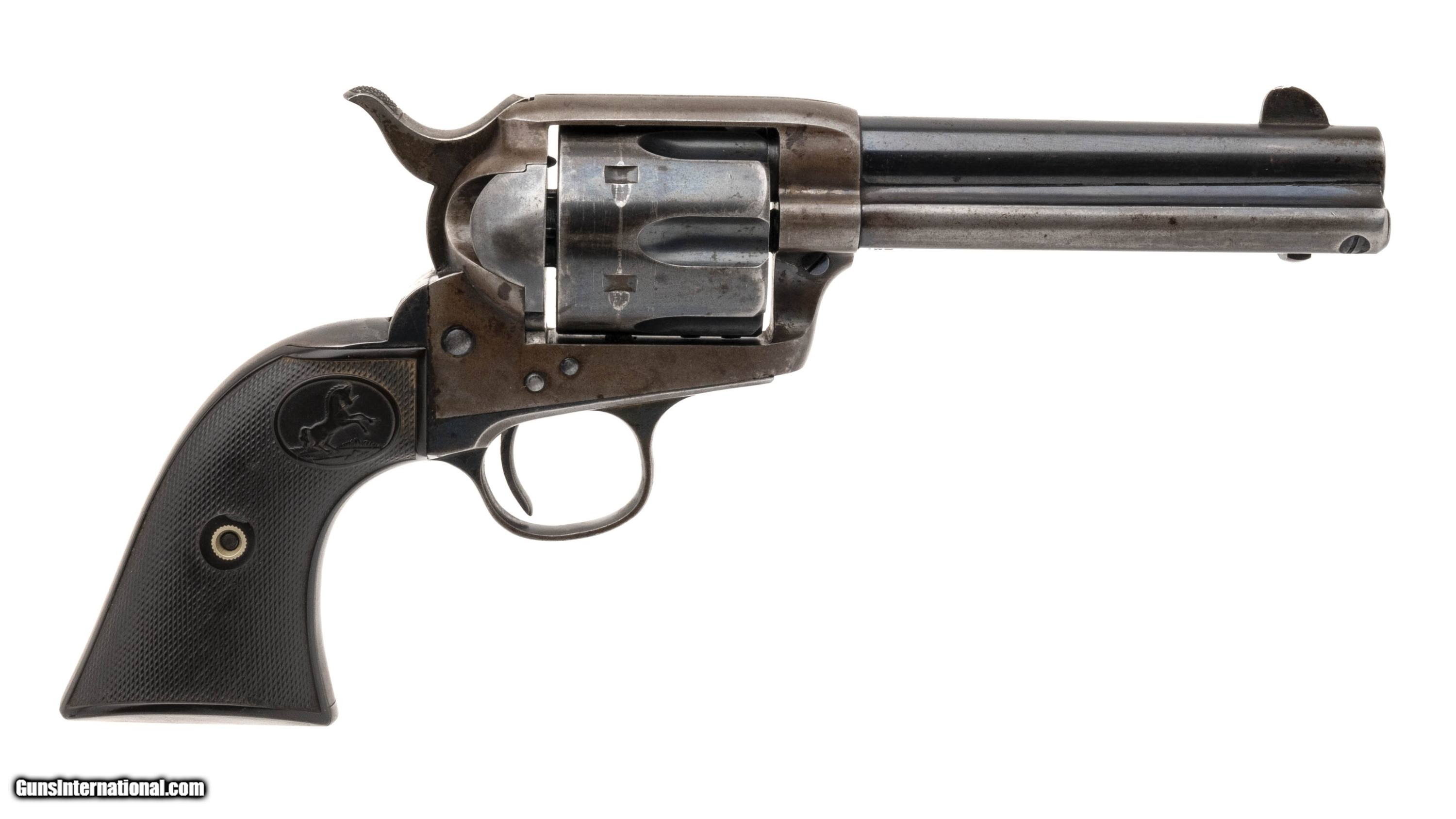Description: "SN: 183012. 1st Generation Single Action Army made by Colt in 1899. 4.75"" barrel with .44-40 cylinder. Good condition with about 40% of blue remaining on barrel, cylinder, trigger guard and backstrap. Frame is mostly brown patina, and backstrap has a dark patch of cleaned rust behind the serial. Bore is excellent with light frosting just past the forcing cone and strong rifling. Action times and functions correctly with good lockup. Grips and grip screw a later replacement. Frame, trigger guard and backstrap have matching serials. Austin location. SOLD Curio/Relic: Yes |