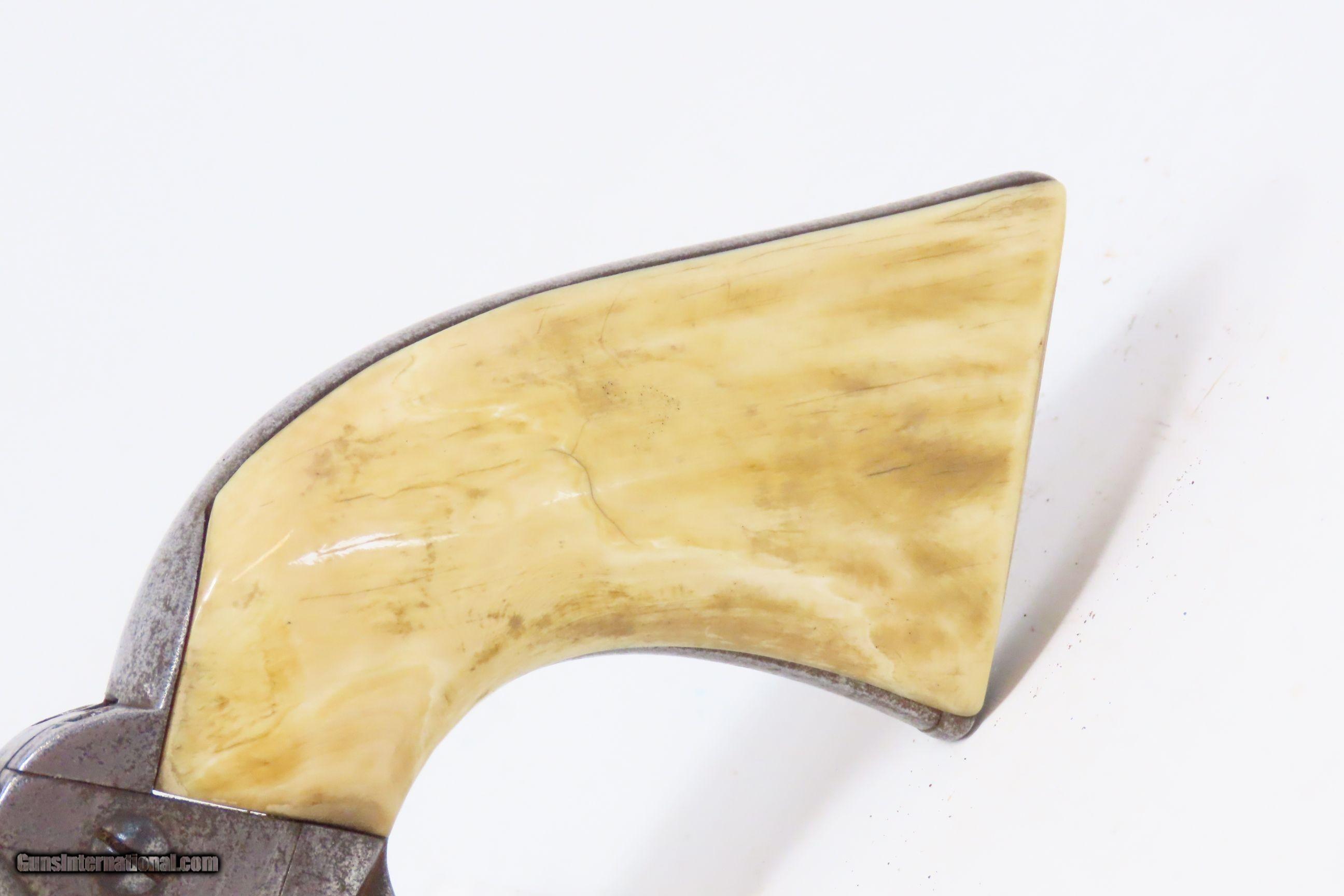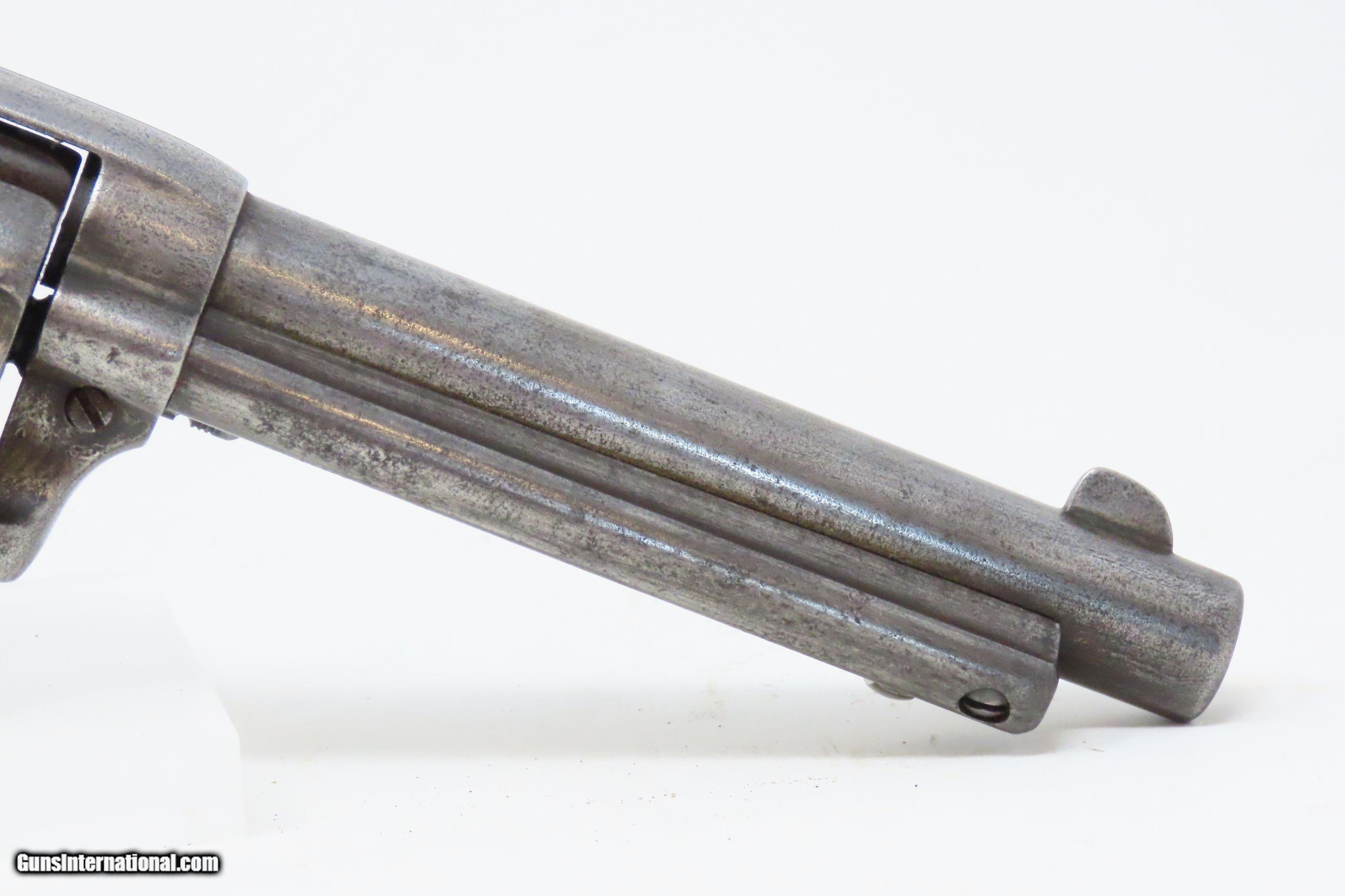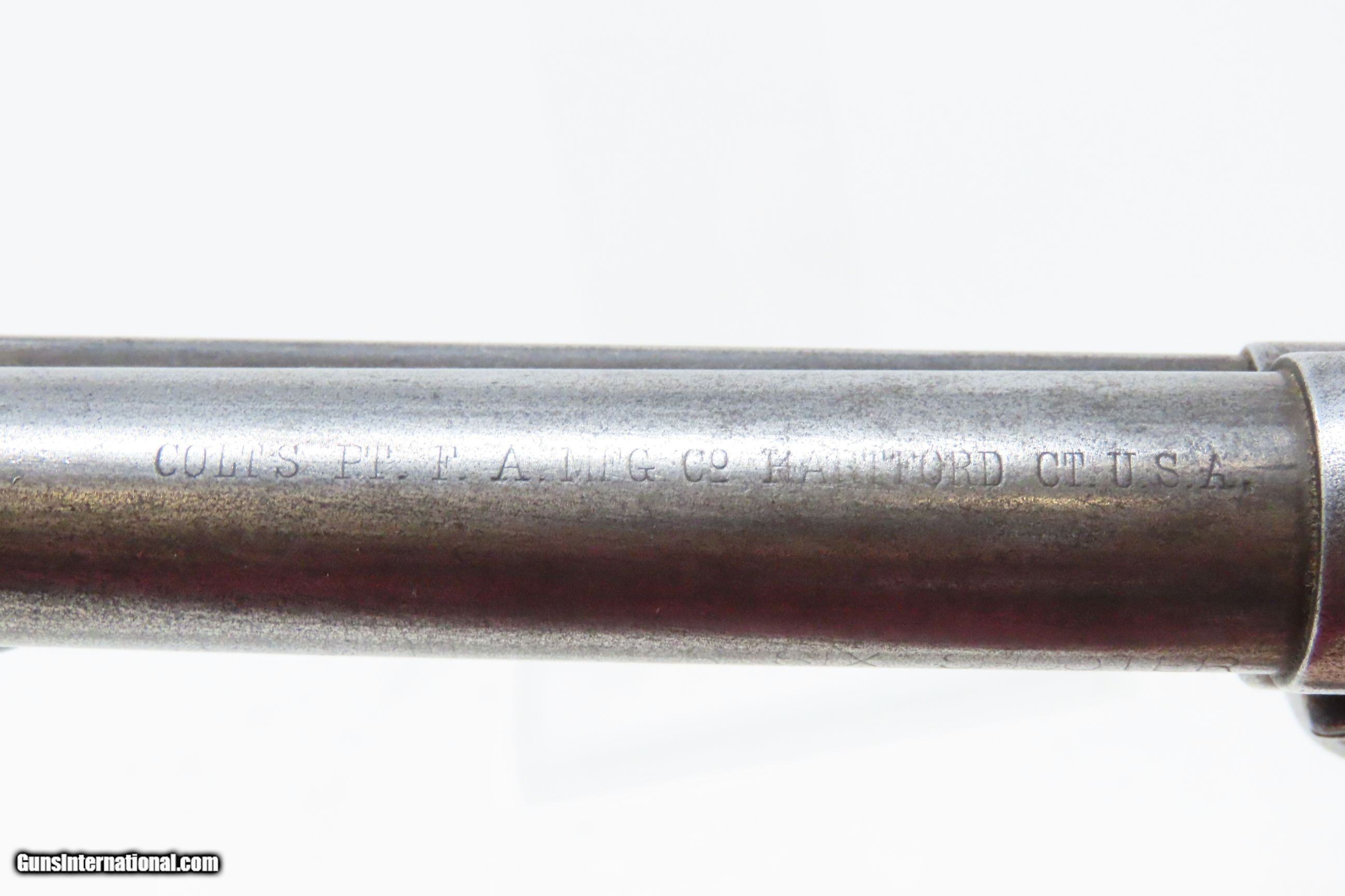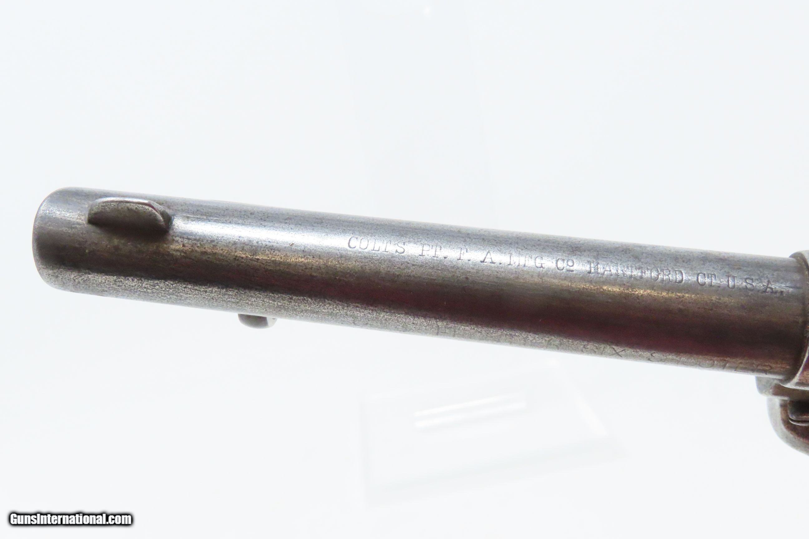 Description: 1898 SAN FRANCISCO, CA LETTER Antique COLT FRONTIER SIX-SHOOTER .44-40 SAA Colt’s .44 Caliber Single Action Army with Ivory Grips! Here we present an antique Factory Lettered Colt Model 1873 Frontier Six-Shooter Single Action Army Revolver in .44-40 WCF, manufactured in 1898 in Hartford, Connecticut. The Colt Frontier, or Frontier Six-Shooter was Colt's 1873 revolver chambered in .44-40 Winchester caliber instead of .45 so that it was compatible with Winchester’s Model 1873 ammunition. Production began in 1877. “Colt Frontier Six-Shooter” was the actual name of the Colt pistol model, and this was originally acid-etched on the left side of the barrel. Later, the legend was roll-stamped until 1919, when the caliber designation ".44-40" was added. These revolvers made excellent companions to rifles at the time as they were chambered for the same ammunition, meaning that the user only had to keep one type to feed both guns. Though Colt enjoyed the largest contracts of any handgun maker during the American Civil War, it had to rely on its array of percussion fired revolvers, namely the 1860 Army until the Smith & Wesson owned Rollin White Patent expired in 1869. This enabled them to begin making revolvers with completely bored through cylinder chambers in order to utilize modern metallic cartridge ammunition in the most effective manner. In 1869, Colt began development of a suitable cartridge revolver in earnest, first coming out with a number of conversions for their percussion lines, until 1872 when they debuted what was to become the Colt Model 1873 Single Action Army in the 1872 U.S. Trials. Needless to say, it won, and became the Army’s revolver of choice. It also became the sidearm of choice for many others like cowboys, guards, lawmen, crooks, shopkeepers and all manner of civilians. This revolver letters as you see it with the exception that the hard rubber grips have been replaced with ivories: 5 ½” barrel in .44 Winchester. It was shipped to Colt’s Patent Firearms Co. San Francisco Agency in California along with 24 others 5 February 1898. The overall condition is very good. Original gray patina throughout. The action is excellent with all cock-notches holding, all 4 clicks, and solid cylinder lockup. The bore is in very good condition: reflective with good rifling. The antique ivory grips are solid and in great shape. The numbers match. A very nice, lettered Frontier in .44 shipped to Colt’s Agency in California at the end of the 19th Century! Own the original! This is a legitimate antique and not a reproduction. Barrel is 5-1/2 inches. Caliber: .44-40 Winchester Center Fire Overall condition as seen in photos. Very Fast. Very Safe. FREE SHIPPING WORLDWIDE. Delivered directly to your door by express mail! Guaranteed AUTHENTIC & Includes CERTIFICATE OF AUTHENTICITY. ancestryguns $6400 #228323 SOLD Antique: Yes |