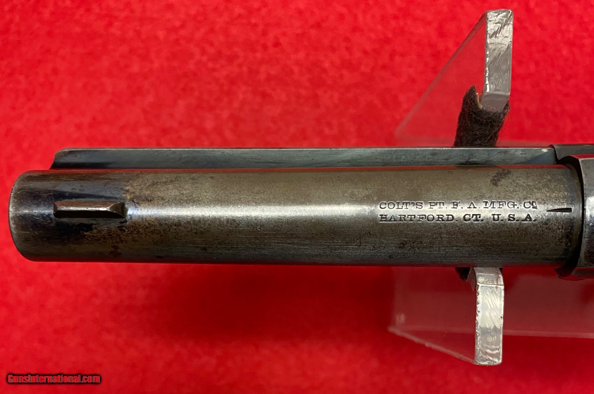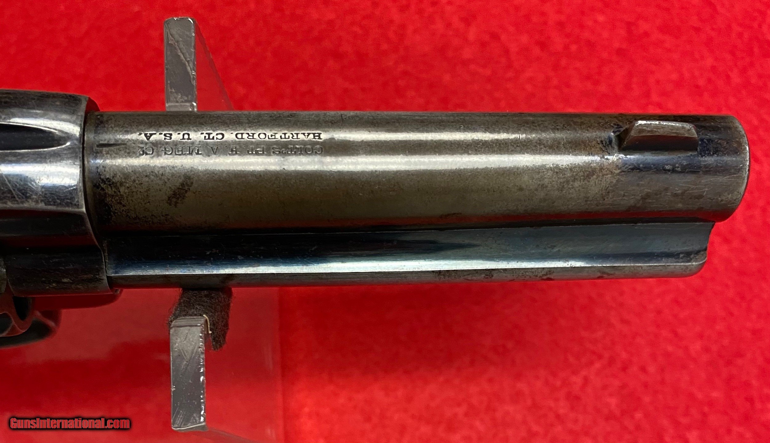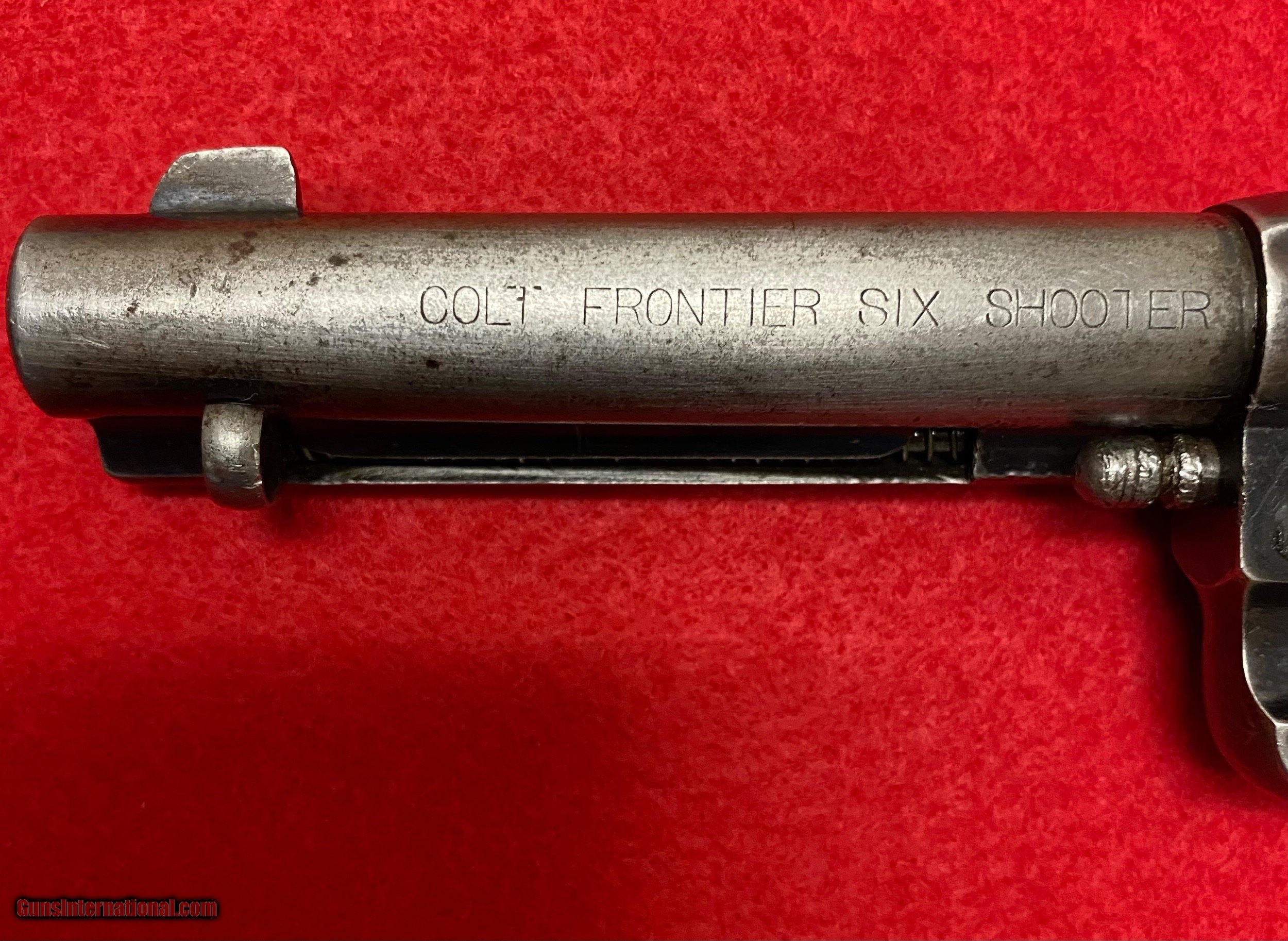 Description: Antique Colt Model 1878 Frontier D.A. Revolver .44-40 WCF with a 4 3/4" barrel. Manufactured in 1891. All matching number gun. Large trigger guard. Action functions fine only in D.A. Single action will function but does not hold the hammer when cocked. Over 50% original blue finish still present. Two line Colt address on top of barrel and COLT FRONTIER SIX SHOOTER stamped on the left side of barrel. Caliber of 44 stamped on trigger guard. Serial number 28622 on butt with 622 stamped on cylinder face. Loading gate latch screw replaced. Front sight slightly filed on the right side. Left grip has a chip missing next to the grip strap. Grips still fit well overall. Overall condition of this gun would be classified as good to very good. Nice old Colt survivor. $35.00 insured shipping. SOLD Antique: Yes Handgun Caliber: .44-40 Winchester (.44 WCF) Manufacturer: Colt Model: 1878 Serial Number: 28622 Barrel Length: 4 3/4” Chambers: Six Condition: Very good Metal Condition: Very good Bore Condition: Very good Action: D.A. Finish: Blue Sights: Fixed Manufacture Date: 1891 Item Location: WV |
