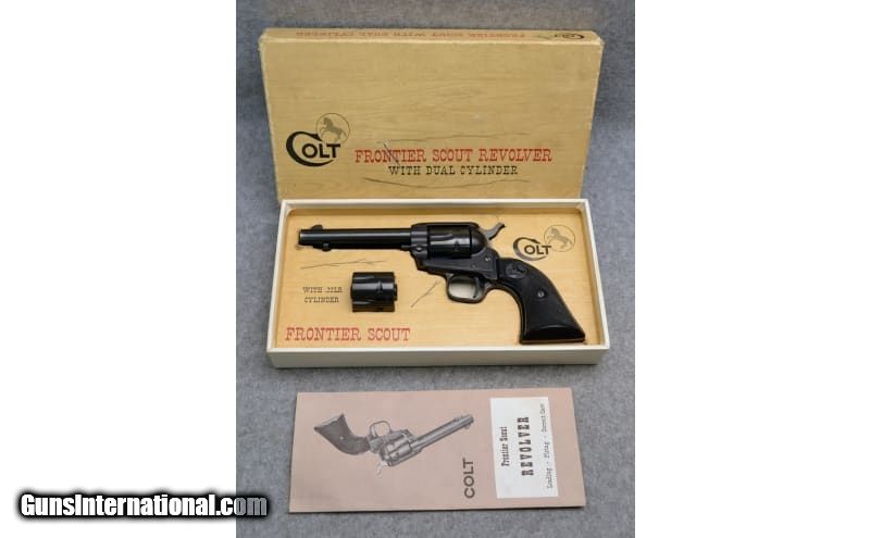 Description: This Colt Frontier Scout is a 6 shot single action revolver in .22 Long Rifle Cal. It has a 4.75 inch barrel. A blade front sight and an integral notch rear sight. The grip is a checkered hard black plastic with the Colt horse logo. Includes factory box, manual, and .22 Magnum cylinder. .22 Long Rifle SOLD Barrels: 4.75 Weight: 2 lb Item Location: christiana |
