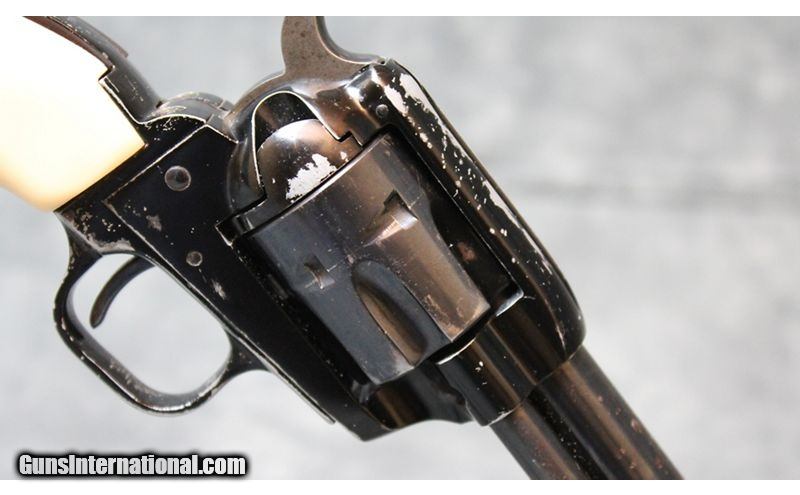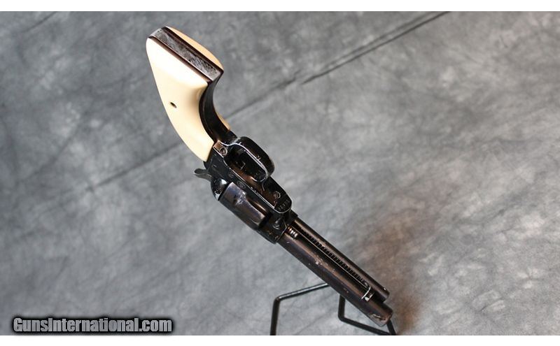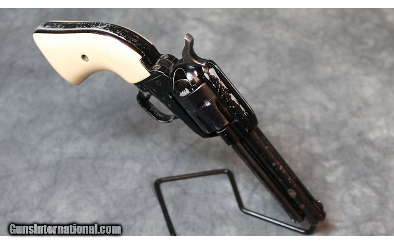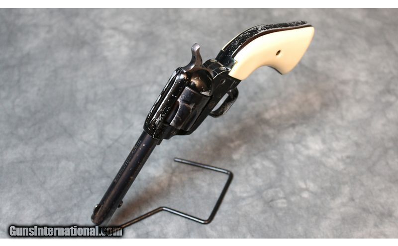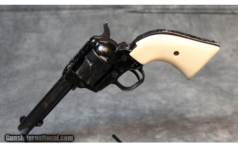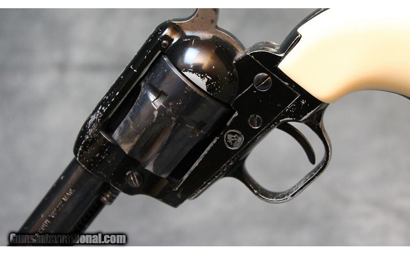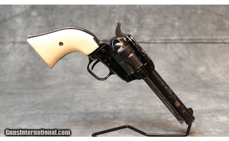 Description: The Scout line of revolvers were alloy-framed SA wheel guns designed to fire 22 rimfire ammo. Some were chambered for 22 LR; others for 22 WMR (magnum), and some made after 1964 even came with two cylinders so you could swap between the two. It enjoyed some success, but by 1970-71, the Scout line was quietly retired. The one here is a "'62" model, which naturally was introduced in 1962. Its original grips were made of Staglite. The hammer, barrel, cylinder, trigger, and most internal parts are made of steel. The frame (including the grip frame) is made of Zamac, an aluminum alloy. This one is a 22 magnum version. The left side of the frame bears the classic "Rampant Colt" logo, and on the left side of the barrel is stamped FRONTIER SCOUT '62 .22 MAG. .22 MAG SOLD Chambers: 22 Mag Metal Condition: Shows significant holster wear and loss of painted surfaces Bore Condition: Bright with crisp rifling Barrels: 4 3/4 Triggers: Single action Weight: 32 oz. Sights: Blade sight ` Item Location: Independence, MO |