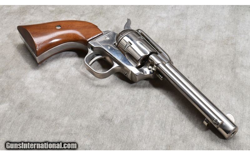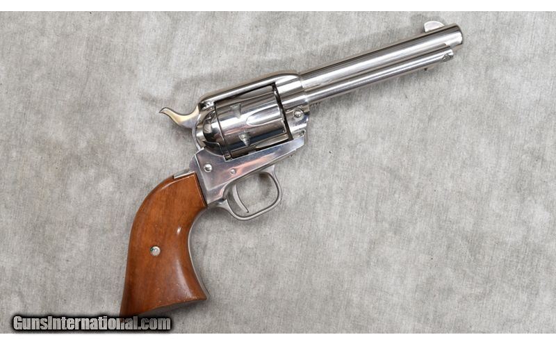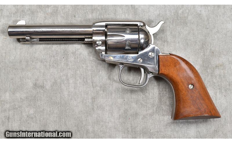 Description: This little .22 Magnum SAA features nice wooden grips, and used a bit, it doesn't show unless you look carefully. The Zanac frame is finished with high gloss nickel and all stamps are sharp and clear. It was manufactured in 1960 and has the box. .22 MAG SOLD Chambers: 6 Metal Condition: Excellent. Wood Condition: Excellent. Bore Condition: Shiny and bright. Barrels: 4-3/4 inch Triggers: Factory single action only. Butt Pad: Smooth hardwood. Weight: 30 ounces Sights: Blade and notch open sights. Item Location: Rogers |