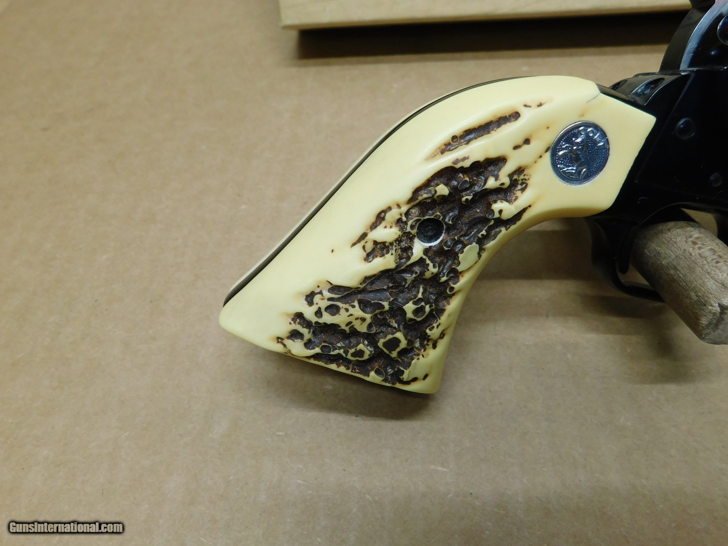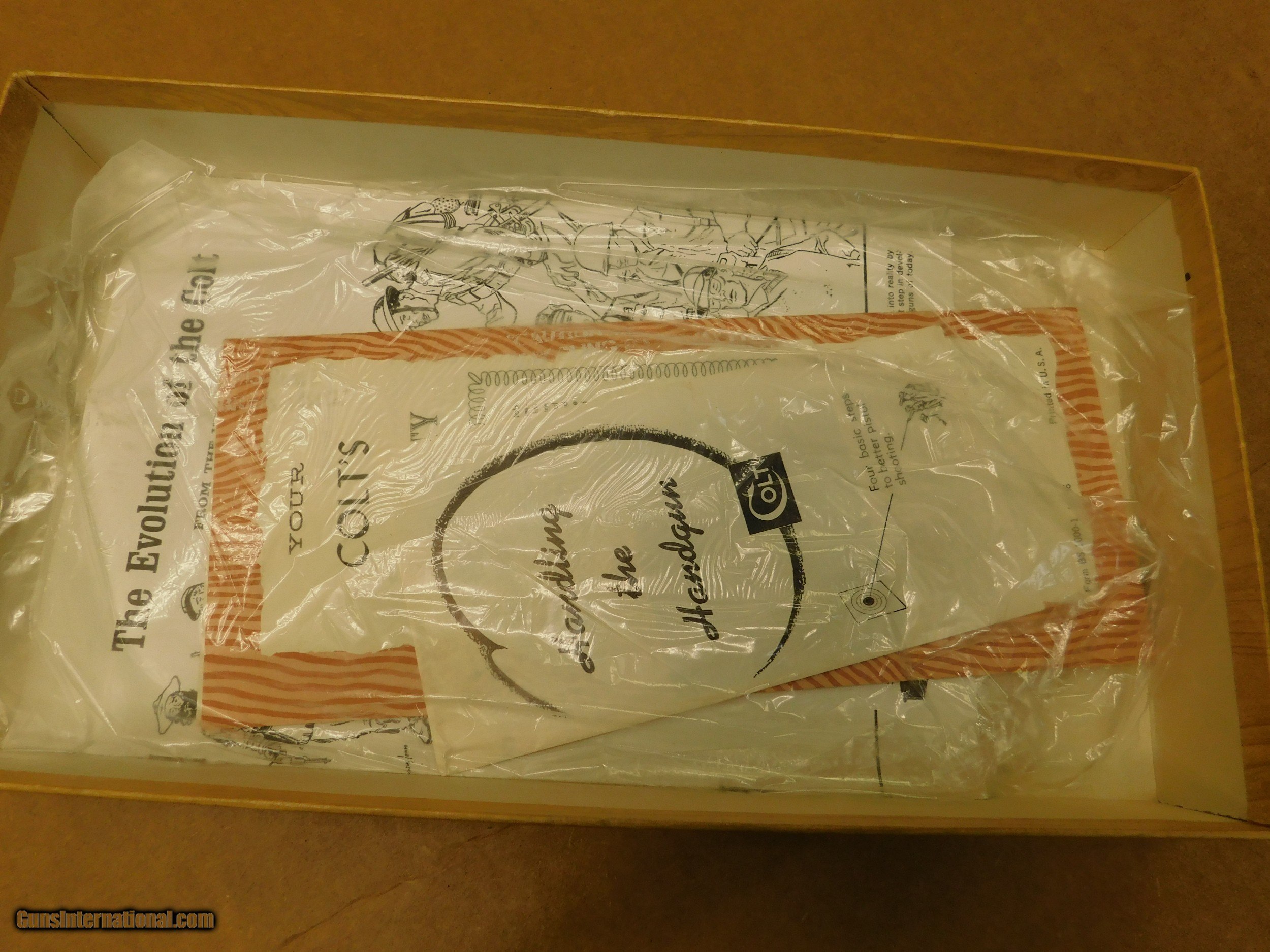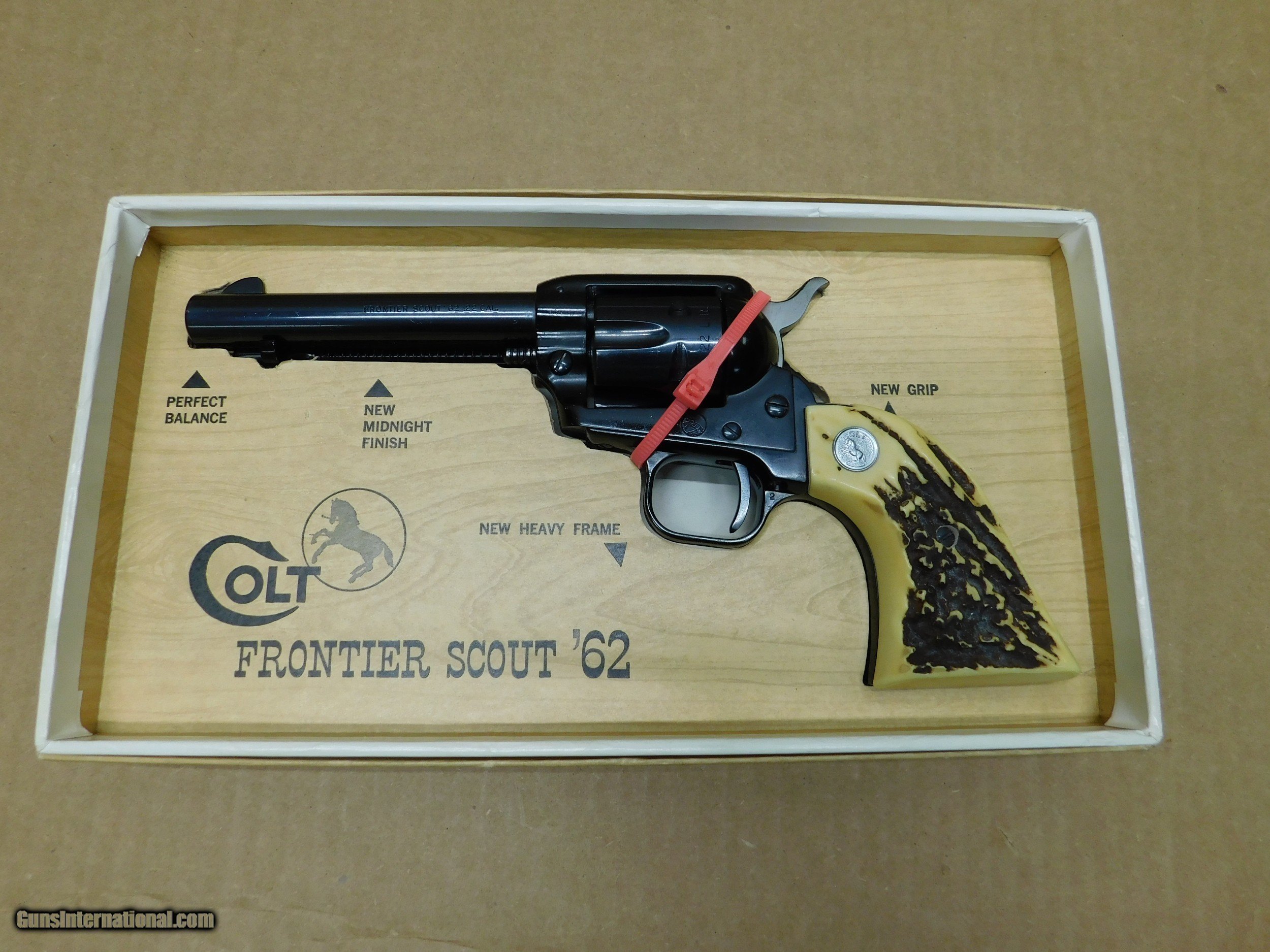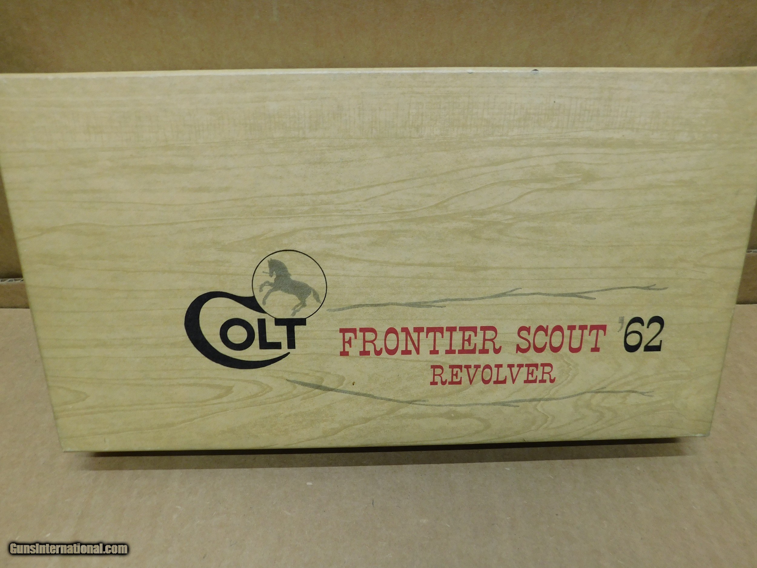 Description: This is a new in the box unfired Colt Frontier Scout 62 It is a 6 shot 22LR revolver Has a 4 3/4" midnight blue barrel Has box and paperwork Manufactured in 1962 SN-67048P SOLD Handgun Caliber: .22 Long Rifle Manufacturer: Colt Model: Frontier Scout 62 Serial Number: 67048P Barrel Length: 4 3/4 Condition: New Metal Condition: Excellent Bore Condition: Excellent Barrels: Midnight Blue Finish: Blue Sights: Open Manufacture Date: 1962 Extras: Box and paperwork |