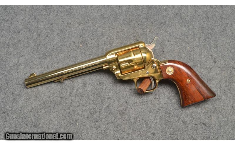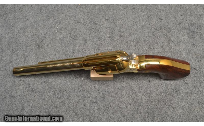 Description: This single action revolver is a Colt Frontier Scout California Bicentennial commemorative chambered for .22 Long rifle. This pistol features gold-plated hardware with a nickel plated hammer, trigger, and frame screws, and 2 piece walnut grips. This revolver is in overall very good condition, with light display wear. Comes with California Bicentennial display case. .22 Long Rifle SOLD Metal Condition: Overall very good condition Wood Condition: Overall very good condition Bore Condition: "Bright and shiny, crisp rifling Barrels: 6in Fore End: Smooth walnut grips Weight: 2 lbs Sights: "Groove rear sight, blade front sight Item Location: Wichita, KS |