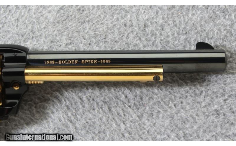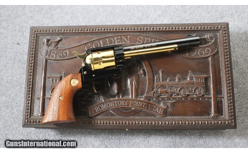 Description: This Colt Frontier Scout .22 Single Action Revolver commemorates the completion of the continental railroad with the driving of the Golden Spike at Promontory Point, Utah on May 10, 1869. This revolver comes with its original display case and replica golden spike. Manufactured in 1969. .22 Long Rifle SOLD Metal Condition: Excellent with light turn line on the cylinder Bore Condition: Excellent Barrels: 6 inch barrel Triggers: Single action Weight: 34 oz. Sights: Square notch rear sight with blade front Item Location: Lehi, UT |