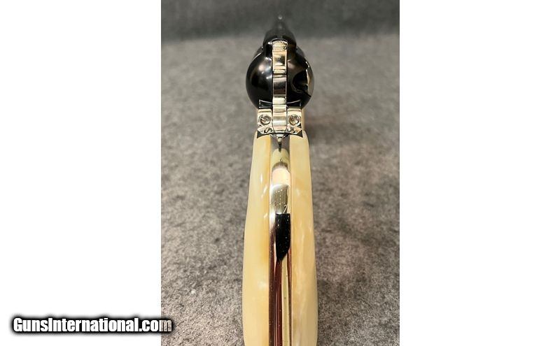 Description: This 1969 revolver is a Colt Single Action Frontier Scout Lawman Series (Wild Bill Hickok) chambered in .22 LR. (3rd gun in Lawman Series of 4) It has faux-pearl grips, a six inch blued barrel, a nickel plated 6 shot cylinder, a blade front sight and an integral notch rear sight. This highly collectible Colt revolver is in immaculate condition. Comes with velvet lined hinged display box. .22 Long Rifle SOLD Chambers: Six round cylinder Metal Condition: Metal is in immaculate condition Bore Condition: Bright and shiny Barrels: 6 inch barrel Triggers: Nickel plated trigger Stock Dimensions: 11½ inches overall Butt Pad: Faux-pearl grips Weight: 2 lb 0 oz Sights: "Fixed blade front sight, Item Location: Wichita, KS |
