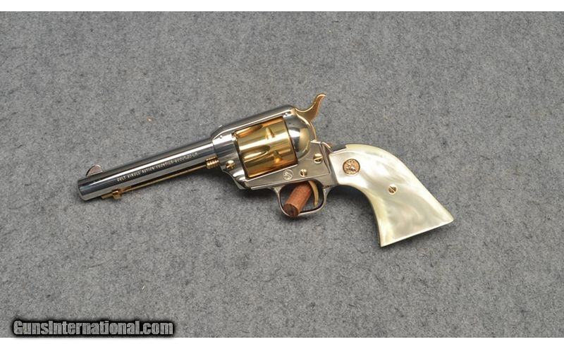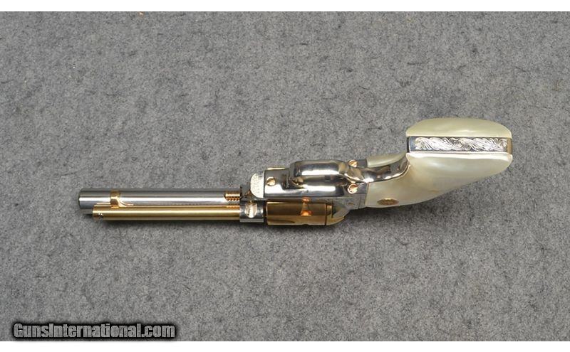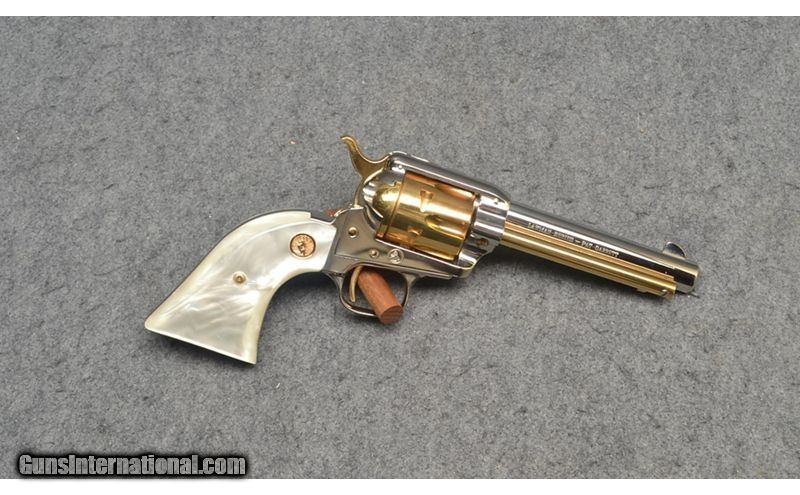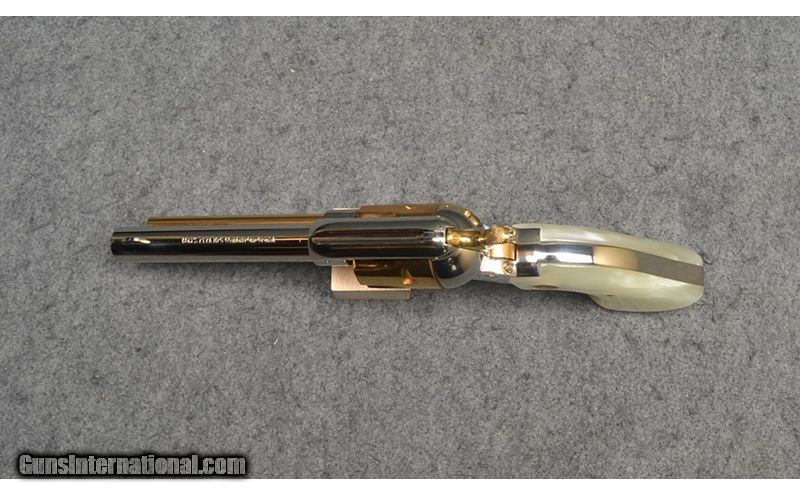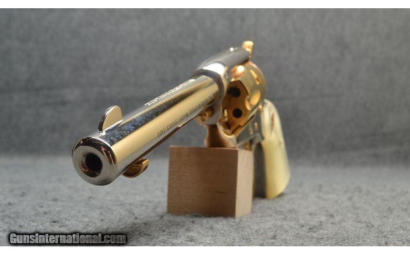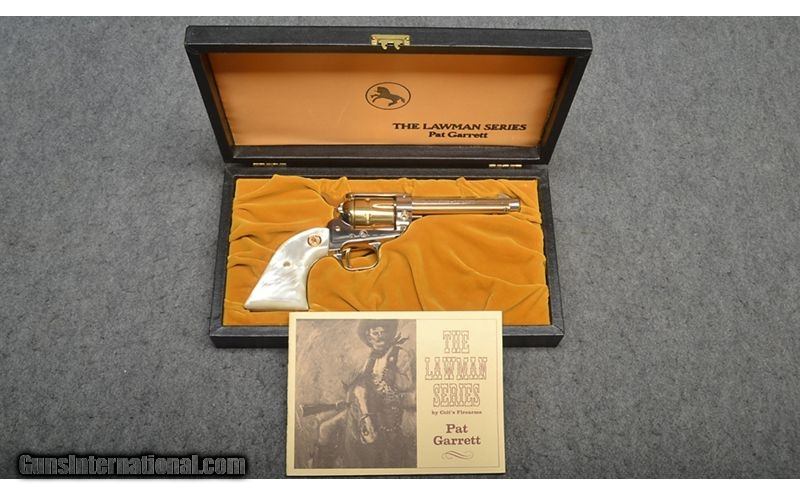 Description: This single action revolver is a Colt Frontier Scout Pat Garrett model from their lawman series, chambered for .22 Long rifle. This revolver features faux mother-of-pearl grips, nickle plated frame, trigger guard and back strap, and barrel, and gold-plated cylinder, ejector rod housing, base pin and screws, hammer, and trigger. This pistol is in overall very good shape, with light display wear. Comes with Colt Pat Garrett Lawman series display case with Pat Garrett history booklet. .22 Long Rifle SOLD Metal Condition: Overall very good condition Wood Condition: Overall very good condition Bore Condition: "Bright and shiny, crisp rifling Barrels: 4 3/4in Fore End: Faux-pearl grips Weight: 2 lbs Sights: "Groove rear sight, blade front sight Item Location: Wichita, KS |