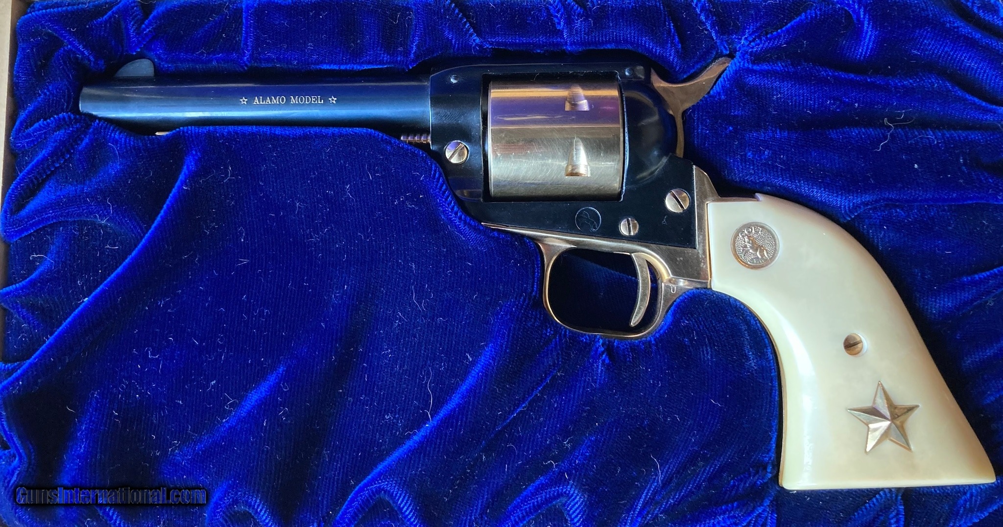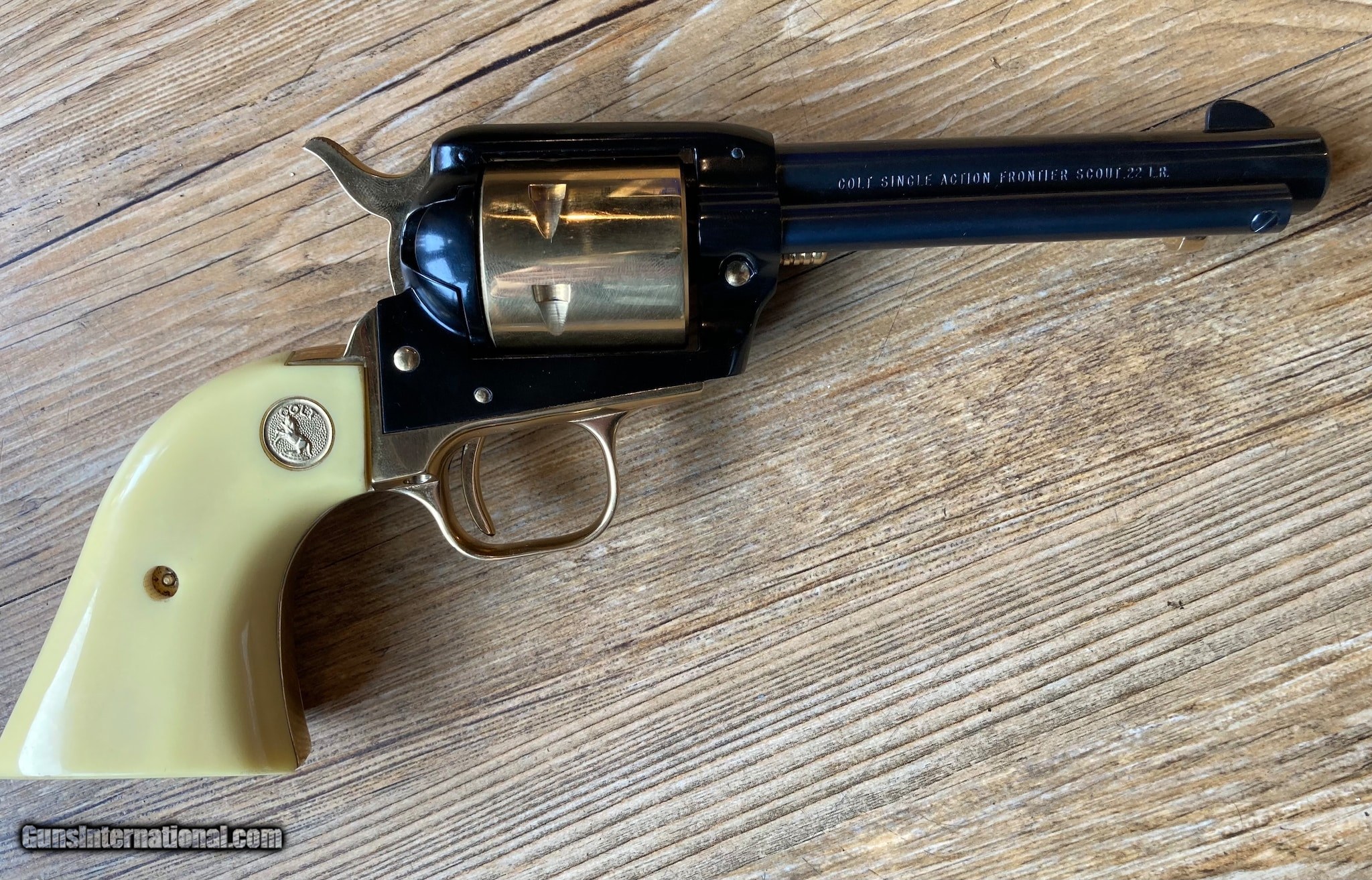 Description: Guns Listing ID: 489714 Colt New Frontier Scout .22lr Alamo Model. Comes with original blue velvet fitted display box with a Alamo battle scene on the top. The gun appears to be unfired. There is only a faint turn-ring on the cylinder, it‚‚s barely visible unless you‚‚re trying to find i SOLD Manufacturer: COLT Model: FRONTIER SCOUT Caliber Info: .22LR Condition: Used - Non-Certified Barrels: 4.75 BARREL Finish: BLACK AND GOLD |