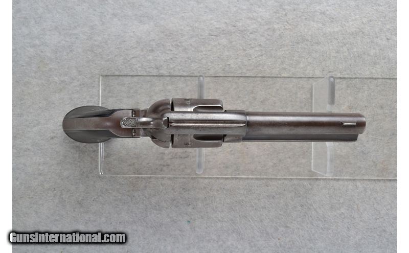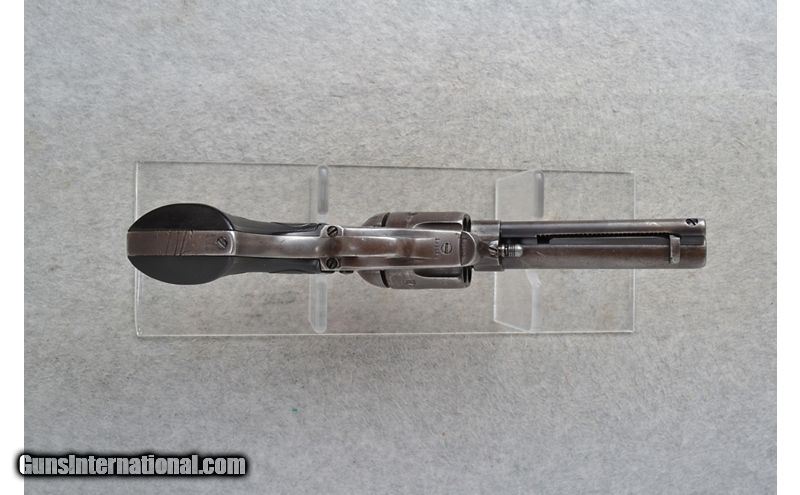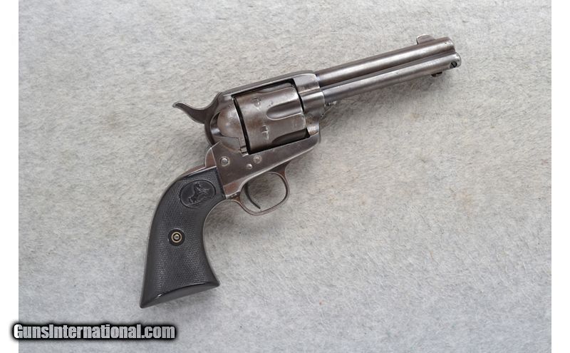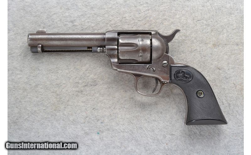 Description: This Colt Model Frontier Six Shooter is a 6 shot single action revolver in .44-40 WCF Cal. It has a 4 5/8 inch barrel. A blade front sight and an integral notch rear sight. The grip is a checkered hard black plastic with the Colt horse logo. The hammer spur is checkered. Serial Number 153428. .44-40 Winchester SOLD Chambers: 6 shot fluted cylinder. Metal Condition: Good. Has patina and minor freckling. Handling marks on the butt frame. Bore Condition: Good. Minor pitting. Barrels: 4 5/8 inch. Triggers: Single action. Weight: 38 oz. Sights: Blade front. Integral notch rear. Item Location: Richfield, WI |