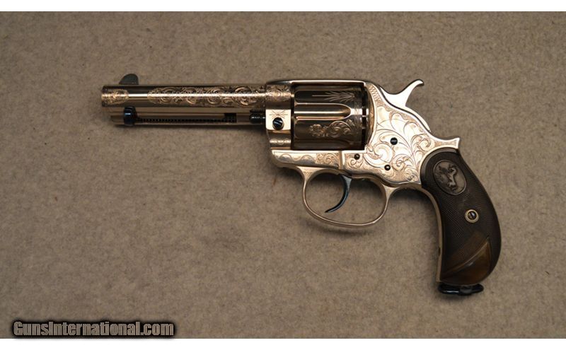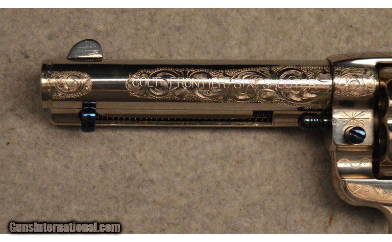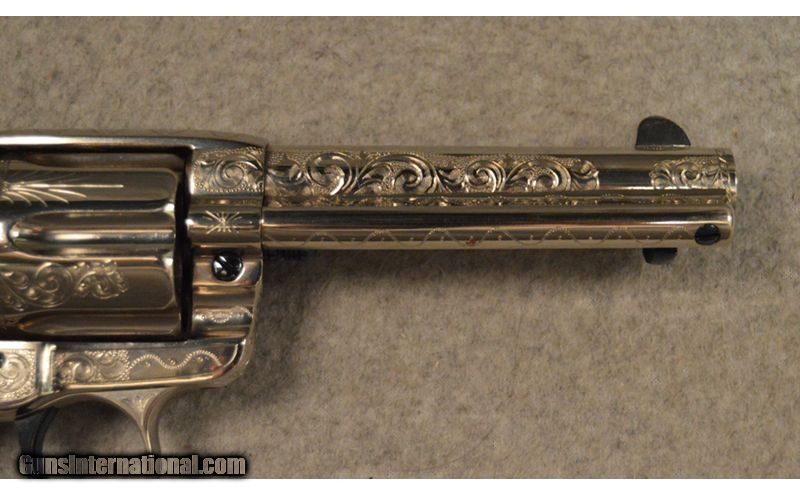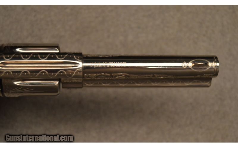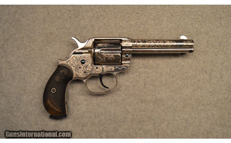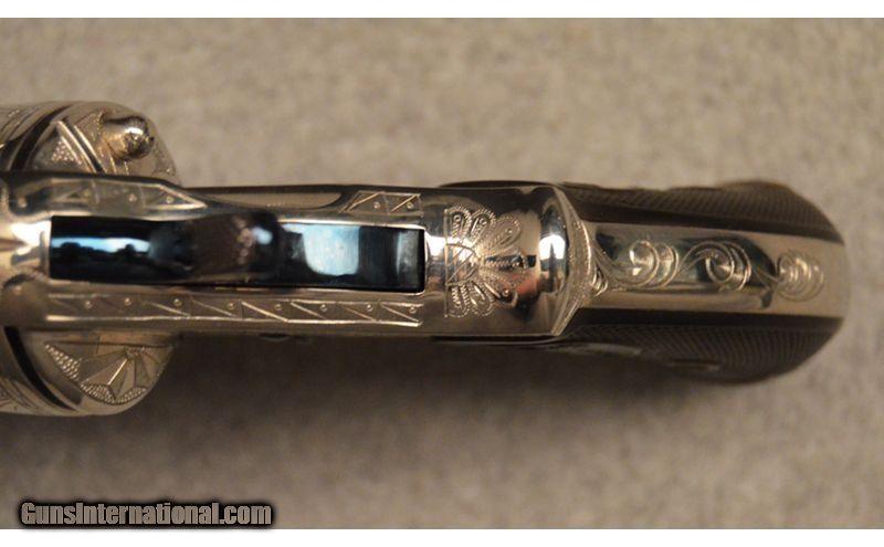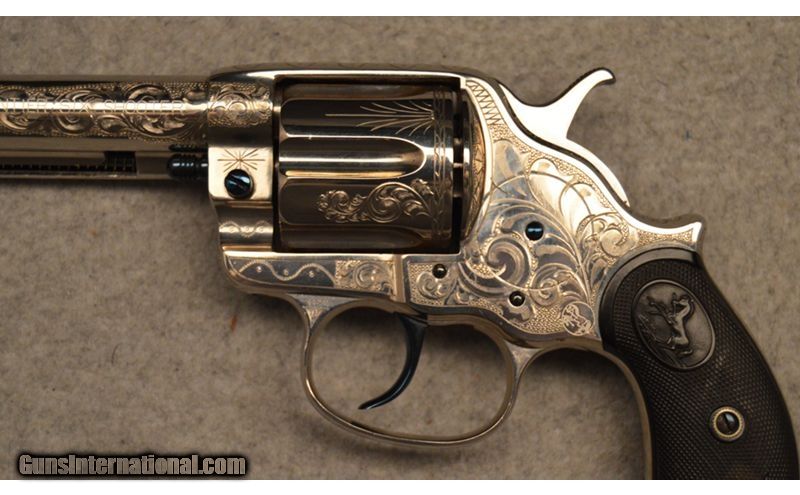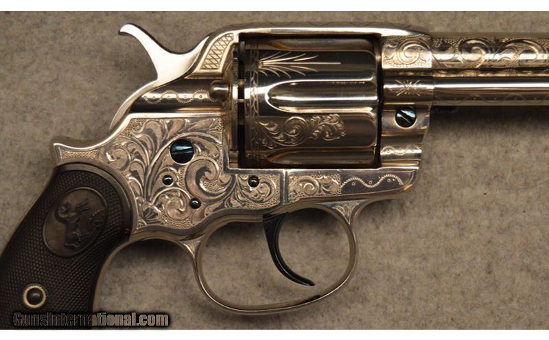 Description: Colt manufactured in 1898 Frontier Six Shooter .44 WCF. Engraved in Helfricht style, nickle with fire blue appointments. Wonderfully executed engravings but unknown engraver. .44-40 Winchester SOLD Antique: Yes Metal Condition: Very good condition with Intricate engravings Barrels: 4 3/4" Original Butt Pad: Factory Item Location: Fort Worth, TX |
